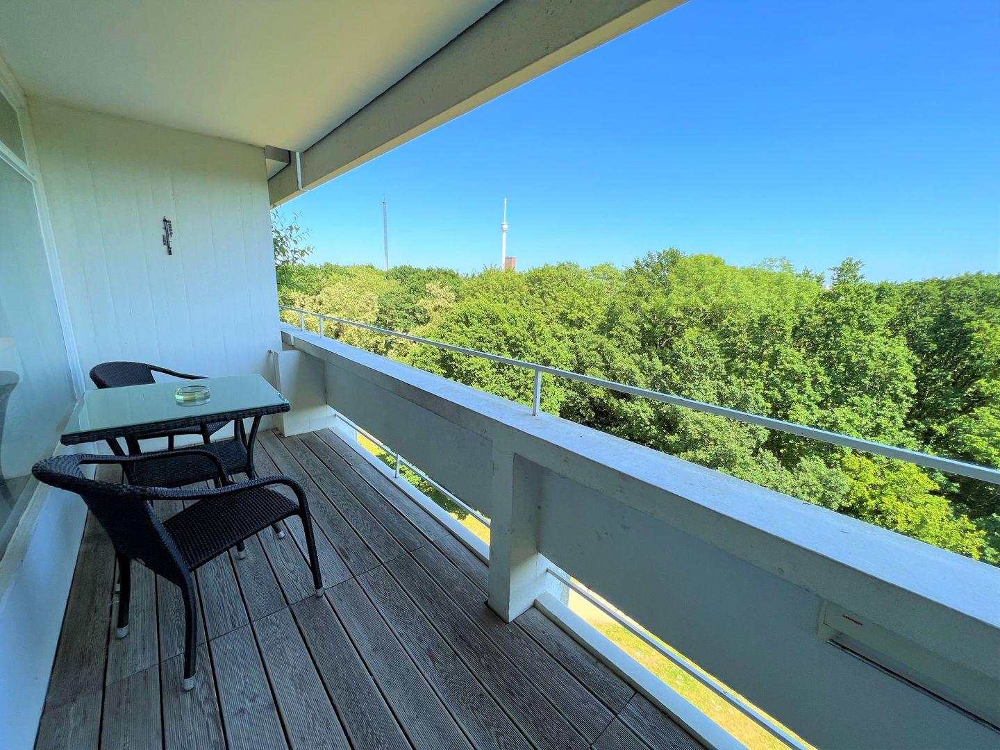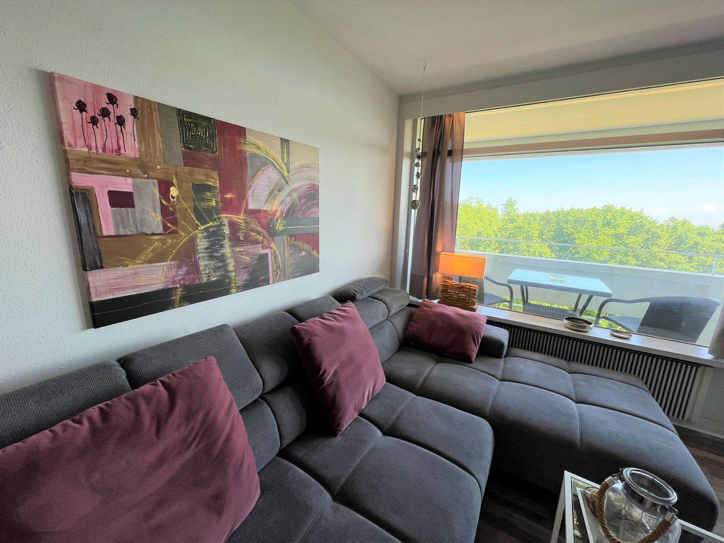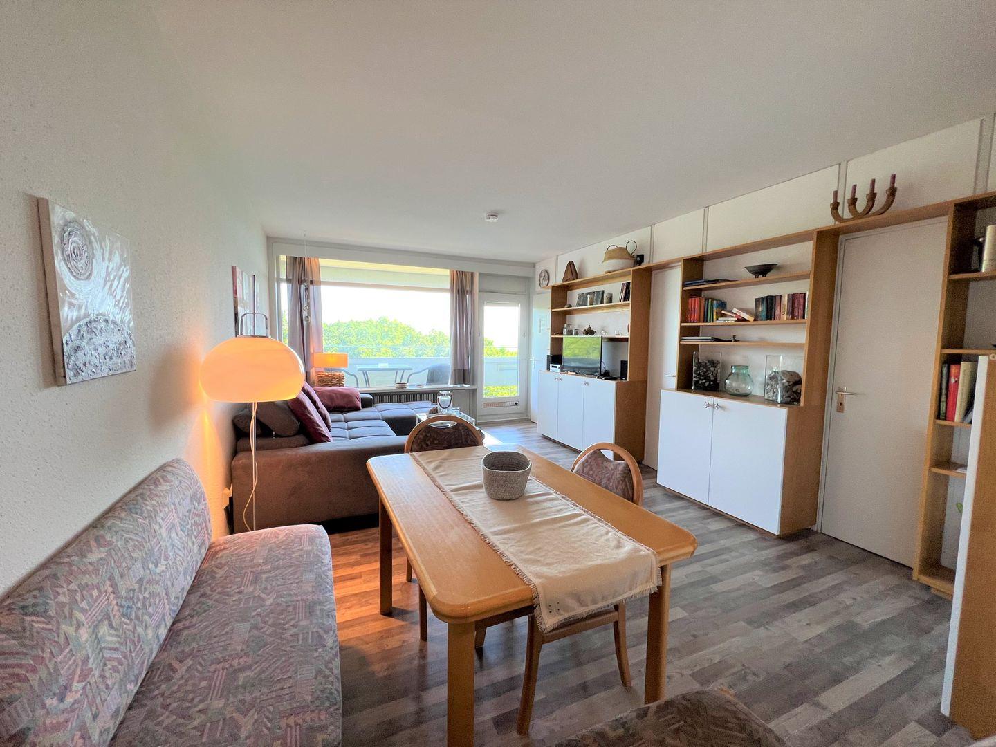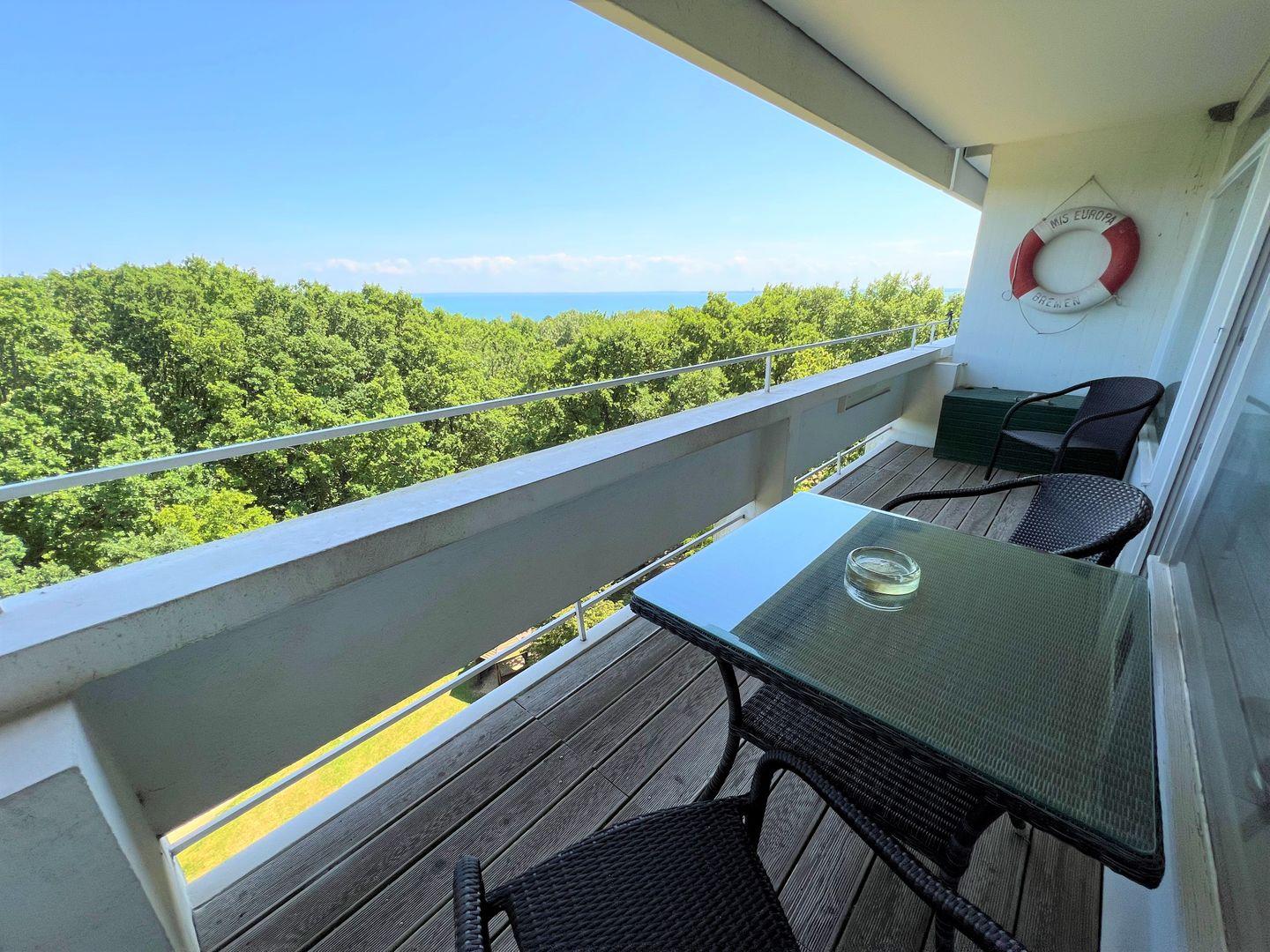 Die 3-Raum-Wohnung liegt in der 5. Etage und hat einen Balkon in Ostlage. Dieser bietet über die Bäume einen schönen Blick auf die Ostsee. Die mit Spülmaschine, Backofen und Herd ausgestattete Küche ist in den kombinierten Wohn- und Essbereich mit einer Durchreiche hin offen. Im 1. Schlafraum steht ein Doppelbett, der 2. Schlafraum ist innenliegend und mit zwei Einzelbetten ausgestattet. Das Wannenbad ist innenliegend. WLAN wird geboten. Die Nutzung des Schwimmbads in der Anlage ist inklusive.