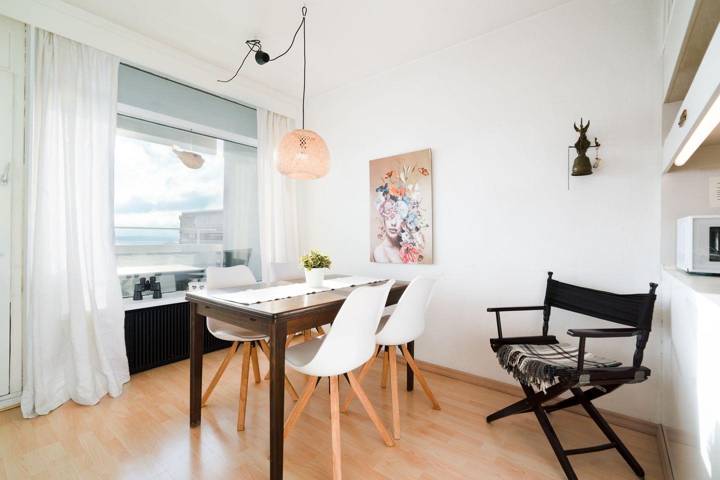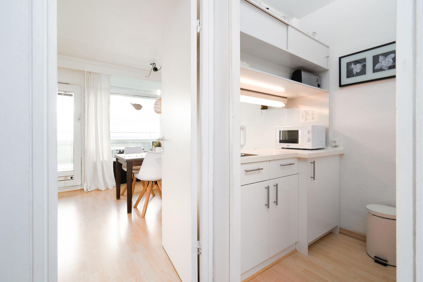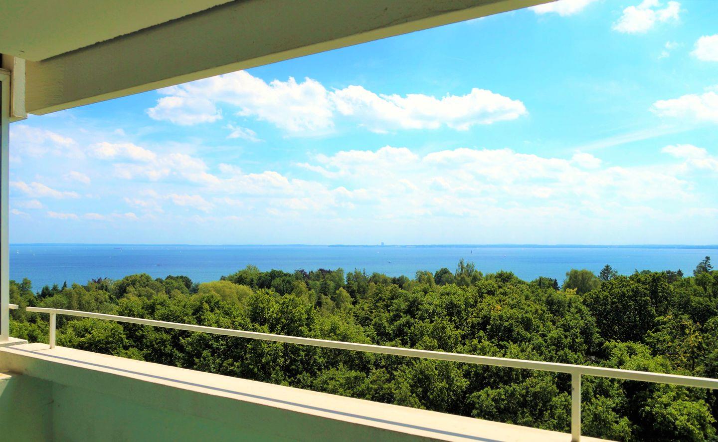 Die 2-Raum-Ferienwohnung liegt in der 6. Etage mit Balkon und traumhaften Blick über die Lübecker Bucht. Die mit Spülmaschine ausgestattete Küche ist zum kombinierten Wohn- und Essbereich mit einer Durchreiche hin offen. Im innenliegenden Schlafzimmer steht ein Doppelbett. Auf der Schlafcouch im Wohnraum ist Platz für eine weitere Person. Das Duschbad ist ebenfalls innenliegend. Die Nutzung des Schwimmbads in der Anlage ist inklusive.