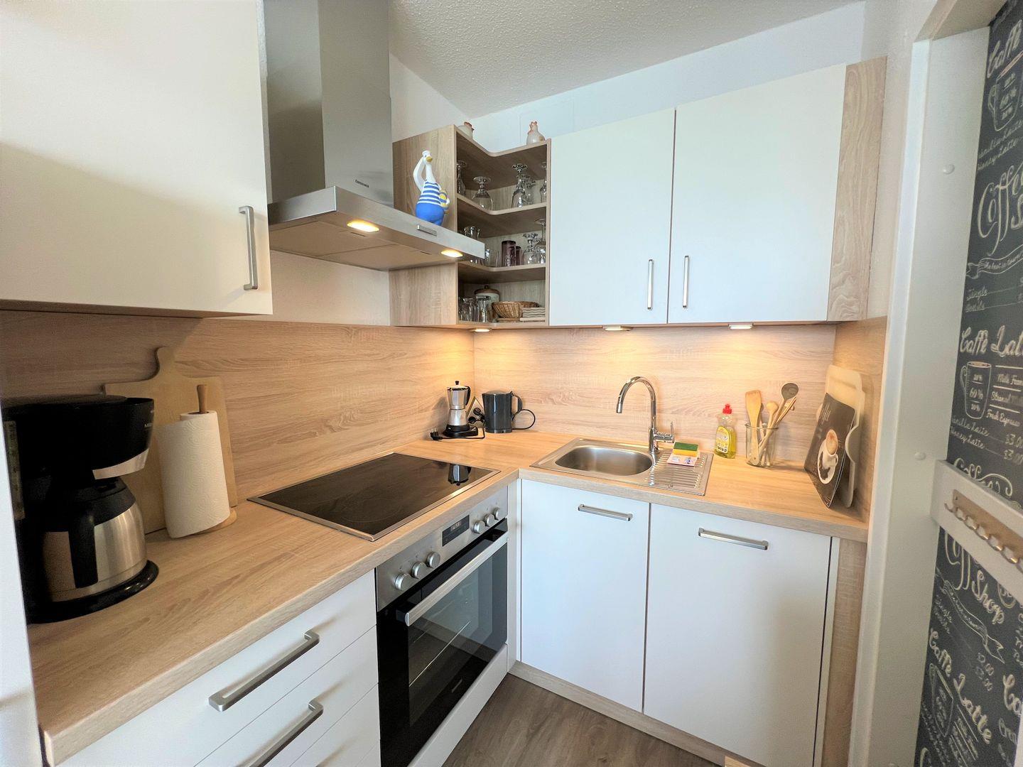 Die 2-Raum-Nichtraucher-Wohnung befindet sich in der 12. Etage mit Balkon in Süd-Ost-Lage und schönem Ostseeblick. Die mit Spülmaschine, Herd und Backofen ausgestattete Küche ist zum kombinierten Wohn- und Essbereich offen. Im Schlafraum stehen zwei getrennte Einzelbetten, die man nicht zusammenschieben kann. Im Wohnraum gibt es ein Sofa mit Schlaffunktion. Das moderne Duschbad hat ein Oberlicht zum Lüften. Der Strand ist fußläufig in max. 5 Min. zu erreichen.