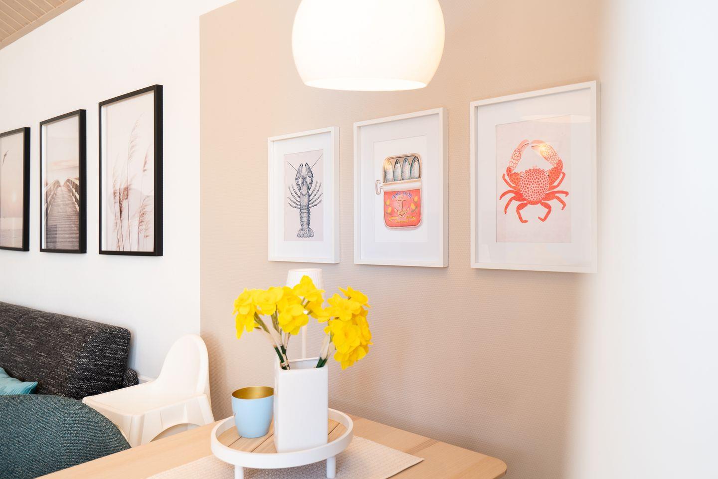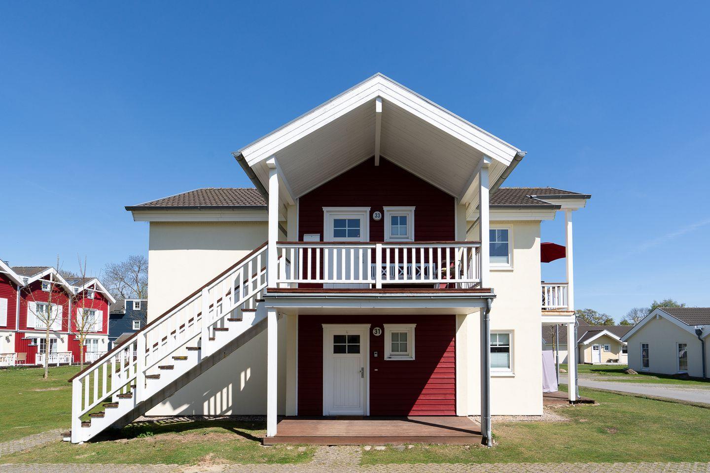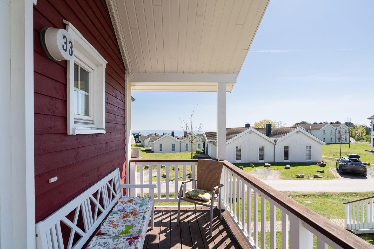 Die schöne Ferienwohnung „Brigantine“ Nr. 33 liegt in der 1. Etage eines Quattrobungalows mit separatem Eingang. Vom Wohn- und Essraum mit Kamin haben Sie Zugang zum Balkon. Hier haben Sie über die anderen Häuser hinweg Blick auf die Ostsee. Die offene Küche ist mit Spülmaschine, Backofen und Herd ausgestattet, zudem steht eine Waschmaschine zur Verfügung. Der 1. Schlafraum hat ein Doppelbett, im 2. stehen zwei Einzelbetten. Das Bad ist mit Badewanne und Sauna ausgestattet. WLAN inklusive.