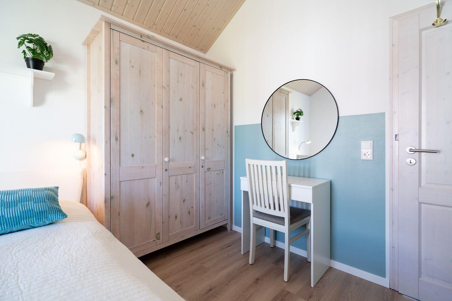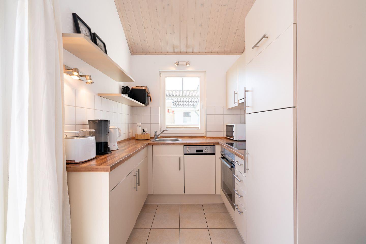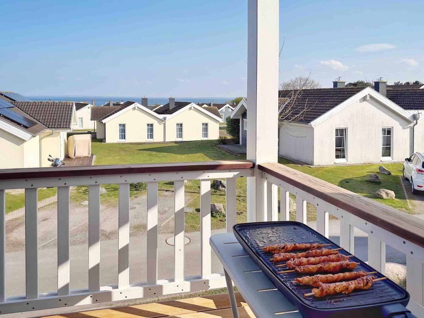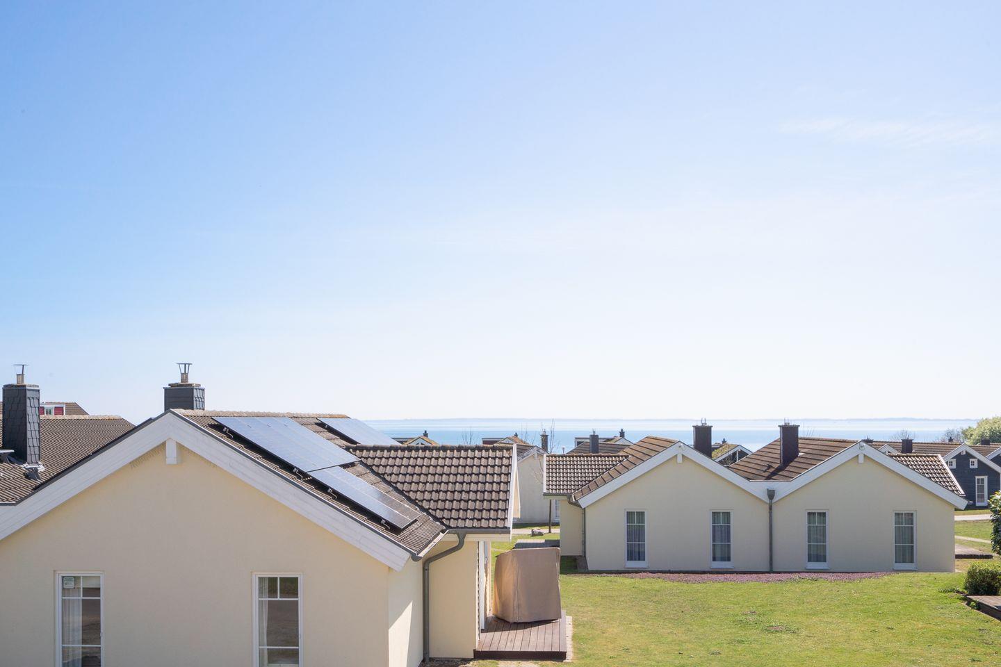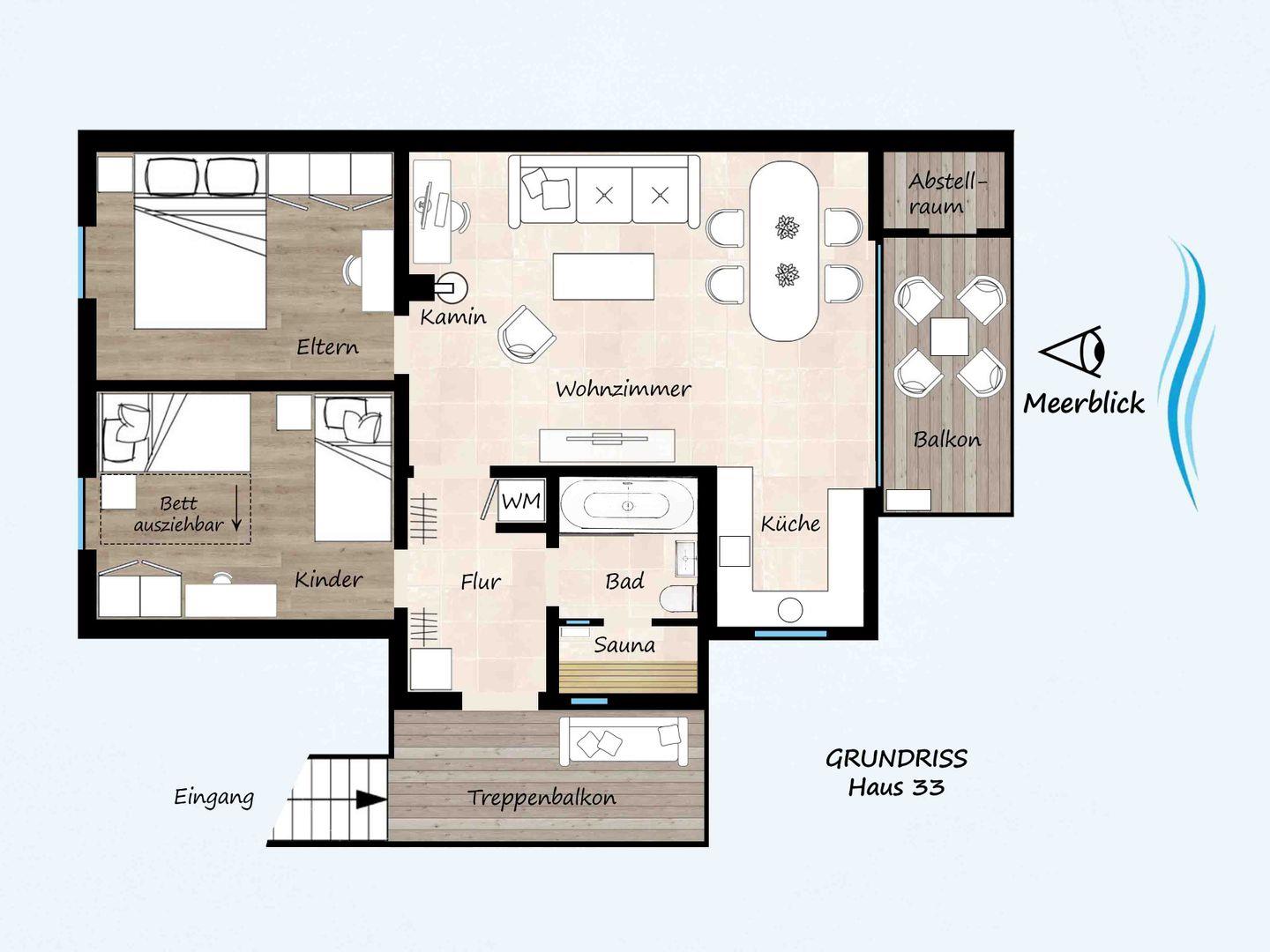 Die schöne Ferienwohnung Typ "Brigantine" liegt in der 1. Etage mit Balkon. Auf 70 qm stehen Ihnen zwei Schlafräume einmal mit Doppelbett (2x 80 x 200 cm) und einmal mit zwei getrennten Betten (jeweils 90 x 200 cm), ein geräumiger Wohn- und Essraum mit Kamin und Zugang zum Balkon zur Verfügung. Der Holzkamin sorgt für gemütliche Stunden mit Freunden und Familie. Vom Balkon haben Sie auch Meerblick über die anderen Häuser hinweg. Das Bad ist mit Wanne und Sauna ausgestattet. Der Komfort einer eigenen Sauna wird sehr von unseren Wintergästen geschätzt. Die zum Wohn- und Essbereich offene Küche ist mit Geschirrspülmaschine, Herd und Backofen gut ausgestattet. Eine eigene Waschmaschine gehört ebenfalls zur Ausstattung. Die Beheizung erfolgt über Elektroheizungen und den Kamin.
