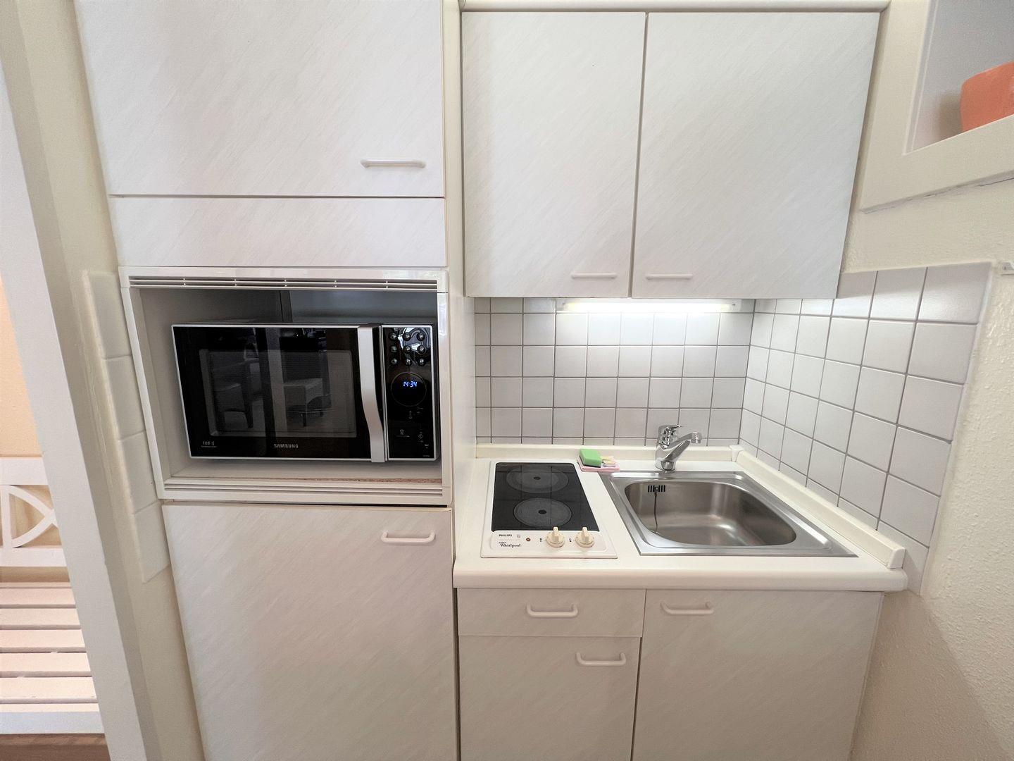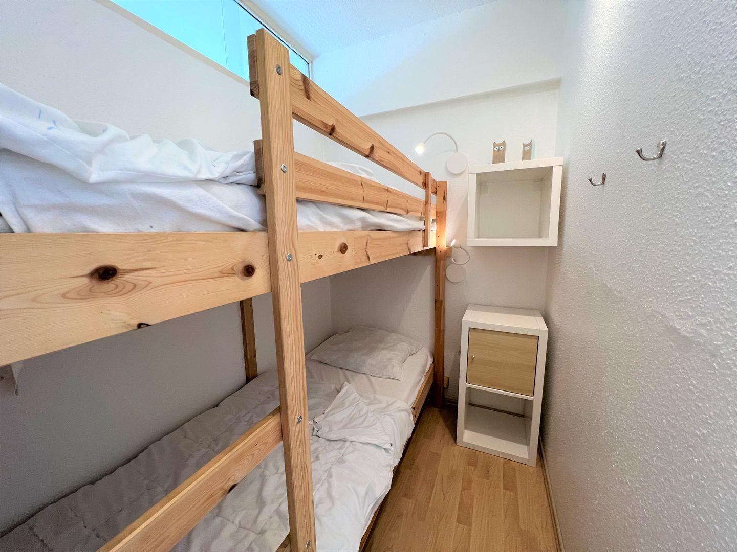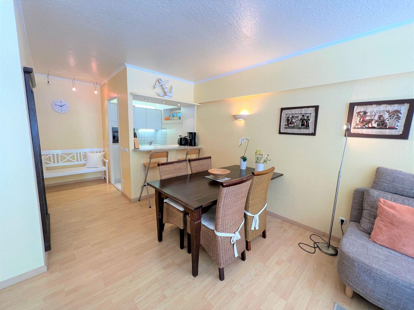 Die 3-Raum-Ferienwohnung liegt in der 2. Etage und hat eine Terrasse in Ostlage mit Blick ins Grüne. Die kleine Küche hat eine Durchreiche zum kombinierten Wohn- und Essbereich. Im ersten innenliegenden Schlafraum steht ein Doppelbett. Im zweiten, ebenfalls innenliegenden, Schlafraum steht ein Etagenbett. Auch das Duschbad ist innenliegend. Die Nutzung des Schwimmbads in der Anlage ist inklusive. Zum Strand sind es nur wenige Gehminuten.