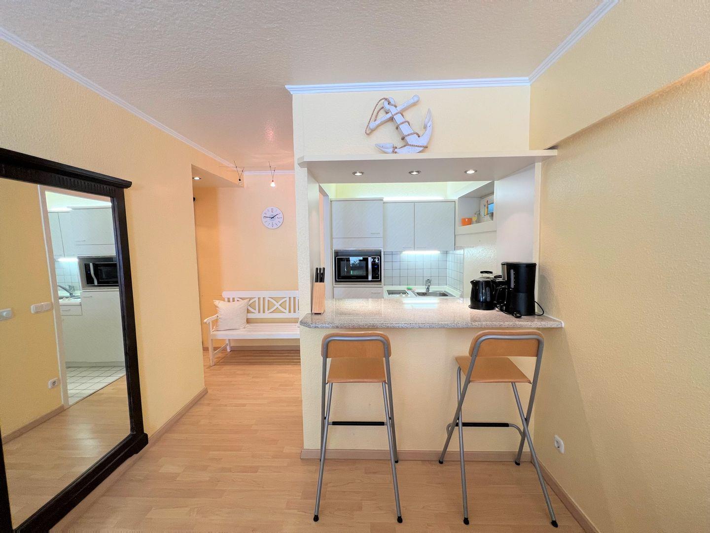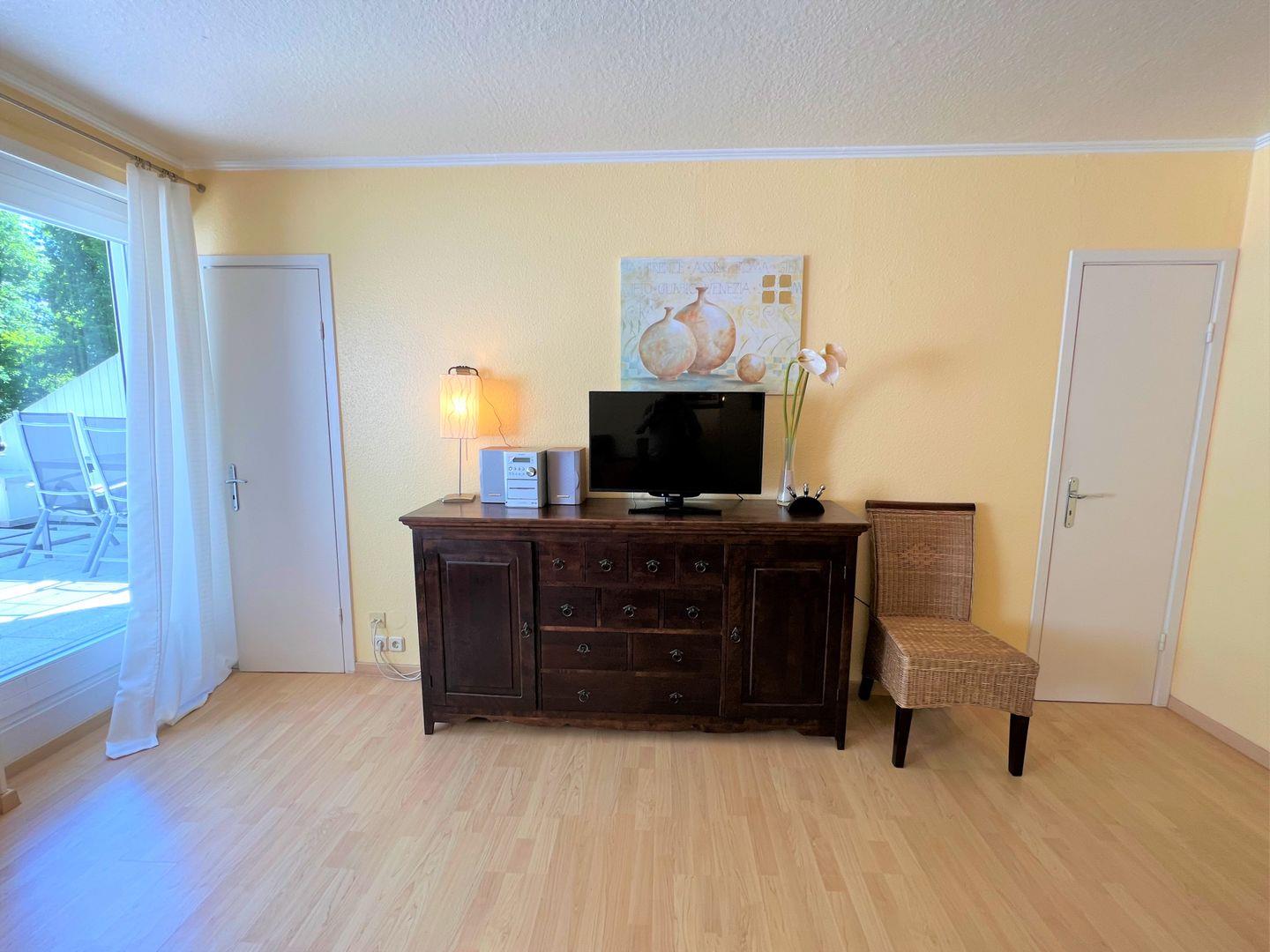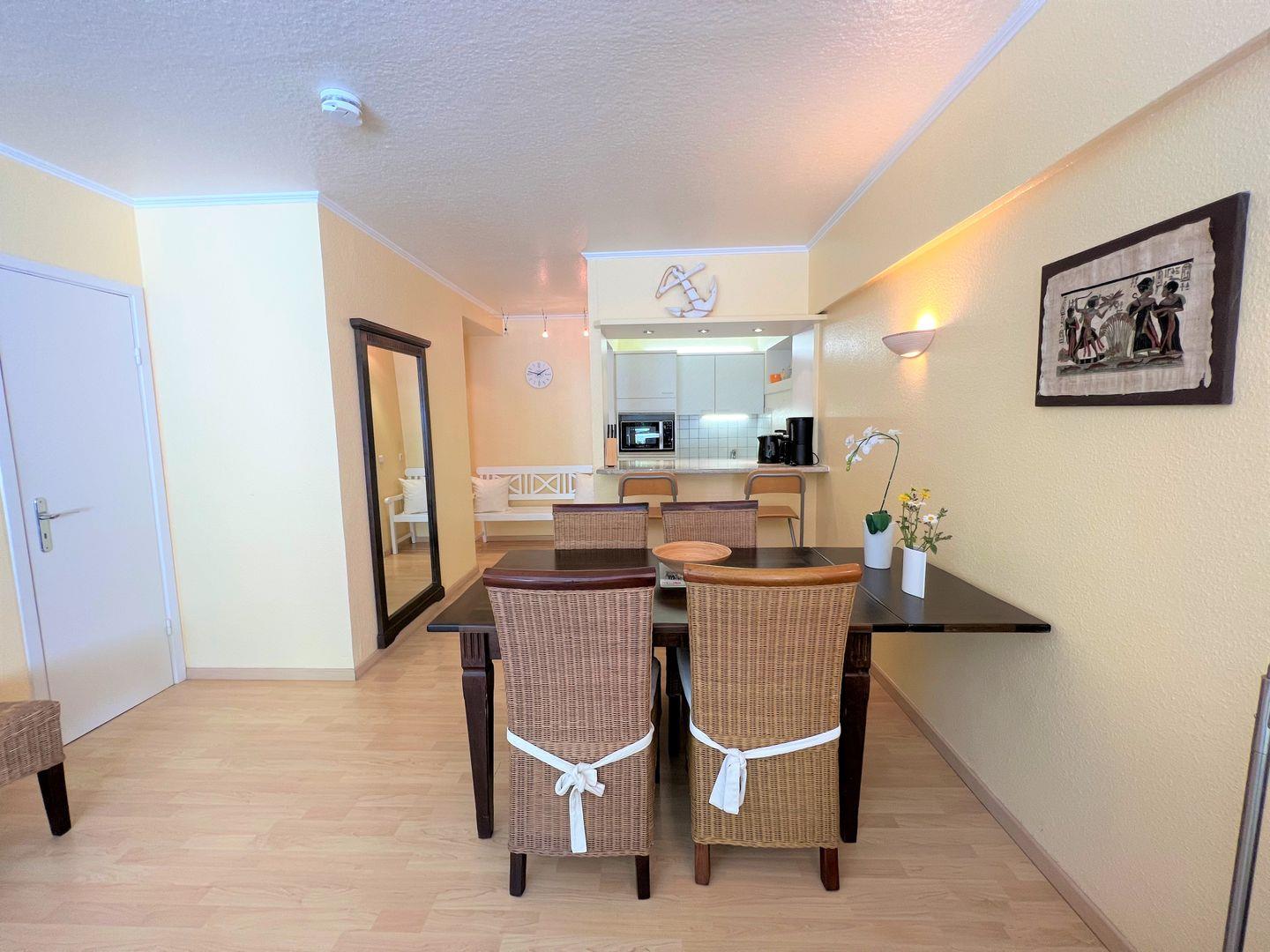 Die Wohnung liegt in der 2. Etage und hat eine große Terrasse in Ostlage mit Blick ins Grüne. Unterschiedliche Sitzmöglichkeiten laden zum Verweilen und Entspannen ein. Die kleine Küche ist mit zwei Herdplatten und Mikrowelle ausgestattet und hat eine Durchreiche zum kombinierten Ess- und Wohnbereich. Im ersten Schlafraum steht ein Doppelbett (2x 90 cm x 200 cm), im zweiten eine Etagenbett (jeweils 90 cm x 200 cm). Beide Schlafräume sind innenliegend. Das Badezimmer ist mit einer Dusche ausgestattet. Um in die Wohnung zu gelangen muss man eine Treppe hinuntergehen. PKW-Stellplatz inklusive. Zum Strand sind es nur wenige Gehminuten.