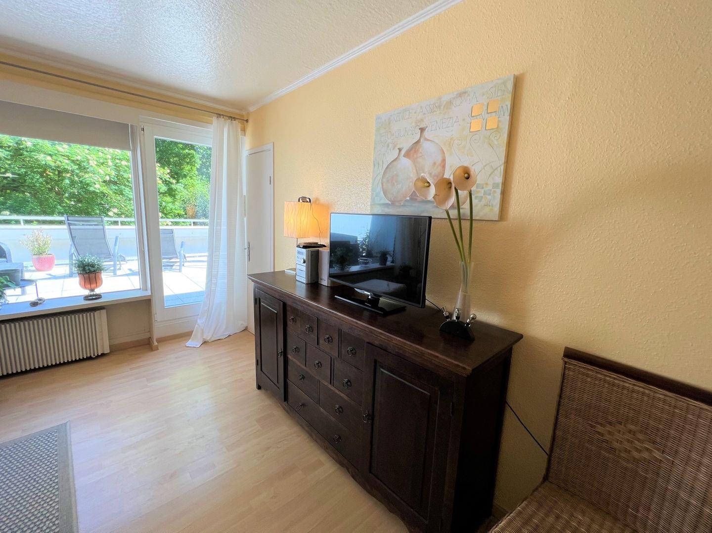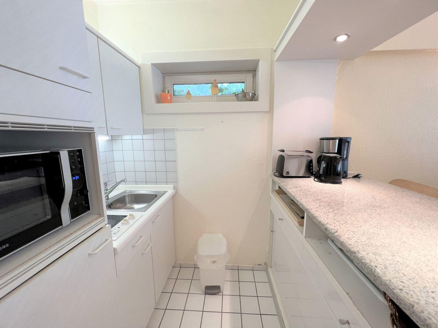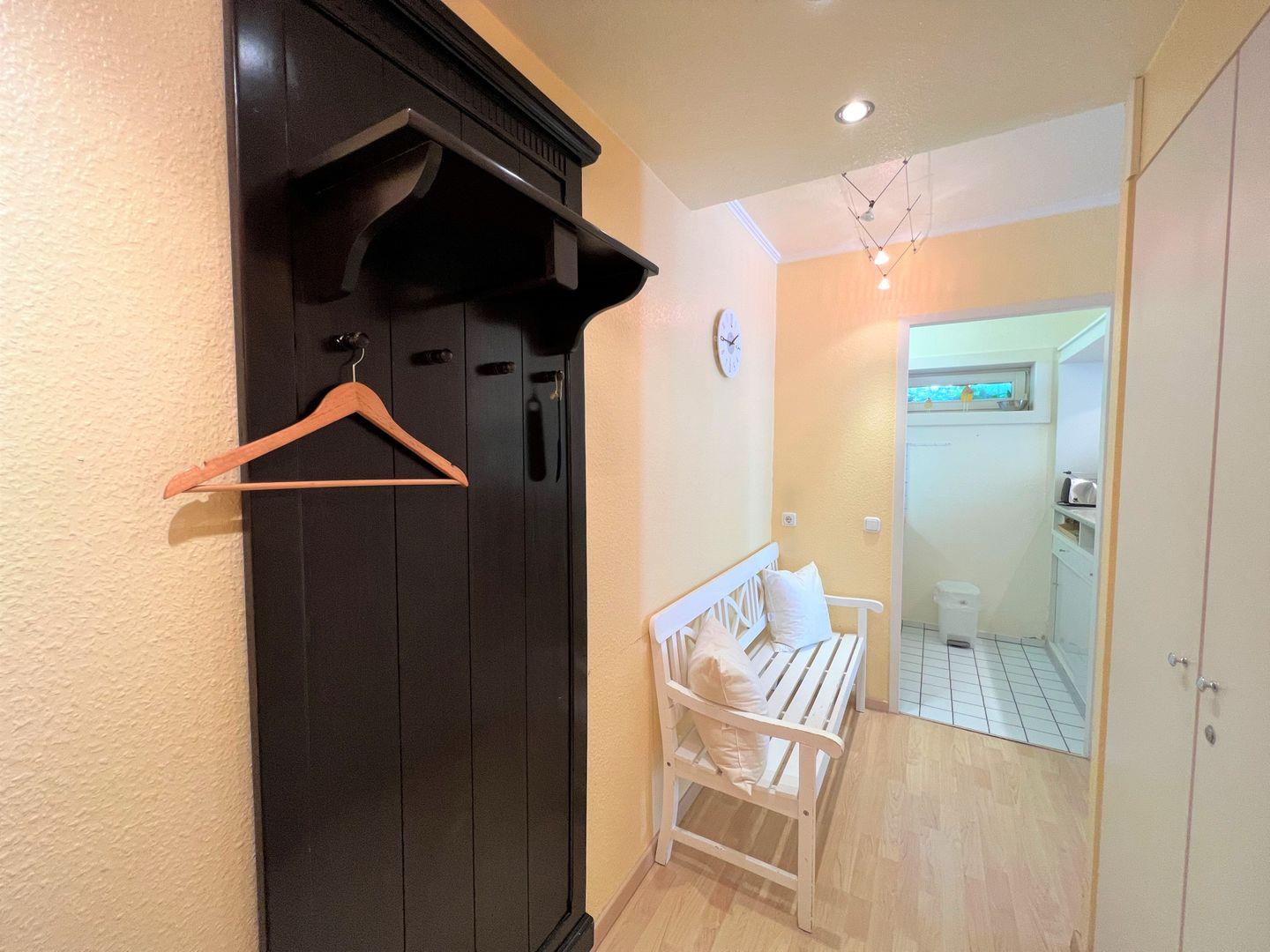 Die Wohnung liegt in der 2. Etage und hat eine große Terrasse in Ostlage mit Blick ins Grüne. Unterschiedliche Sitzmöglichkeiten laden zum Verweilen und Entspannen ein. Die kleine Küche ist mit zwei Herdplatten und Mikrowelle ausgestattet und hat eine Durchreiche zum kombinierten Ess- und Wohnbereich. Im ersten Schlafraum steht ein Doppelbett (2x 90 cm x 200 cm), im zweiten eine Etagenbett (jeweils 90 cm x 200 cm). Beide Schlafräume sind innenliegend. Das Badezimmer ist mit einer Dusche ausgestattet. Um in die Wohnung zu gelangen muss man eine Treppe hinuntergehen. PKW-Stellplatz inklusive. Zum Strand sind es nur wenige Gehminuten.