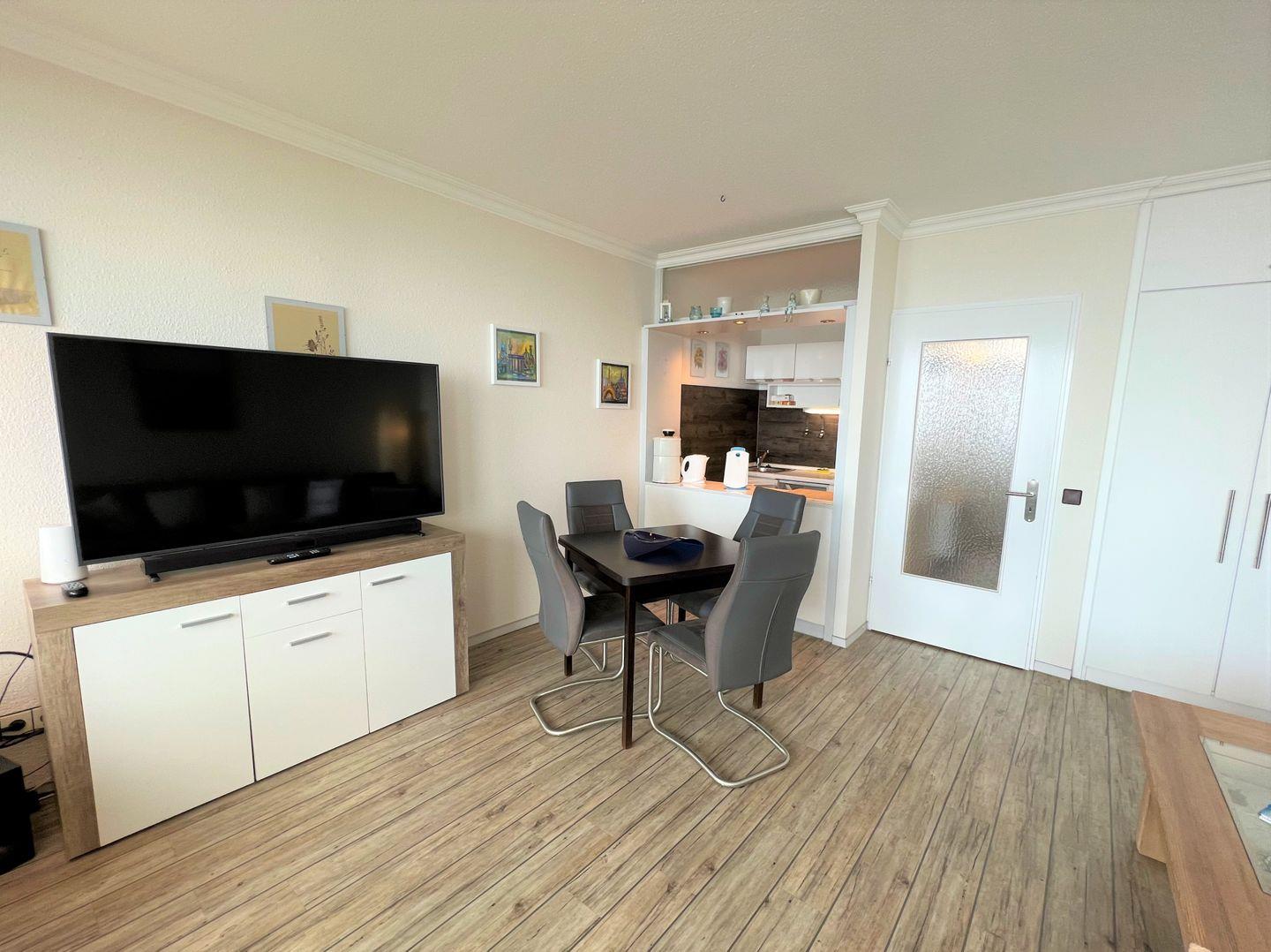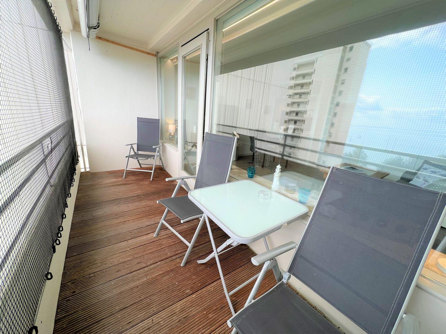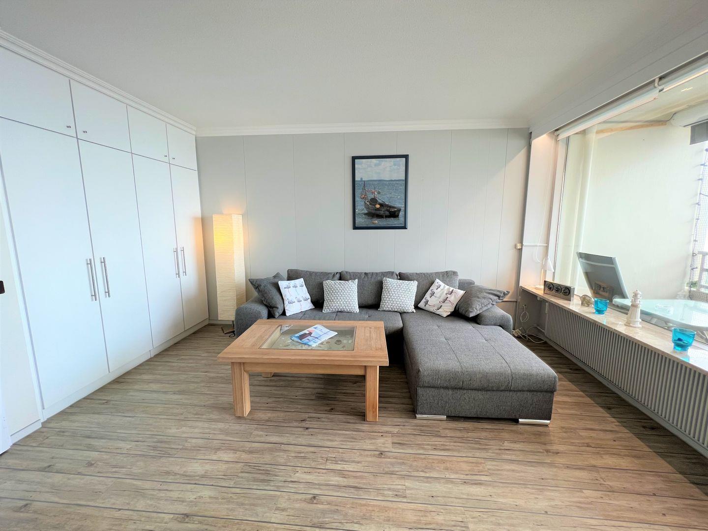 Die 2-Raum-Nichtraucher Wohnung Nr. 413 befindet sich in der 5. Etage mit Balkon in Süd-Ost-Lage und tollem Meerblick. Der Strand ist fußläufig in weniger als 5 Minuten zu erreichen. Im Schlafraum steht ein Boxspringbett (140 cm x 200 cm). Die kleine Küche mit Backofen und Herd ist mit einer Durchreiche zum Wohn-/Essbereich hin offen. Hier steht auch eine Schlafcouch für eine Person. Das modernisierte Duschbad hat ein Oberlicht zum Lüften. WLAN ist inklusive.