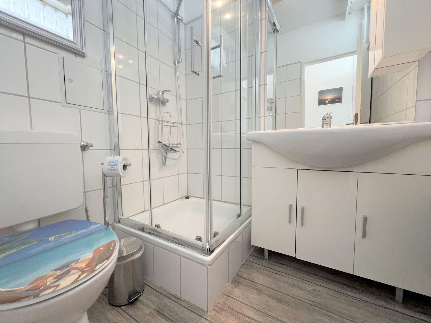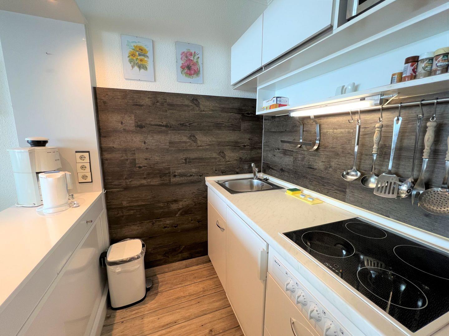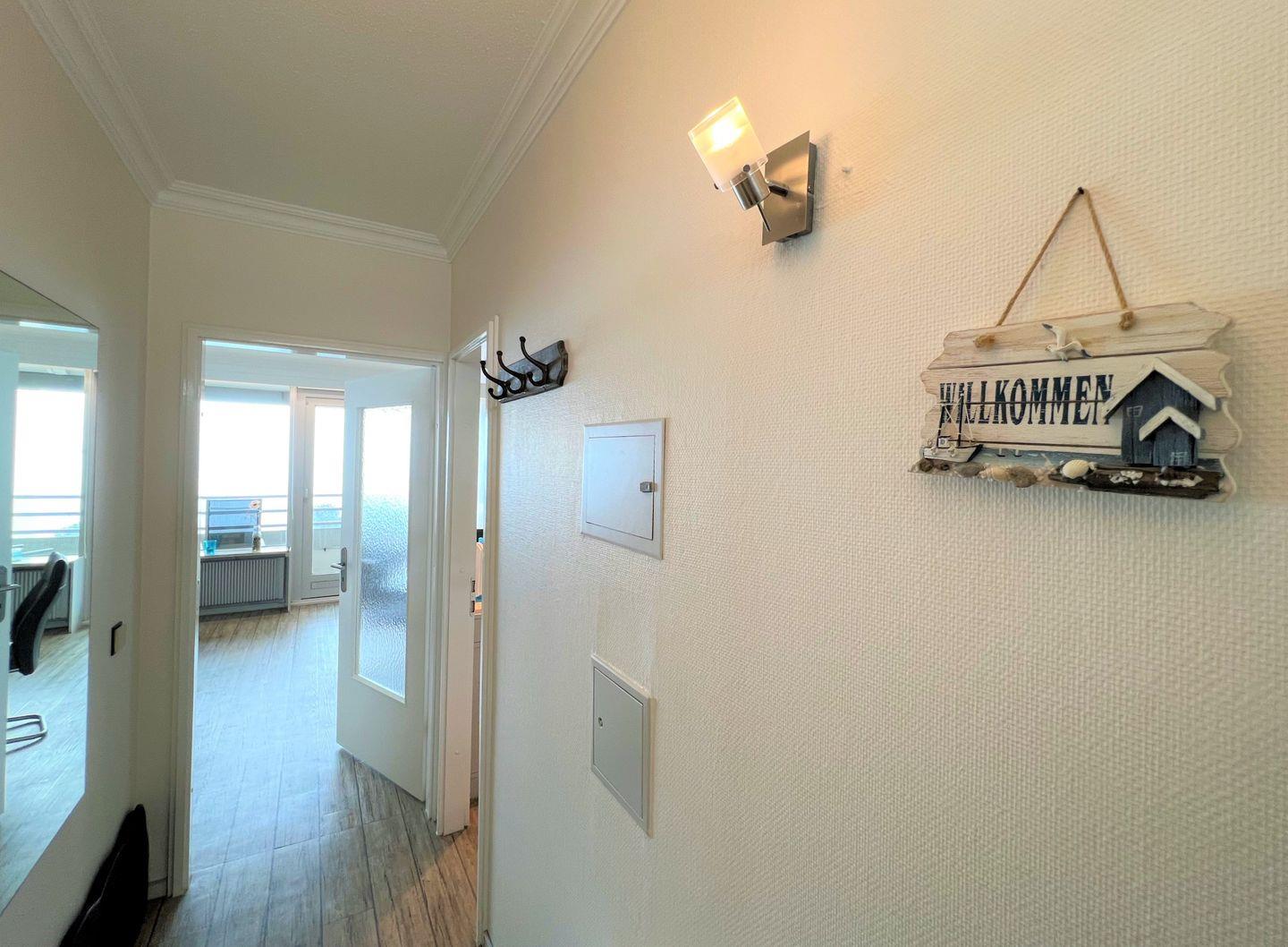 Die 2-Raum-Nichtraucher Wohnung Nr. 413 befindet sich in der 5. Etage mit Balkon in Süd-Ost-Lage und tollem Meerblick. Der Strand ist fußläufig in weniger als 5 Minuten zu erreichen. Im Schlafraum steht ein Boxspringbett (140 cm x 200 cm). Die kleine Küche mit Backofen und Herd ist mit einer Durchreiche zum Wohn-/Essbereich hin offen. Hier steht auch eine Schlafcouch für eine Person. Das modernisierte Duschbad hat ein Oberlicht zum Lüften. WLAN ist inklusive.