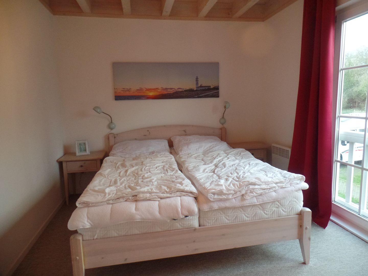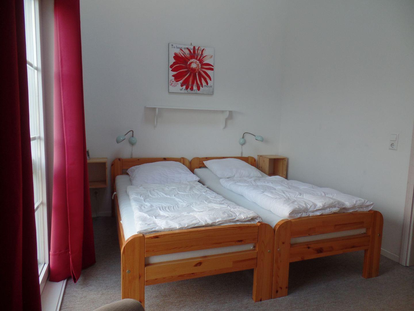 In der ersten Etage sind zwei Schlafräume mit Doppelbetten, eines mit einer großen Matratze (160 cm x 200 cm) und eines mit zwei Einzelmatratzen (jeweils 90 cm x 200 m). Im 1. OG befindet sich ebenfalls das Bad mit Whirlwanne. Im zweiten Stock befinden sich im Studio noch eine Spiel- und Malecke für Kinder, sowie zwei Einzelbetten (je 90 cm x 200 cm), die sich zusammenschieben lassen.