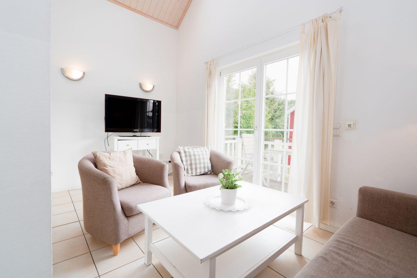 Unsere 84 qm großen Doppelhaushälften vom Typ "Klipper" bieten viel Platz und Wohlfühl-Komfort über 3 Etagen. Küchen- und Essbereich mit Kamin und Zugang zur Terrasse befinden sich im Erdgeschoss, sowie Sauna mit Dusche und WC und ein Schlafraum mit Doppelbett (2x 80 cm x 200 cm). Der Komfort einer eigenen Sauna wird sehr von unseren Wintergästen geschätzt. In der 1. Etage befinden sich ein zweiter Schlafraum mit Doppelbett (2x 90 cm x 200 cm) und der Wohnbereich, sowie das Bad mit Whirlwanne und Waschmaschine. Der Balkon geht vom Wohnbereich ab und hat an den anderen Häusern vorbei einen Ostseeblick. Zur offenen Schlafgalerie mit Tandembett (ausziehbar auf 2x 80 cm x 200 cm) führt von der 1. Etage aus eine steile Sprossenwand. Die Beheizung erfolgt über Elektroheizungen und den Kamin.