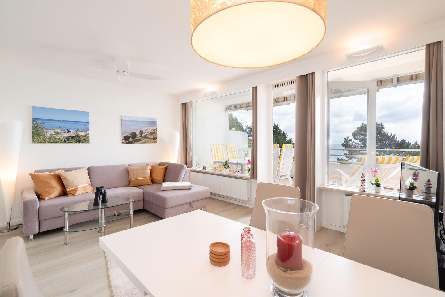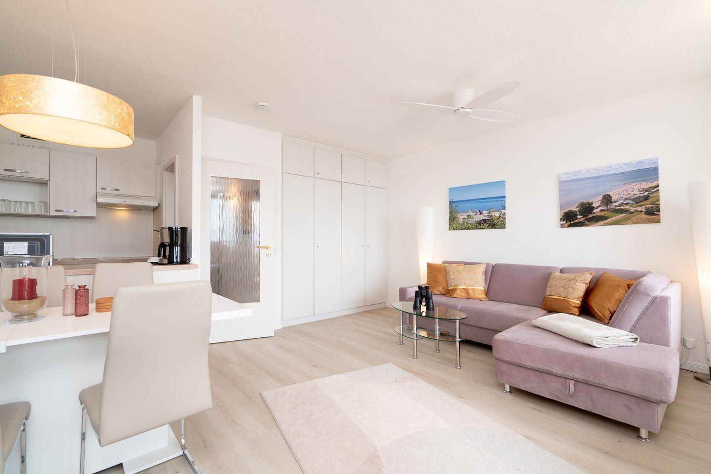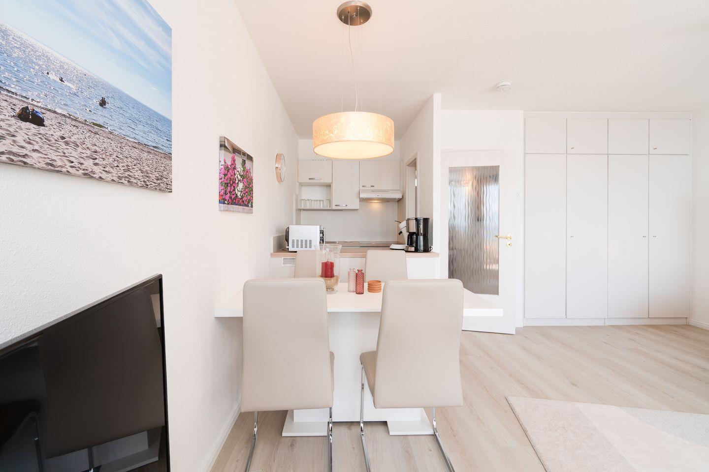 Willkommen in der 2-Raum-Ferienwohnung Nr. 269. In der 1. Reihe gelegen, bietet der große Balkon in Süd-Ost-Lage einen tollen, direkten Meerblick. Die Wohnung ist für 4 Pers. geeignet. Vom kombinierten Wohn- und Essbereich haben Sie Zugang zum Balkon. Die mit Spülmaschine, Backofen und Herd ausgestattete Küche ist in den Wohn-/Essbereich integriert. Im Schlafraum stehen zwei Einzelbetten, die man nicht zusammenschieben kann. Das Duschbad hat ein Fenster. Zum Strand sind es nur wenige Gehminuten.