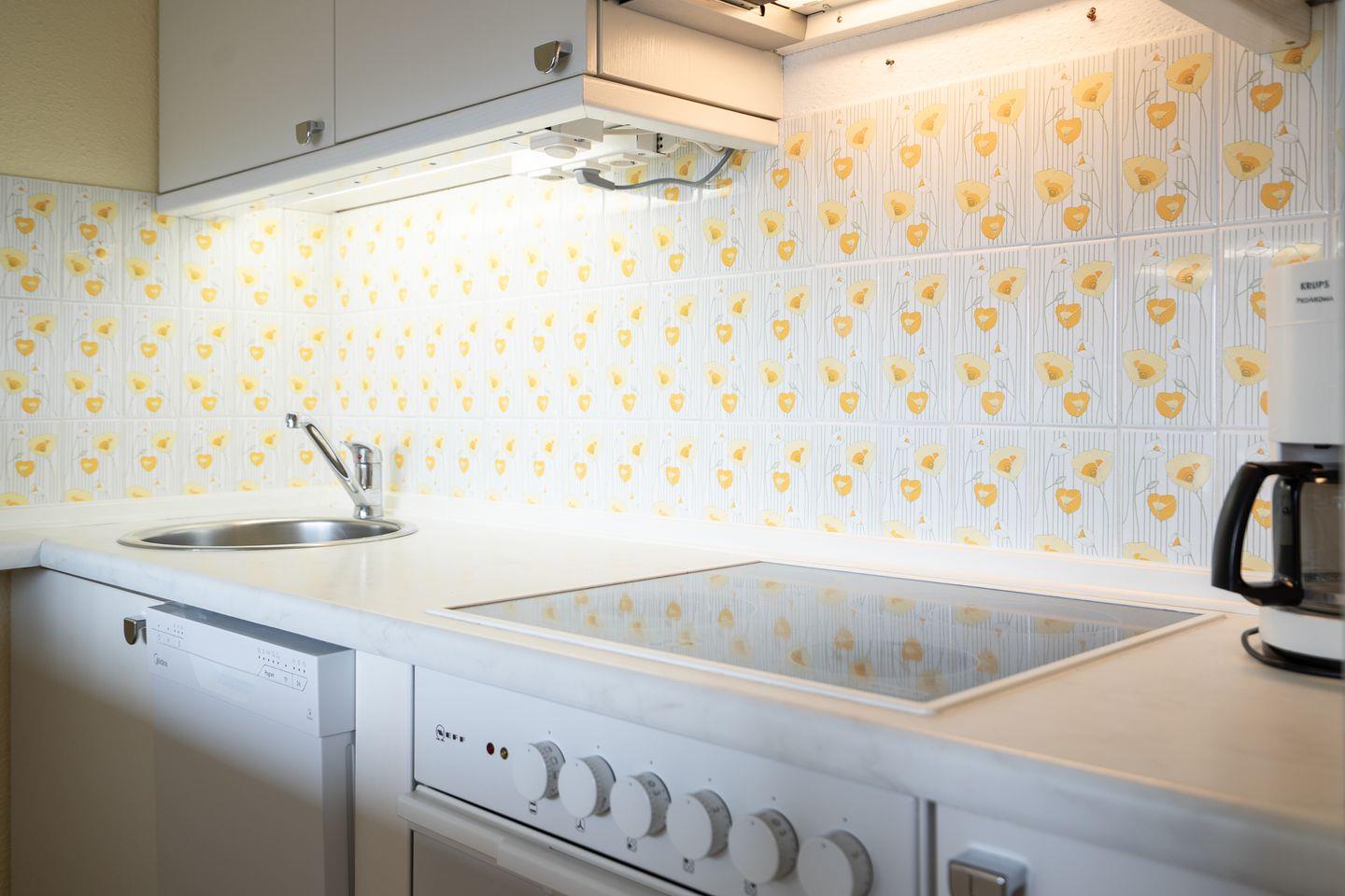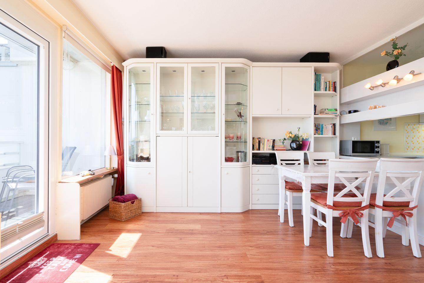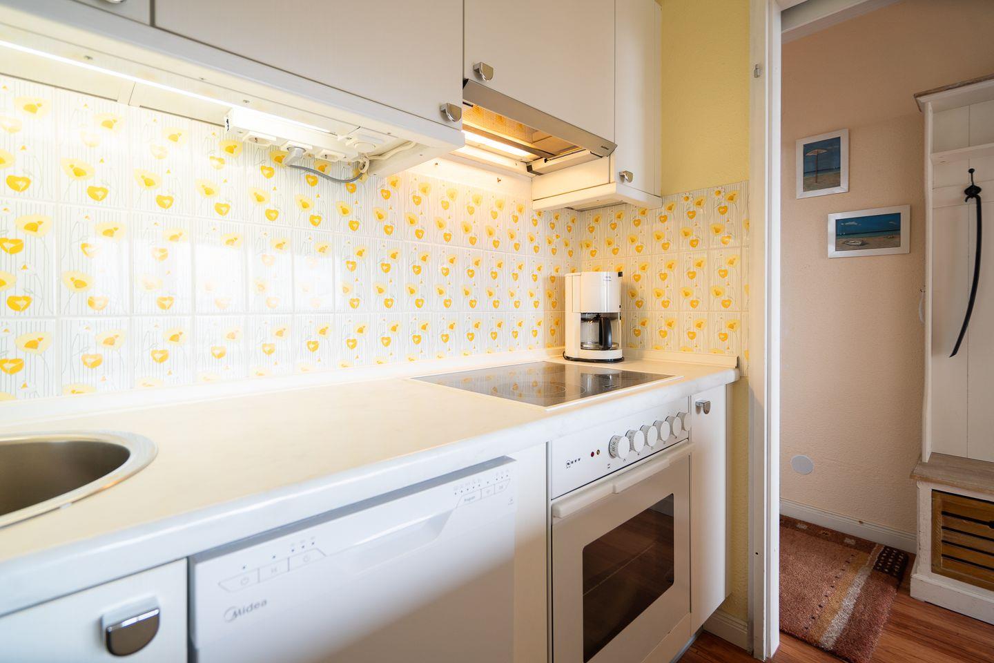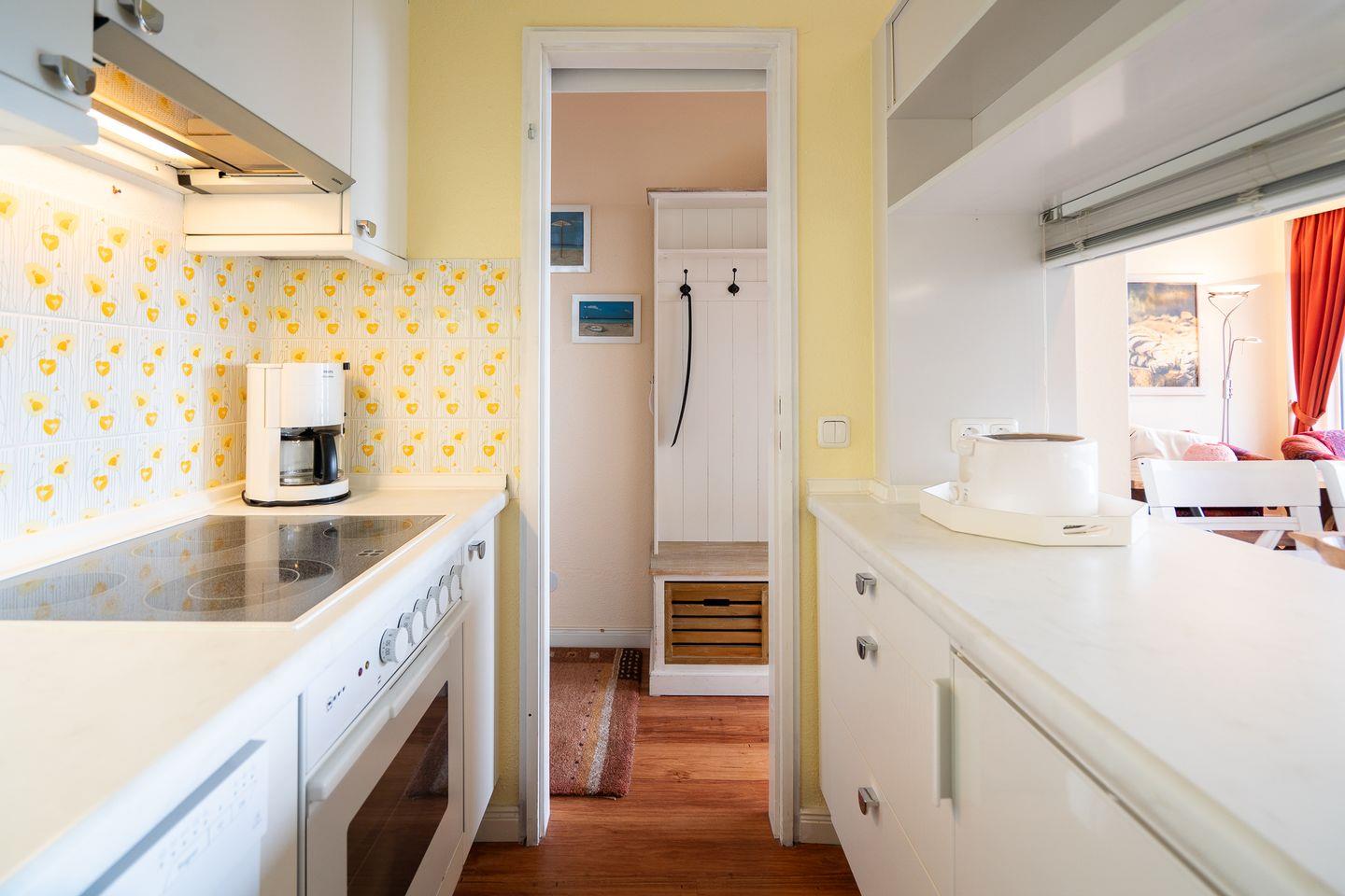 diese schöne 2-Raum-Ferienwohnung liegt in der 6. Etage mit einem möbliertem Süd-Ost-Balkon und Ostseeblick. Vom kombinierten Wohn- und Essbereich haben Sie Zugang zum Balkon. Die kleine, aber mit Spülmaschine, Backofen und Herd gut ausgestattete Küche ist mit einer Durchreiche zum Wohn-/Essbereich hin offen. Im Schlafraum, mit Fensterblick auf die Ostsee, stehen zwei getrennte Einzelbetten (80 x 190 cm), die man nicht zusammenstellen kann. Das moderne Duschbad ist innenliegend. Zum Strand sind es nur wenige Gehminuten. PKW-Stellplatz inklusive.