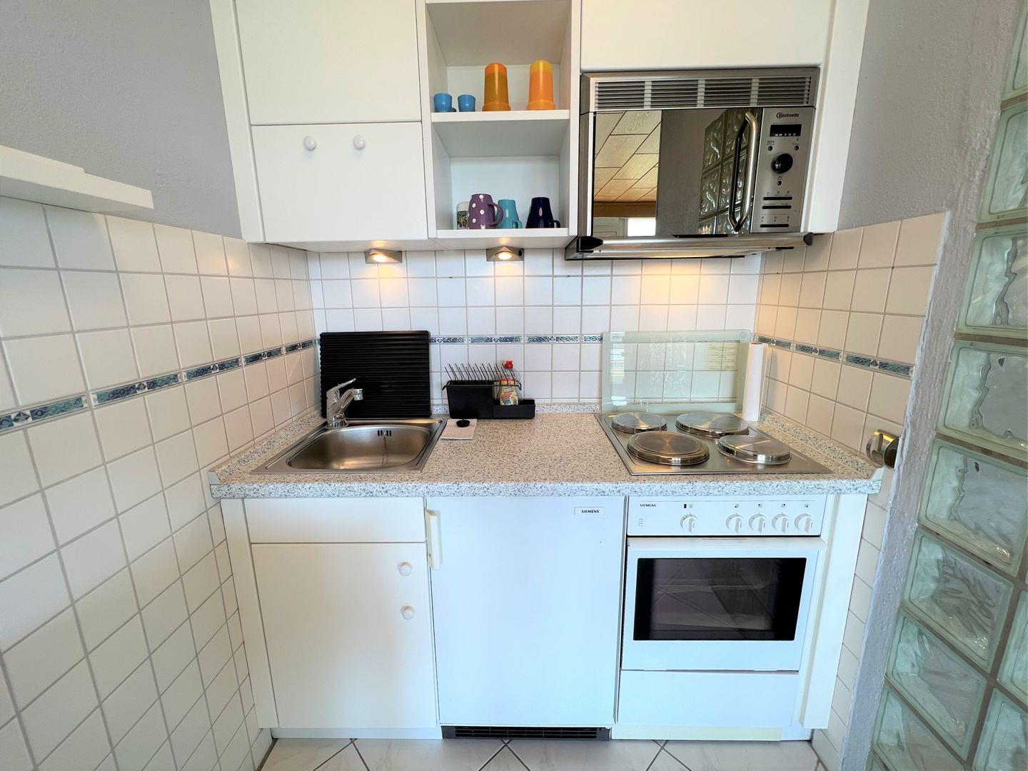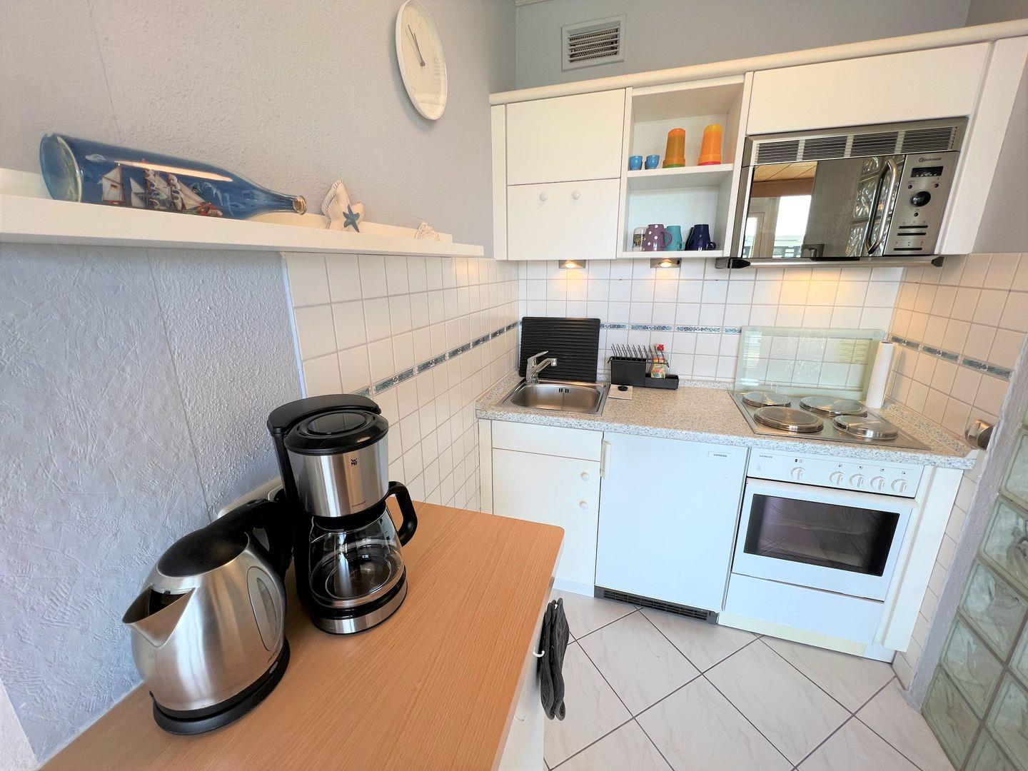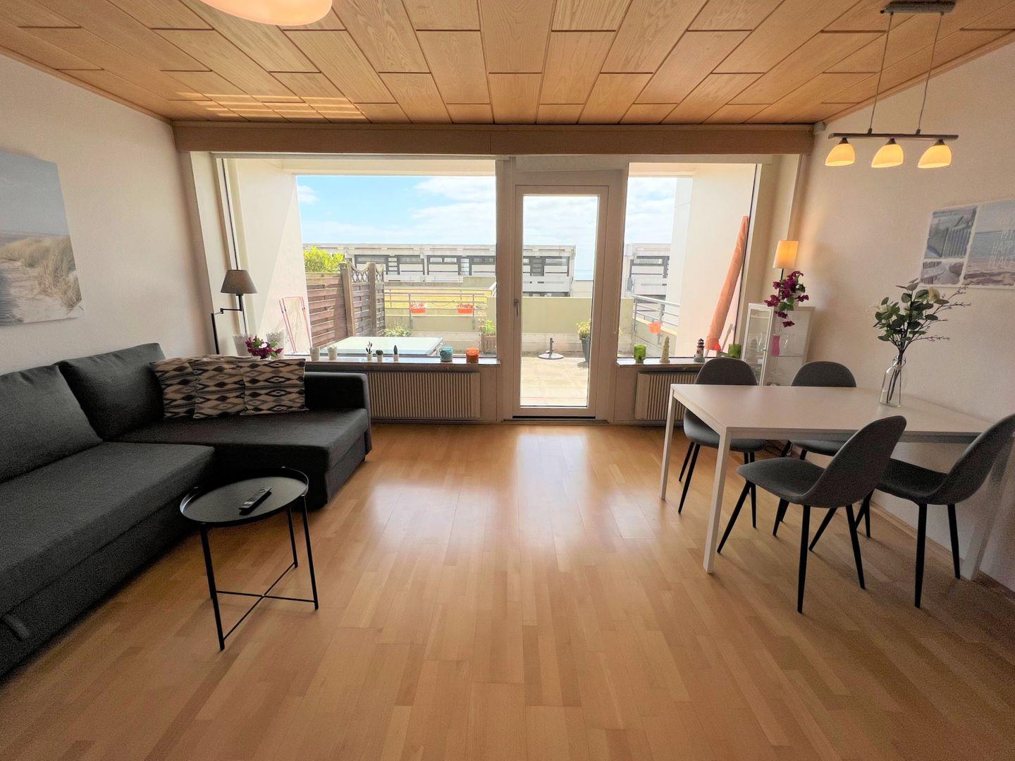 die Wohnung befindet sich in einem Hochhaus im Hochparterre mit Terrasse in Süd-Ost-Lage. Vom kombienierten Wohn- und Essbereich haben Sie Zugang zur Terrasse. Die Küche, mit Backofen und Herd ausgestattet, ist zum Wohnraum offen. Im Schlafraum befinden sich zwei getrennte Betten (2 x 90 cm x 190 cm), die man nicht zusammenschieben kann. Sie haben hier ein Oberlicht zum Lüften. Im Schlafraum ist kein Platz, um ein Kinderreisebettchen aufzustellen. Im Wohnraum befindet sich zudem ein Schlafsofa (140 cm x 200 cm). Es gibt ein Duschbad ebenfalls mit Oberlicht zum Lüften. PKW-Stellplatz inklusive. Zum Strand sind es nur wenige Gehminuten.