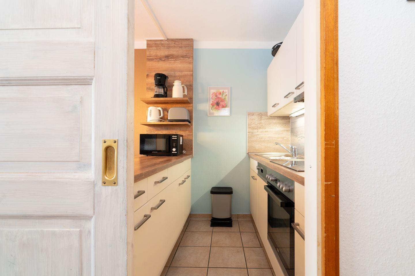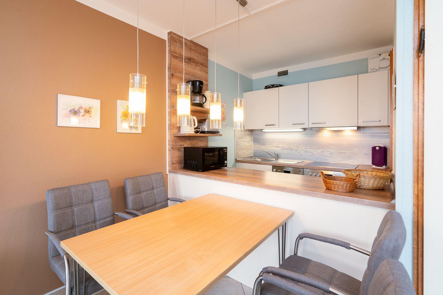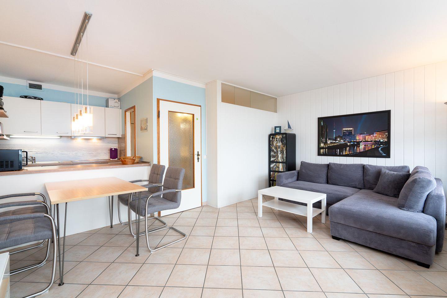 die 2-Raum-Ferienwohnung befindet sich in der 2. Etage mit Balkon in Nord-Ost-Lage und Blick in die Neustädter Bucht. Die moderne Küchenzeile ist zum hellen Wohn- und Essbereich hin offen und mit Spülmaschine, Backofen und Herd ausgestattet. Im innenliegenden Schlafraum befindet sich ein Doppelbett (2x 90 cm x 200 cm). Der Wohnraum ist zudem mit einer Schlafcouch (140 cm x 200 cm) ausgestattet. Das moderne Duschbad ist innenliegend. Der Strand und die Promenade sind nur wenige Gehminuten entfernt. PKW-Stellplatz inklusive.