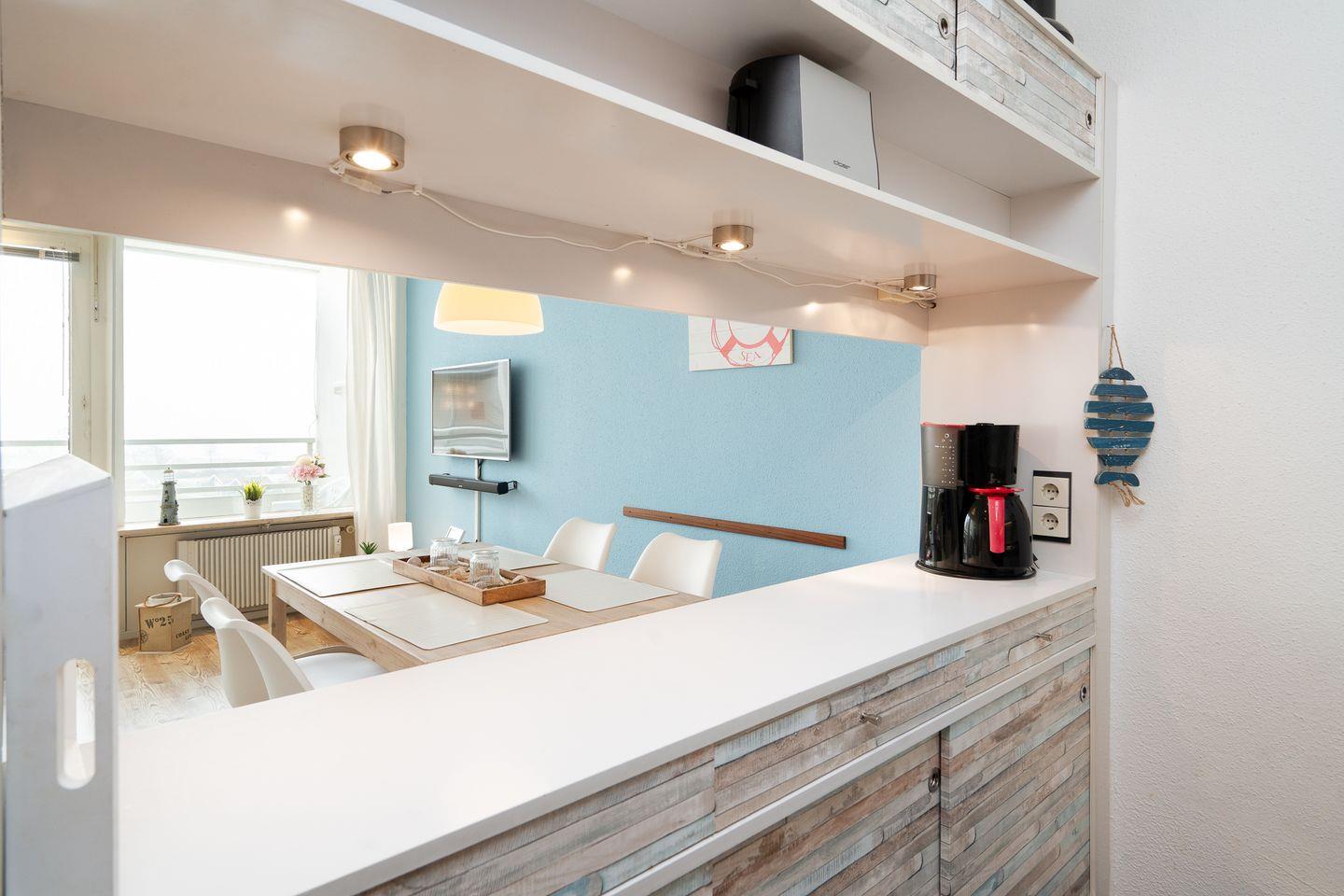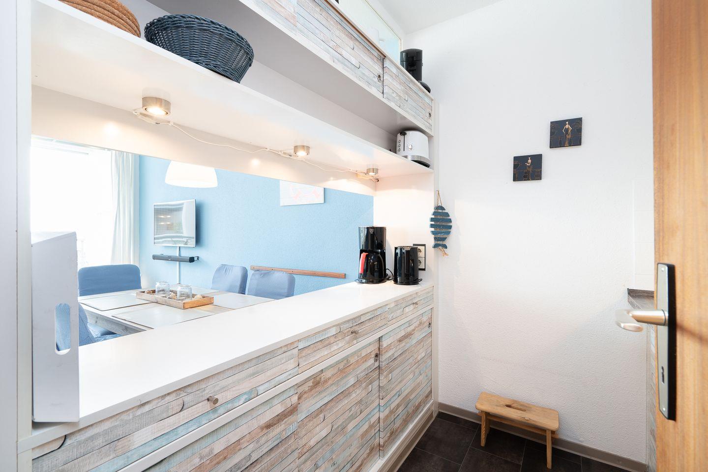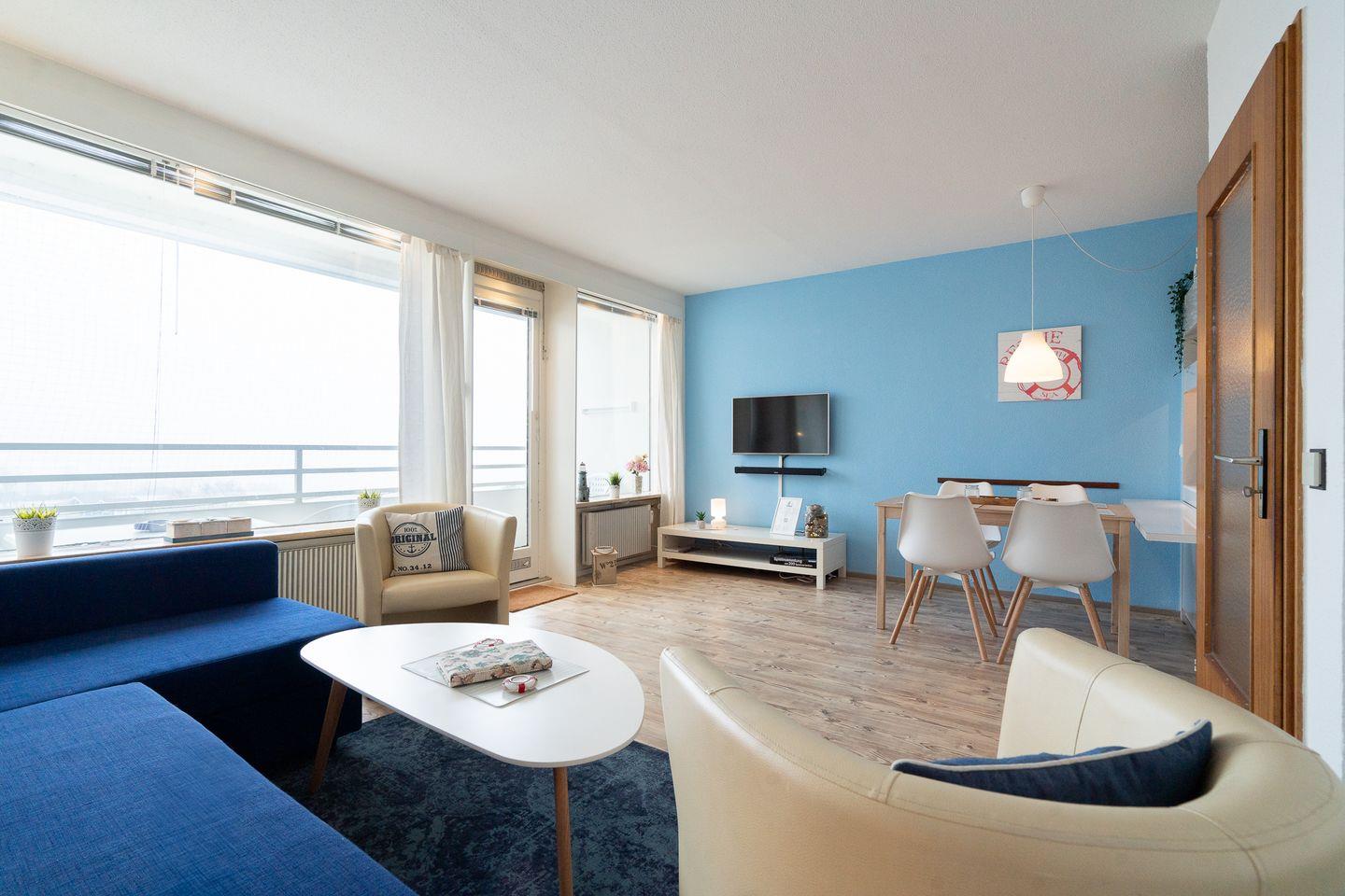 diese gemütliche 2-Raum-Ferienwohnung liegt in der Apartmentanlage Ferienpark in der 6. Etage mit einem möbliertem Nord-Ost-Balkon und Ostseeblick in die Neustädter Bucht. Die Wohnung ist ca. 40 m² groß und für 2- 4 Personen geeignet. Vom kombinierten Wohn- und Essbereich haben Sie Zugang zum Balkon. Die kleine Küche mit Backofen und Herd hat eine Durchreiche und ist zum Wohn-/Essbereich hin offen. Der Schlafraum ist innenliegend und mit getrennten Betten (2 x 90 cm x 190 cm) ausgestattet. Im Wohnraum befindet sich zudem ein Schlafsofa (140 cm x 200 cm. Das moderne Duschbad ist innenliegend. Zum Strand sind es nur wenige Gehminuten. PKW-Stellplatz inklusive.