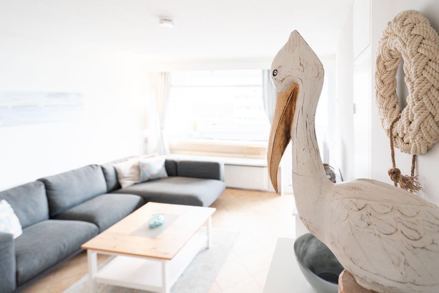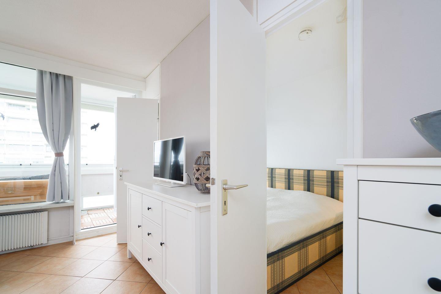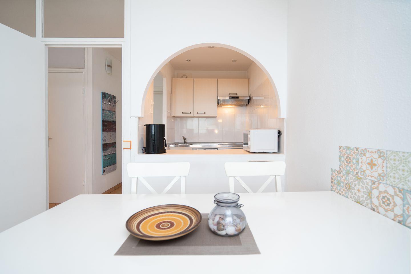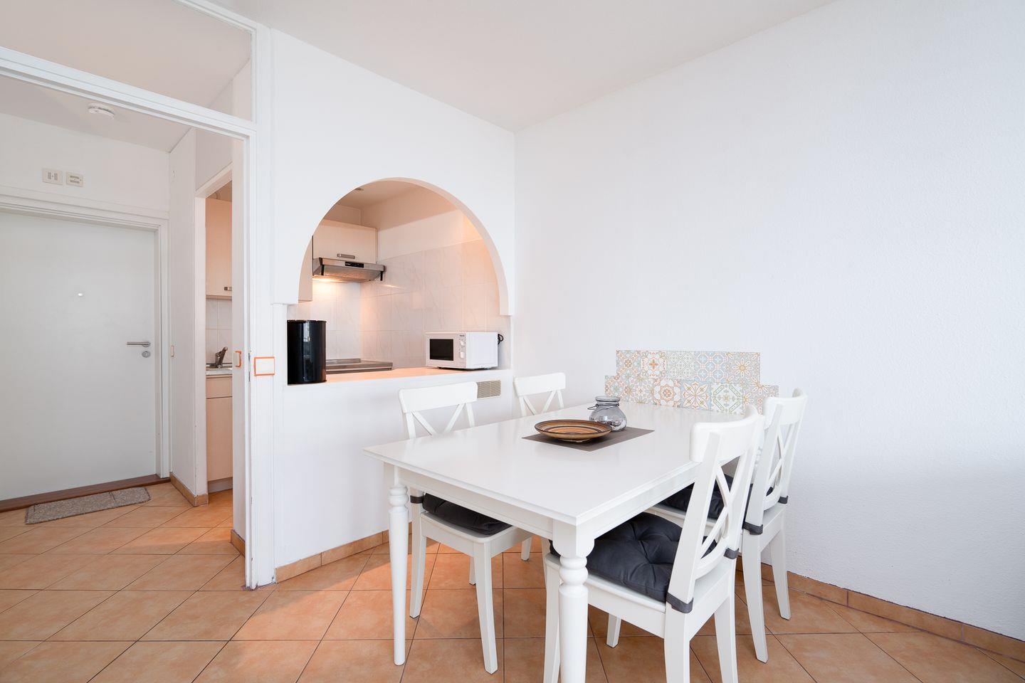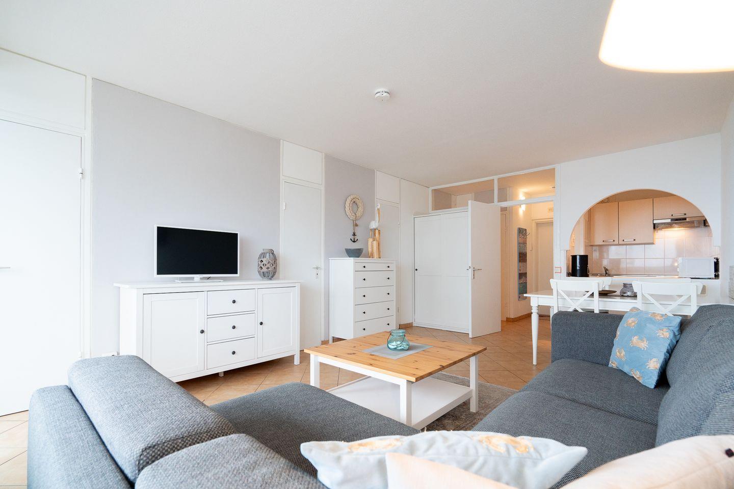 Die kleine Küche ist mit Backofen, Herd und Spülmaschine komplett ausgestattet und hat eine Durchreiche zum kombinierten Ess- und Wohnbereich. Im ersten Schlafraum steht ein Doppelbett (2 x 80 cm x 200 cm) und im zweiten Schlafraum ein Einzelbett und ein Etagenbett (jeweils 90 cm x 200 cm). Die Schlafräume sind innenliegend und nur durch Leichtbauwände getrennt. Das Wannenbad mit WC ist innenliegend. Die Wohnung ist durchgehend gefliest. Zum Strand sind es ca. 600 Meter.