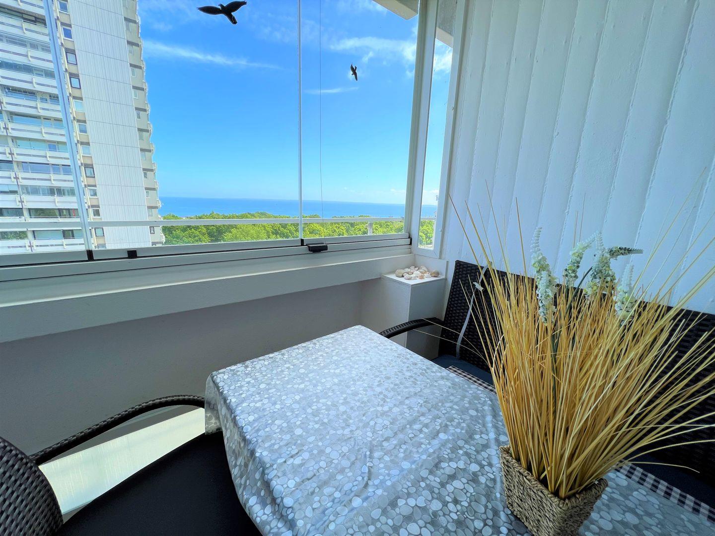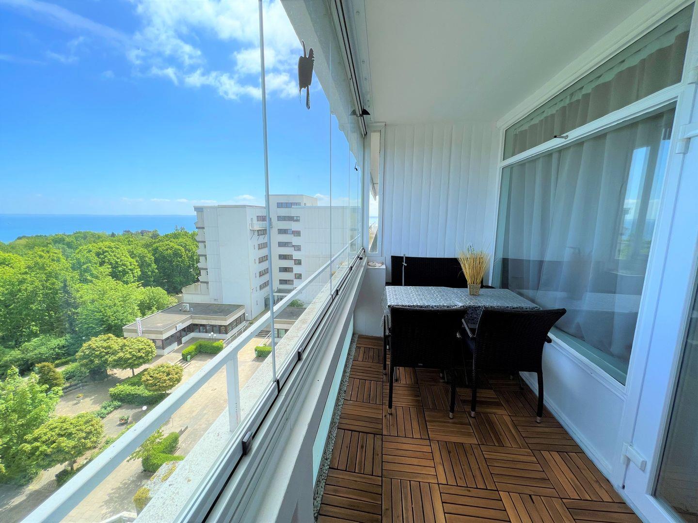 Die Wohnung liegt in der 6. Etage mit einem verglaste Balkon in Ostlage (Glaselemente lassen sich öffnen). Von hier aus können Sie auf die Ostsee und den Hansapark schauen.