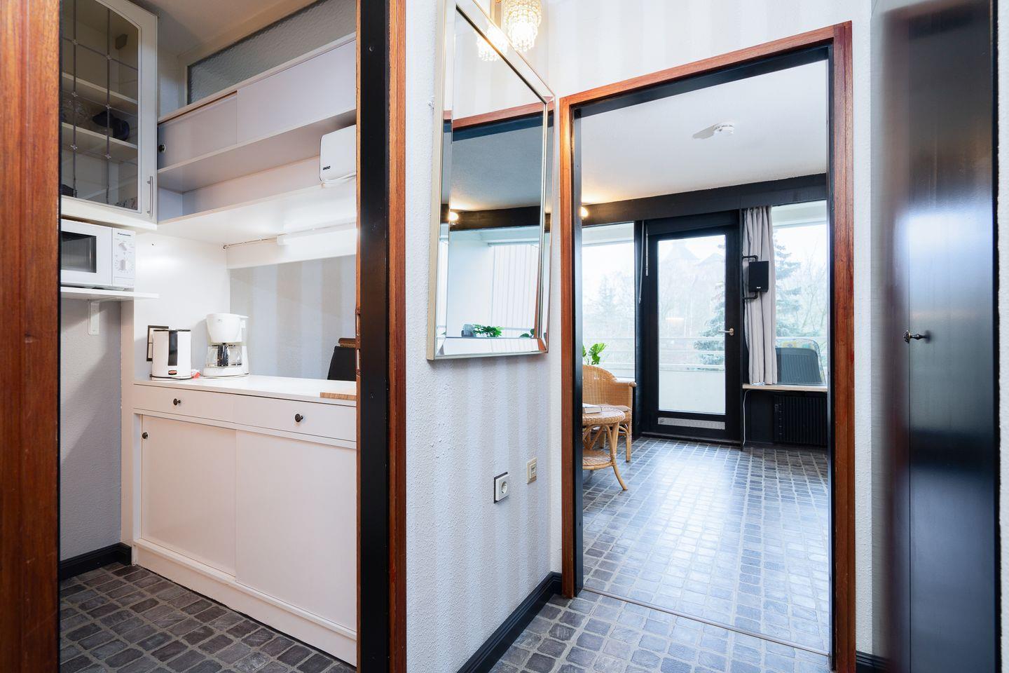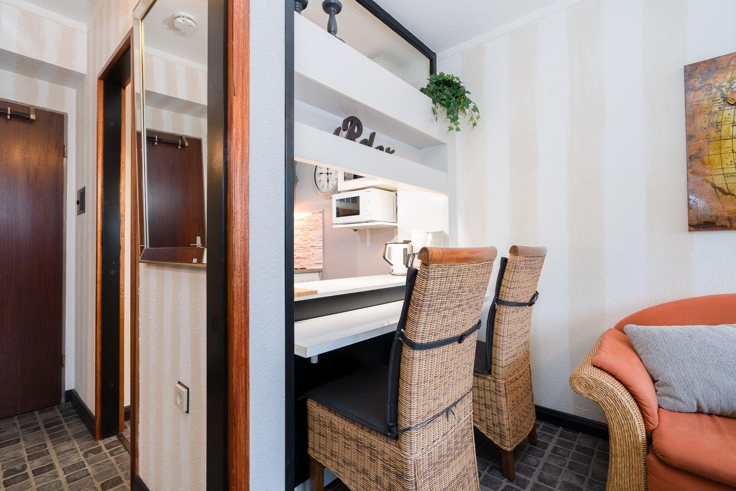 diese 1-Raum-Nichtraucher-Ferienwohnung liegt in der Apartmentanlage Ferienpark in der 2. Etage mit einem möblierten Nord-West-Balkon ohne Meerblick. Die Wohnung ist ca. 33 qm groß und für 2 Personen (+ Kleinkind) geeignet. Im kombinierten Wohn- und Schlafraum finden Sie ein Doppelbett (140 cm x 200 cm), in das man seitlich einsteigen kann. Die kleine Küchenzeile hat eine Durchreiche zum Wohnbereich und ist mit Backofen und Herd ausgestattet. Das Duschbad ist modernisiert und innenliegend. Zum Strand und zur Promenade sind es nur wenige Gehminuten. PKW-Stellplatz inklusive.