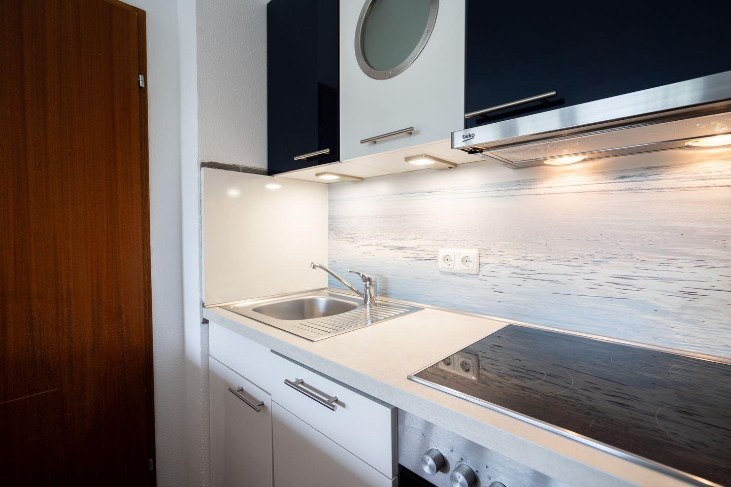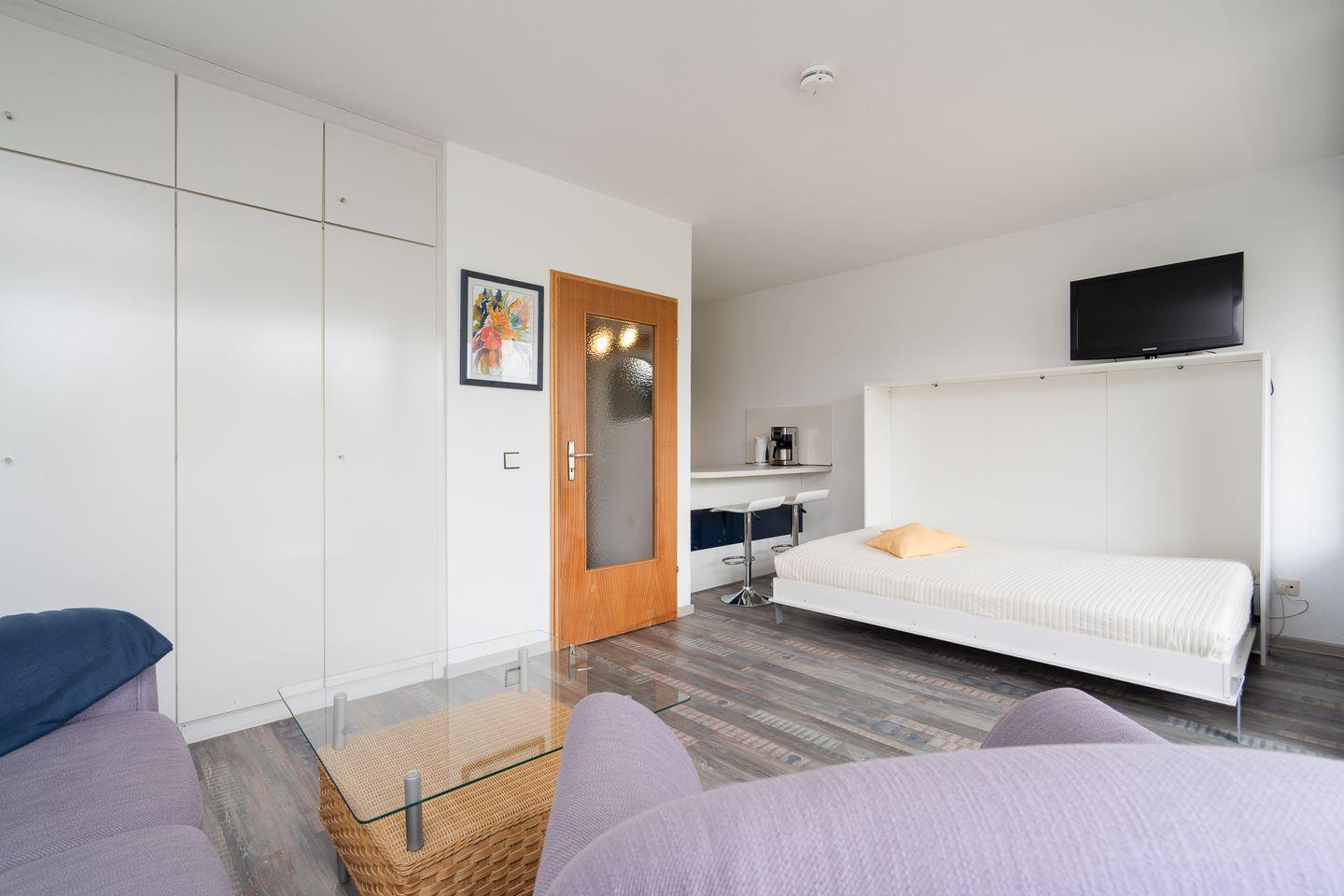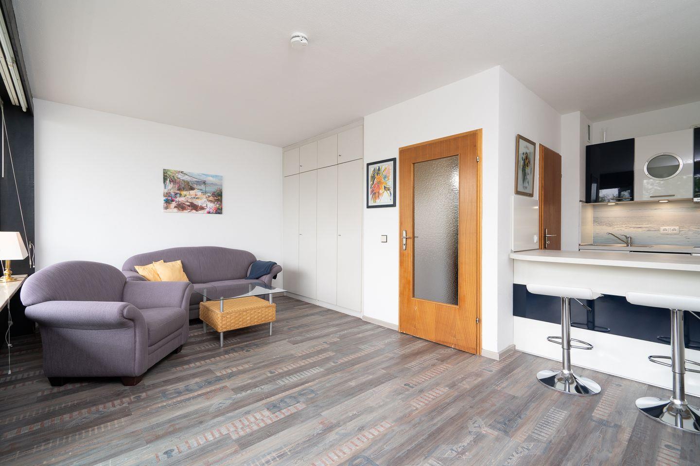 diese 1-Raum-Ferienwohnung liegt in der Apartmentanlage Ferienpark in der 3. Etage mit einem Balkon in Süd-West-Lage und seitlich etwas Meerblick. Die Wohnung ist ca. 33 qm groß. Im kombinierten Wohn- und Schlafraum mit Sofaecke steht Ihnen ein Schrankbett (1,40x2,00m) zur Verfügung. Die moderne Küche ist mit Spülmaschine, Backofen und Herd ausgestattet und hat einen Esstresen, der zum Wohnraum hin offen ist. Das Duschbad ist innenliegend. Zum Strand und zur Promenade sind es nur wenige Gehminuten. PKW-Stellplatz inklusive.