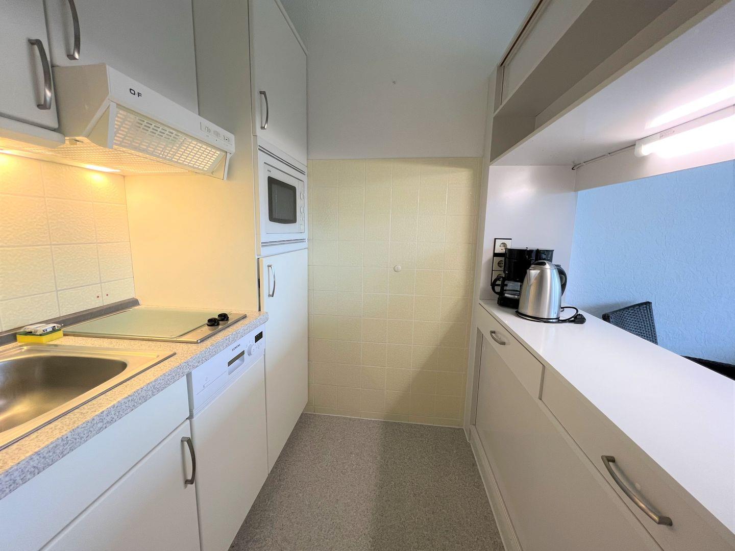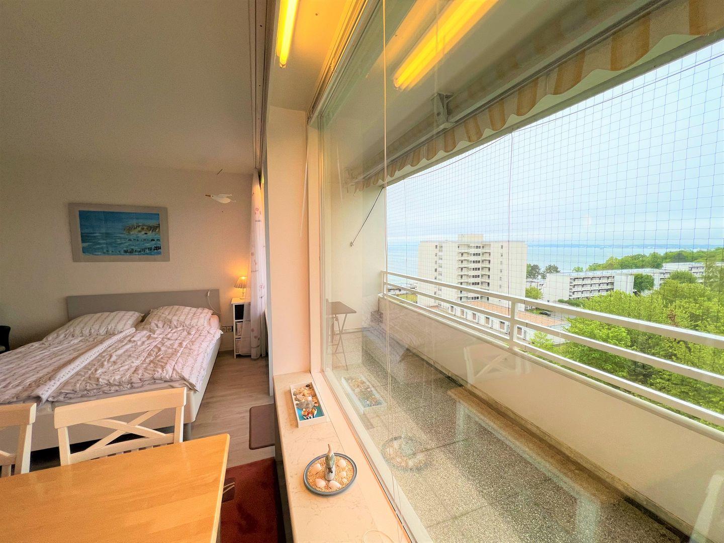 Die 1-Raum-Ferienwohnung Nr. 775 liegt in der 7. Etage mit einem Süd-West-Balkon und seitlichem Ostseeblick. Im kombinierten Wohn-Schlafraum gibt es eine Doppelbett . Es befindet sich zusätzlich ein Etagenbett (0,9m x 1,9m) in der Wohnung. Die Küche hat eine Durchreiche und ist offen zum Wohn-/Schlafbereich. Das Duschbad ist innenliegend. Zum Strand sind es nur wenige Gehminuten.