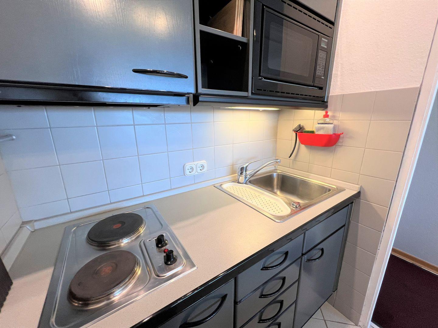 Die Küche ist mit 2 Platten Herd, Kühlschrank, Backofen, Mikrowelle und 2 Kaffeemaschinen ausgestattet. An dem angrenzenden Küchentisch können Sie ganz bequem Ihre Mahlzeiten zu sich nehmen.