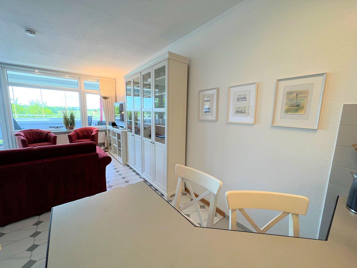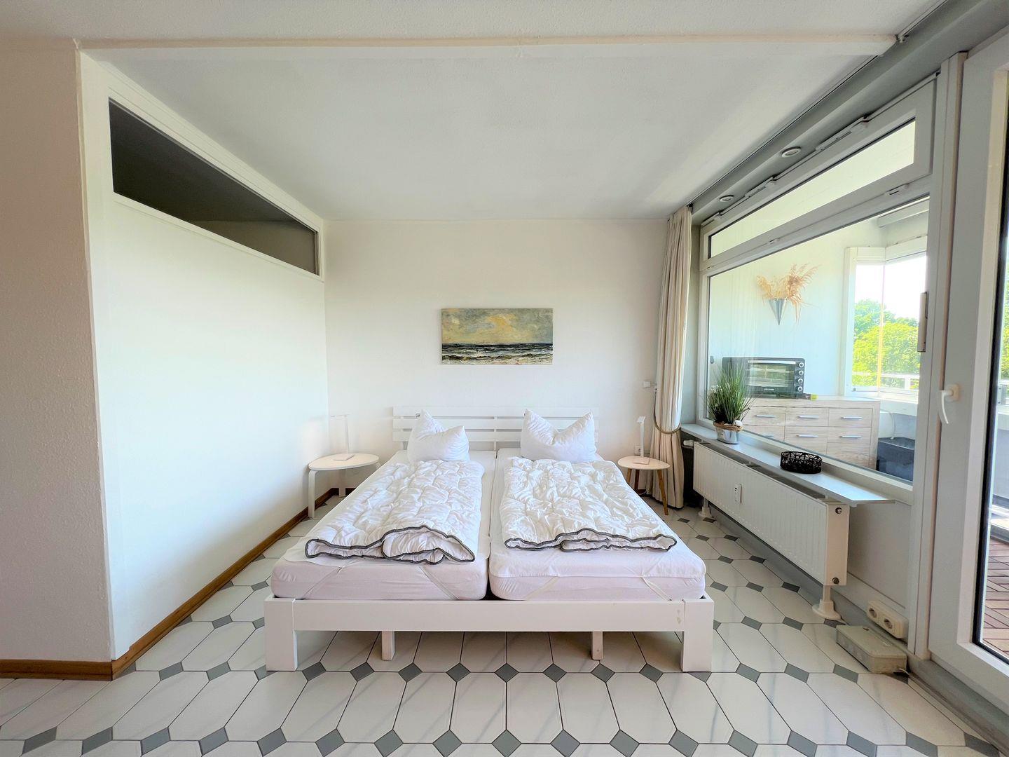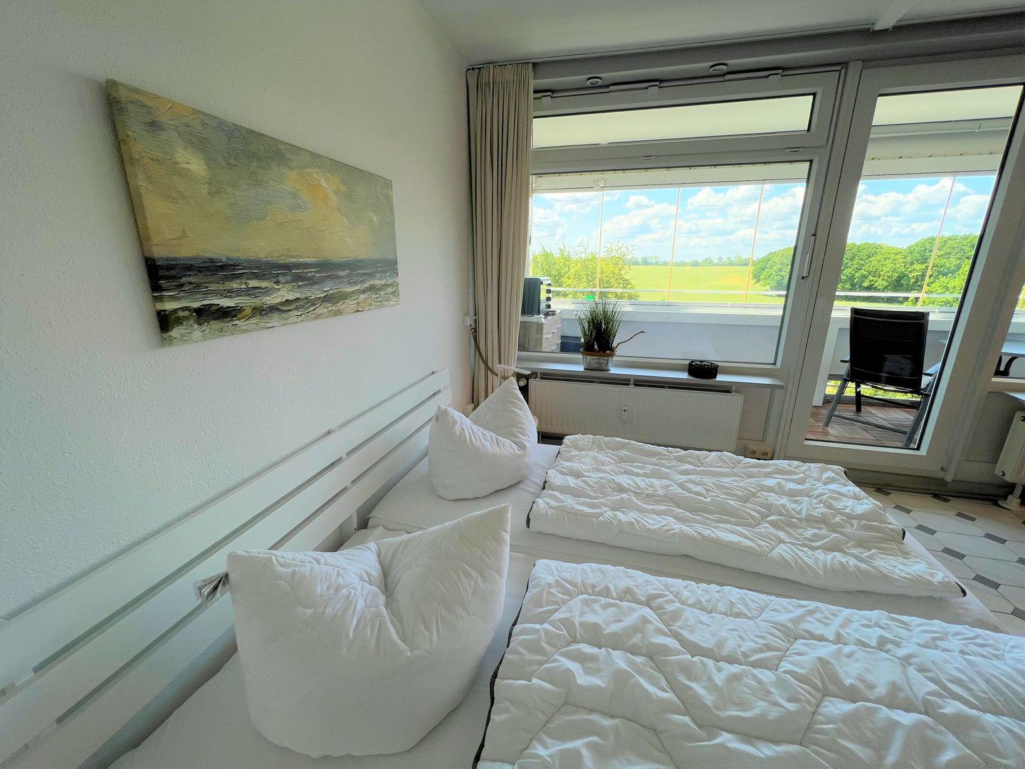 Das helle großzügige 2- Raum Appartement (B 2-10) liegt in Westlage mit Sonne ab ca. 13.00 Uhr bis zum Abend. Schöner freier Blick bis zum Sonnenuntergang.