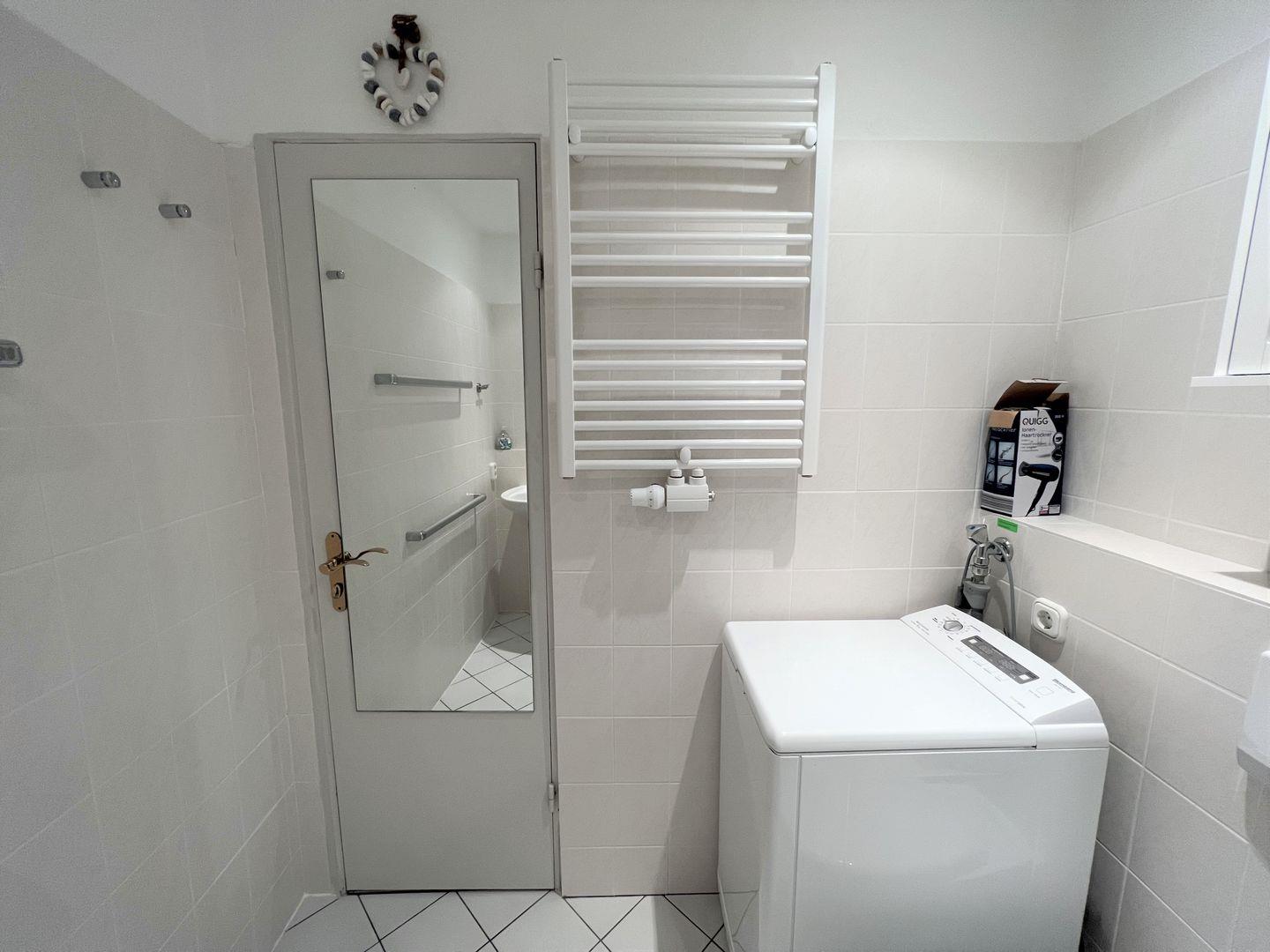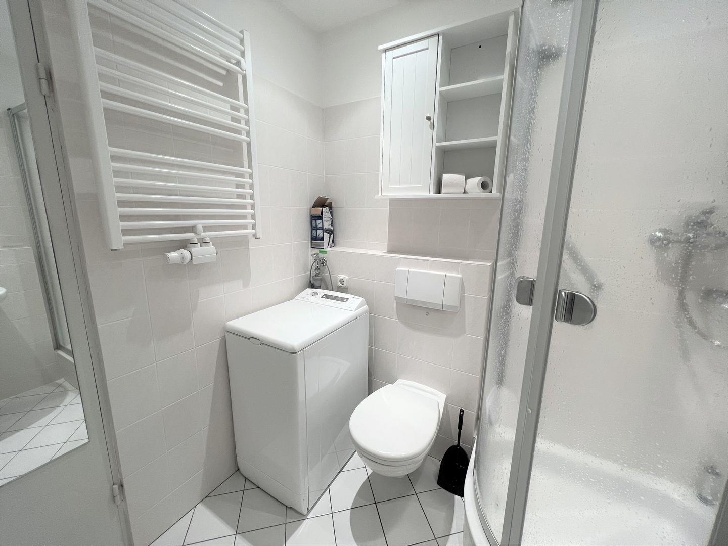 Das hell geflieste Duschbad ist innenliegend und verfügt über ein Waschtrockner-Gerät. PKW- Stellplatz ist inklusive.