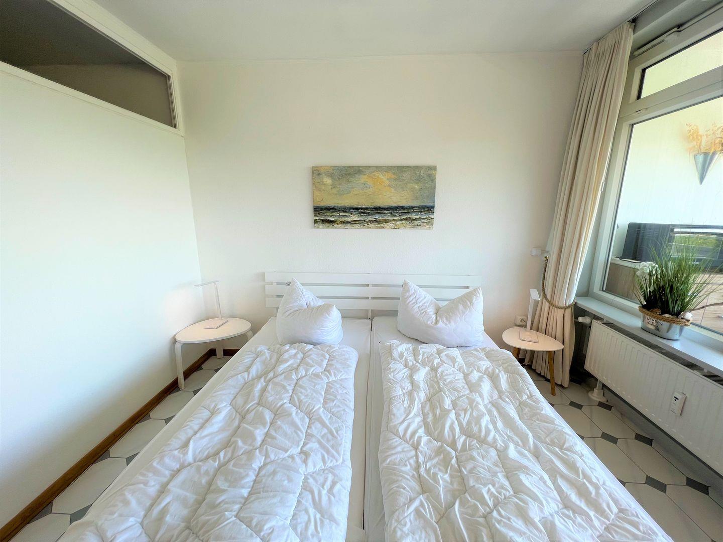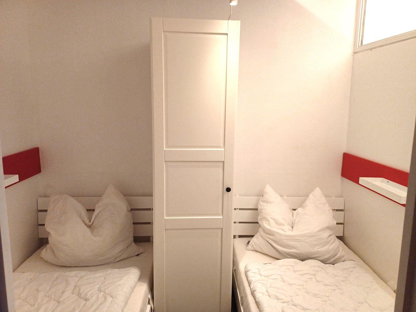 Das Appartement bietet viel freien Schrankraum, eine extra Abstellkammer für Schuhe, Sandspielzeug und anderes. 4 reguläre, bequeme Betten (alle 90 x 200 cm, zwei mit offenem Fußende), sorgt für eine gute Nachtruhe.