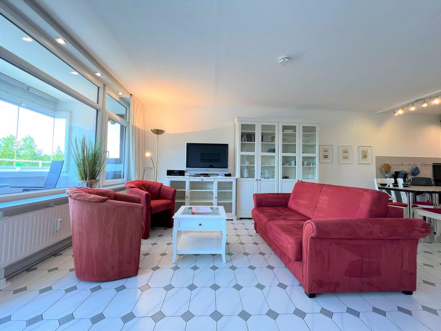 Der Wohnbereich ist mit Sofa, 2 Sesseln, einem TV-Gerät sowie Radio/CD –Gerät ausgestattet. Einen entspannten Fernsehabend können Sie sowohl vom Sofa aus als auch vom Doppelbett genießen.