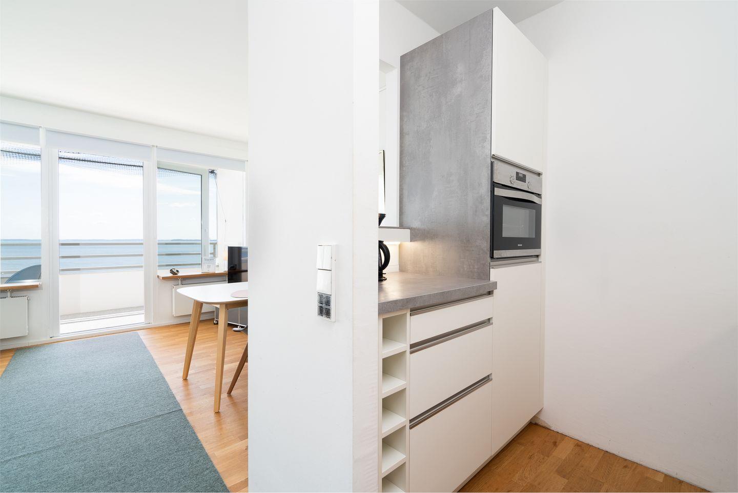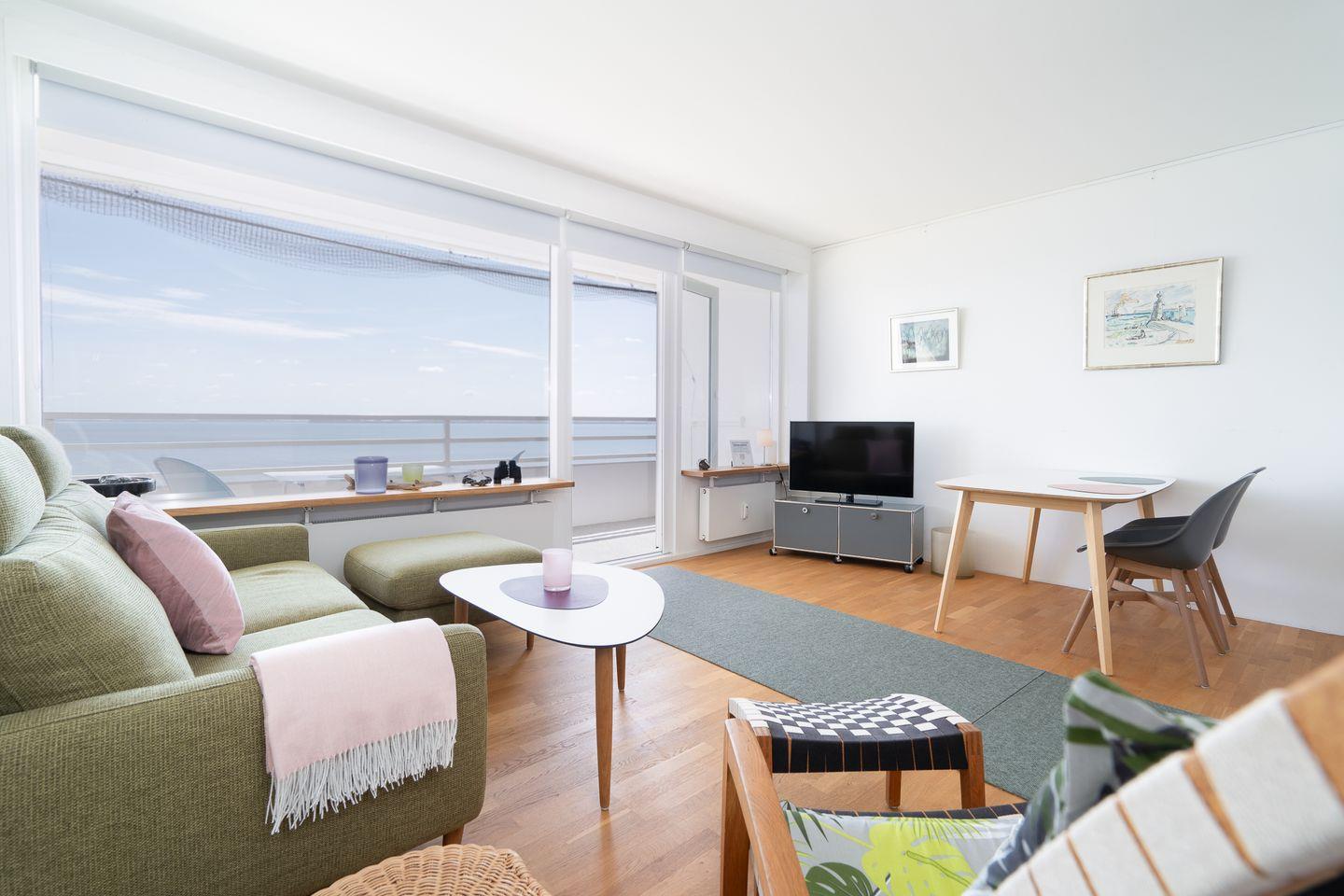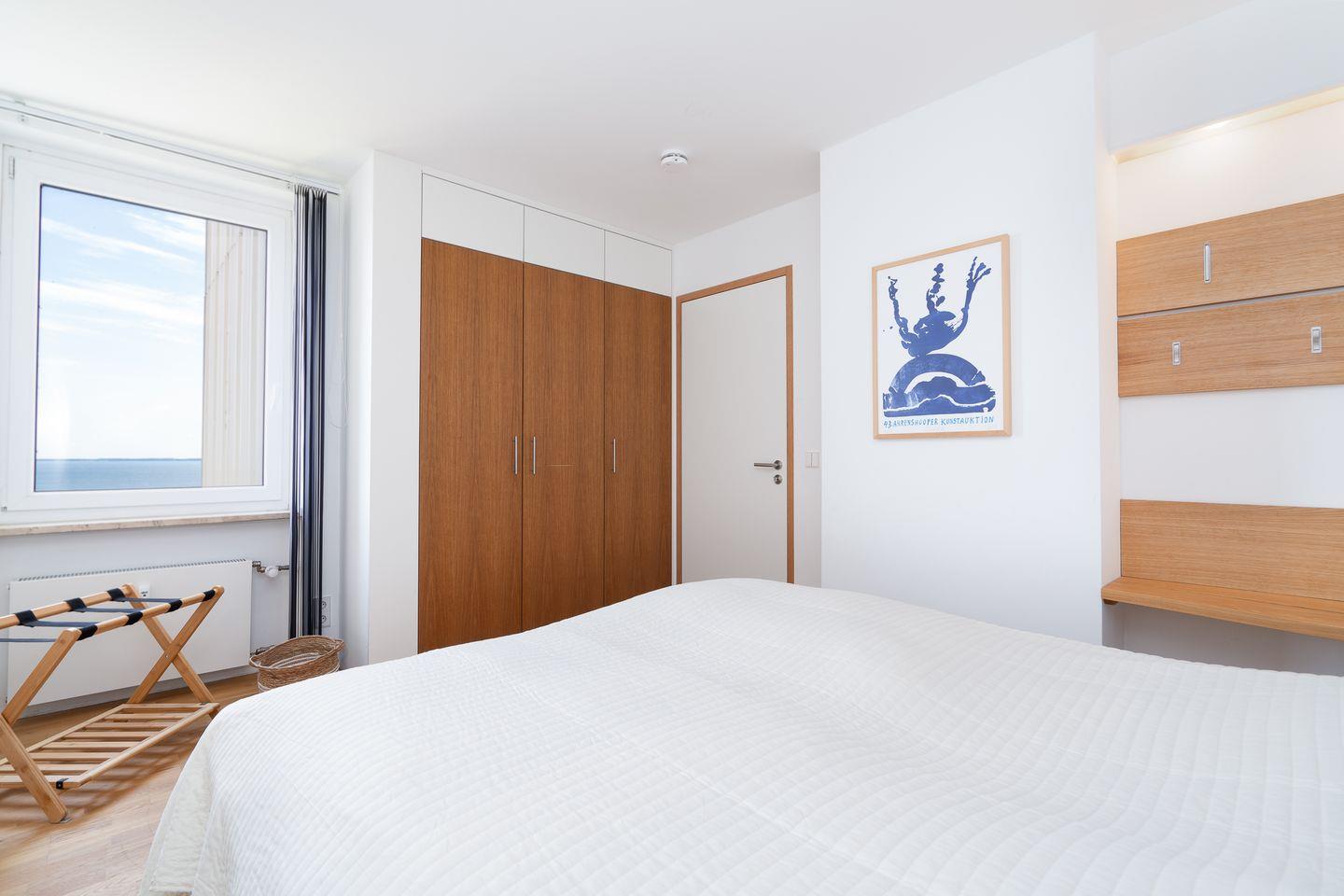Vom modernen, kombinierten Wohn- und Essbereich haben Sie Zugang zum Balkon in Süd-Ost-Lage und schönem Ostseeblick. Die Küche ist mit Spülmaschine, Backofen und kleinem Kochfeld ausgestattet. Das Schlafzimmer hat ein Doppelbett und ein Fenster mit Ostseeblick - Aufwachen und das Meer sehen, was gibt es Schöneres? Zum Strand sind es nur wenige Schritte zu Fuß. WLAN ist inklusive.