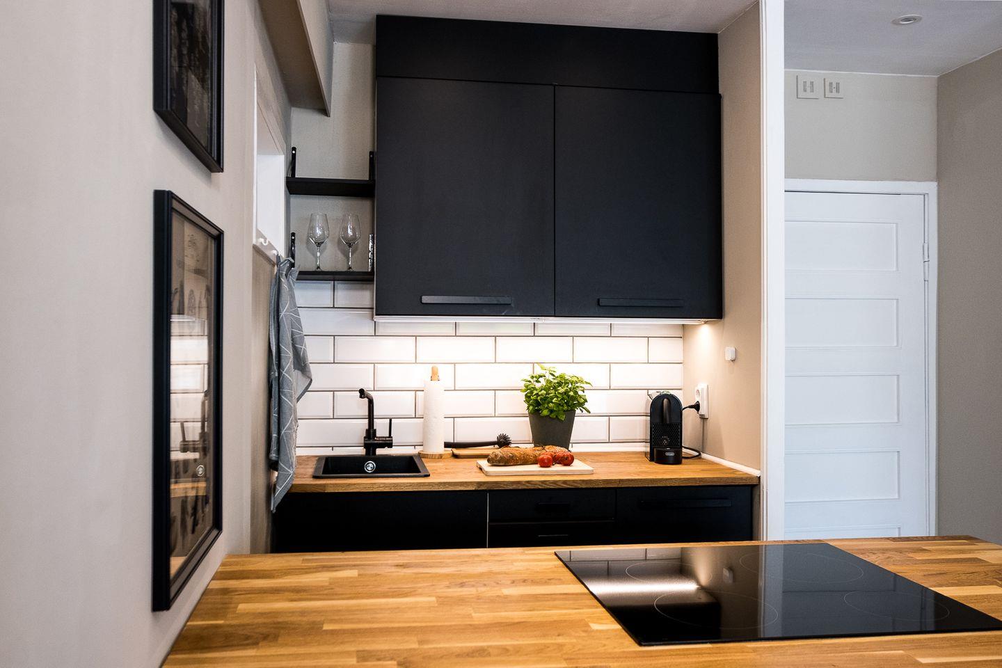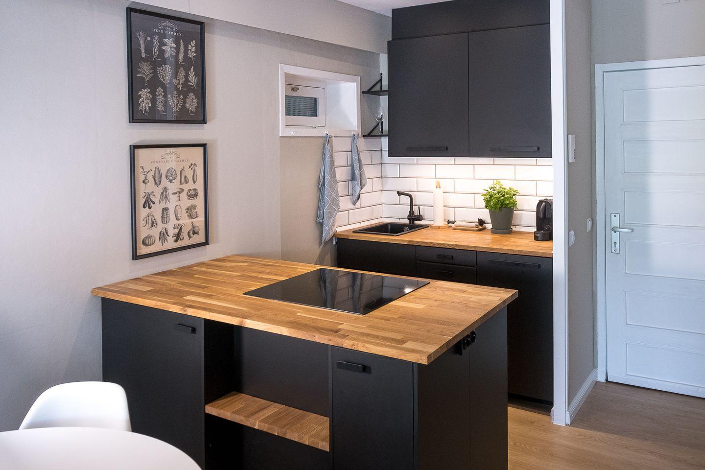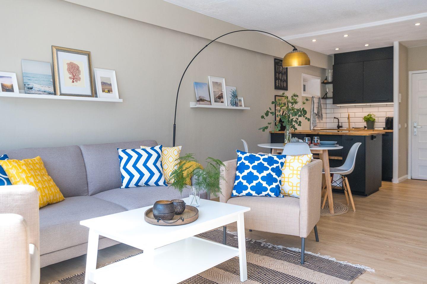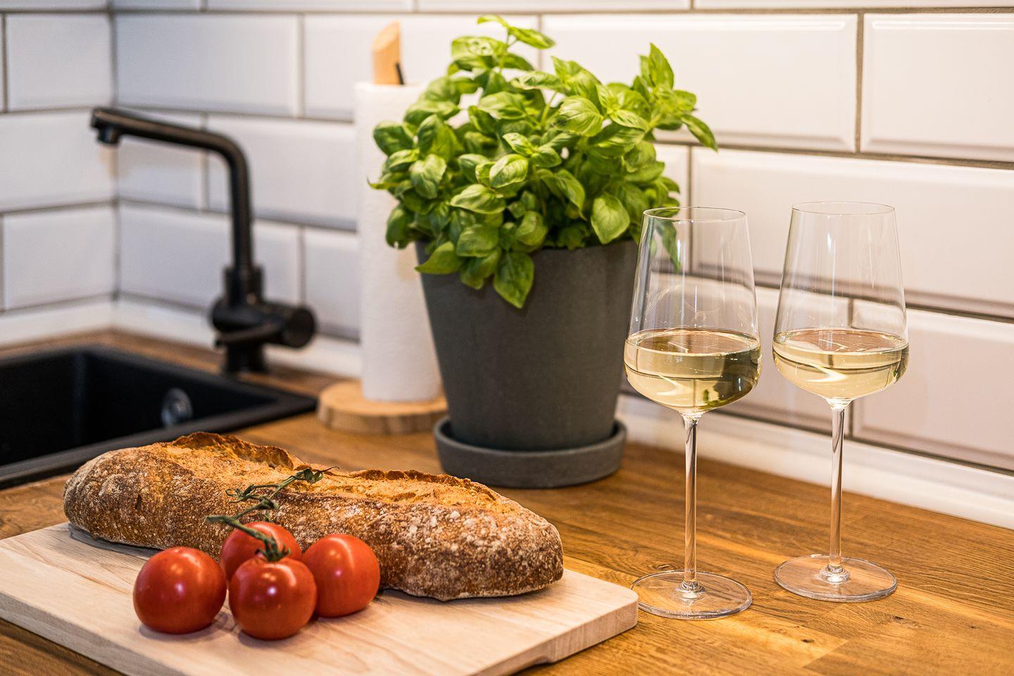 Moderner und gemütlicher Wohn- und Essbereich sowie offene Küche mit Backofen, Geschirrspüler, Kaffeemaschine, Waschtrockner, Kühlschrank und Equipment für 4-6 Personen.