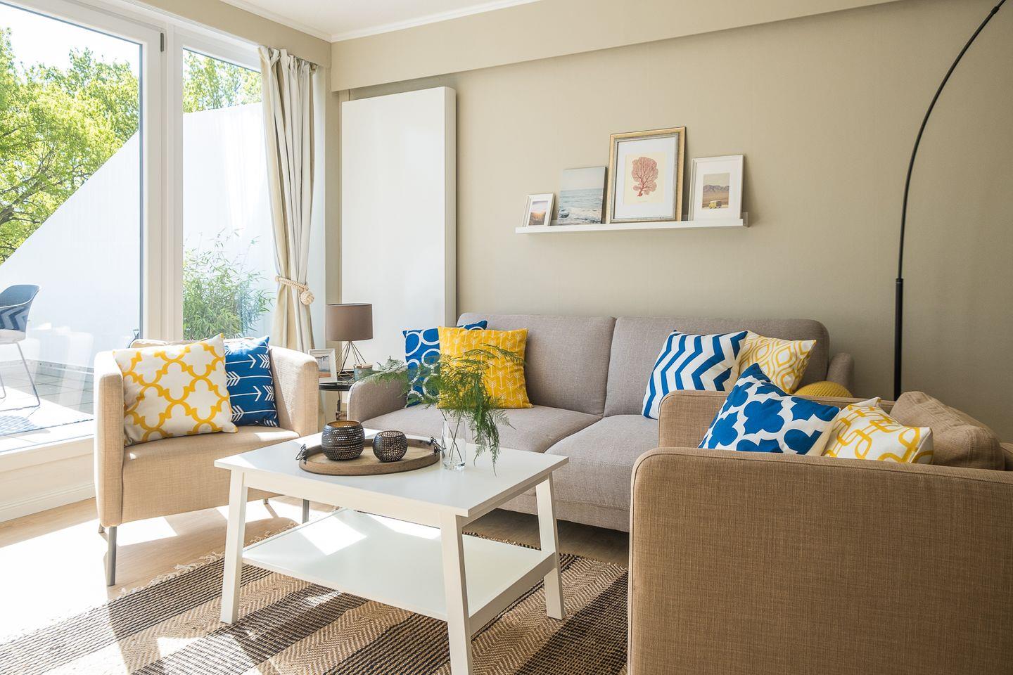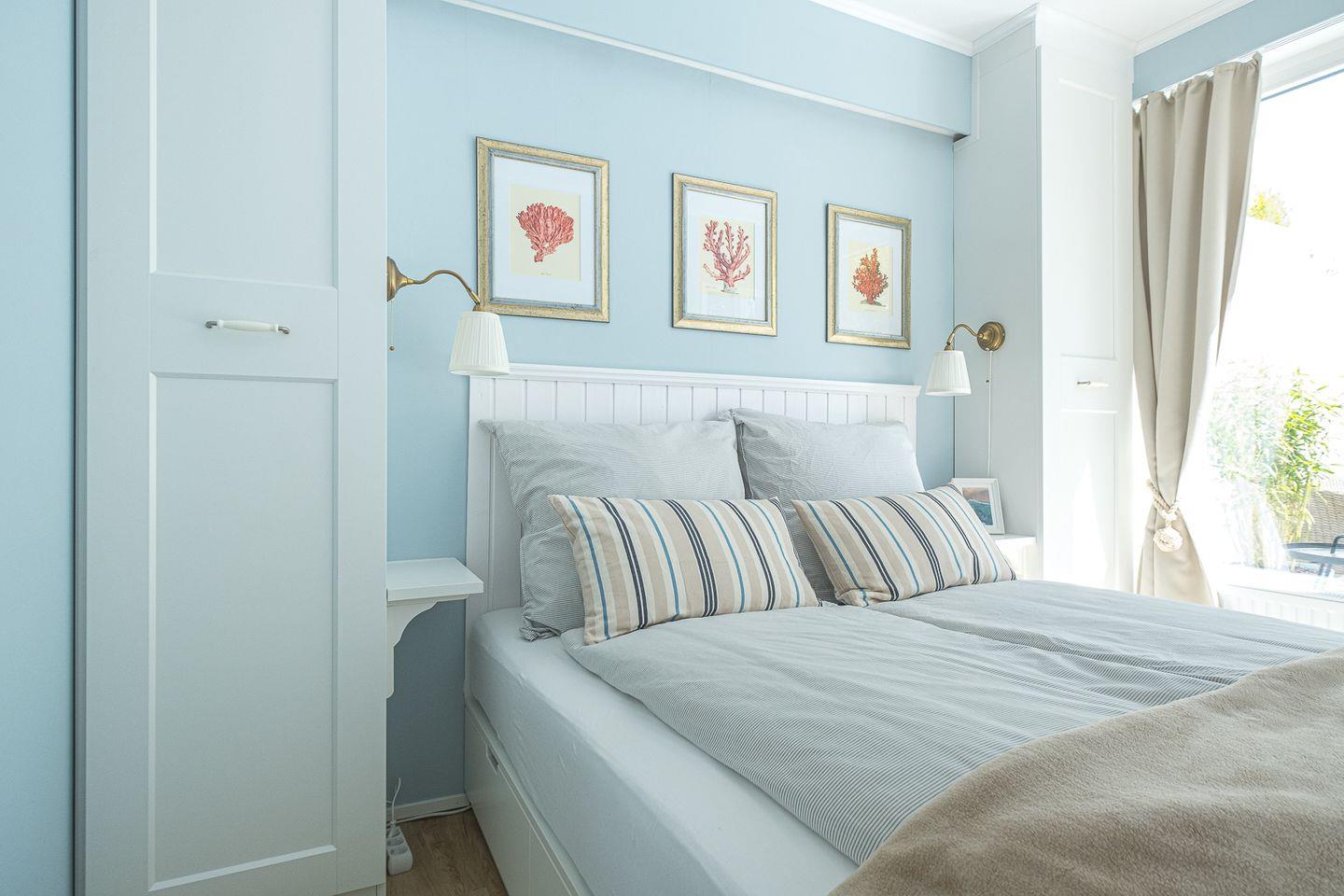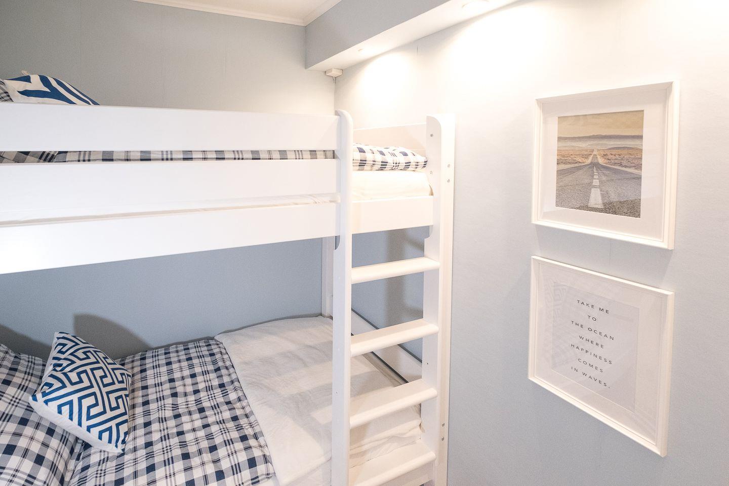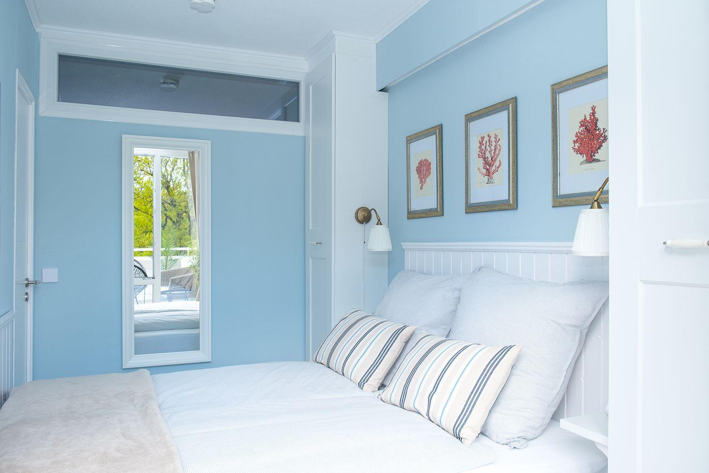Zwei geschmackvolle Schlafzimmer, davon eins mit großen Fenstern zur Terrasse und Doppelbett (160 cm x 200 cm) sowie ein weiteres innenliegendes mit Etagenbett (2 Betten mit je 90 cm x 190 cm). Ein stilvolles Bad mit Duschwanne, Fön, Stauraum und Waschtrockner ergänzt das Wohlfühlen.