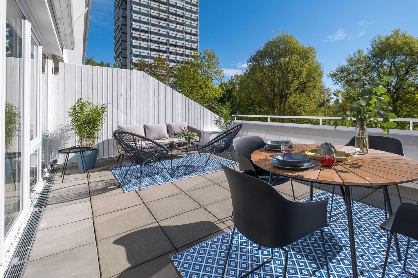 Eine 24 qm große Terrasse mit reichlich Sonne bis zum Nachmittag, wertigen Loungemöbeln, Sitzecke mit Esstisch für 4 Personen und großer Sonnenmarkise.