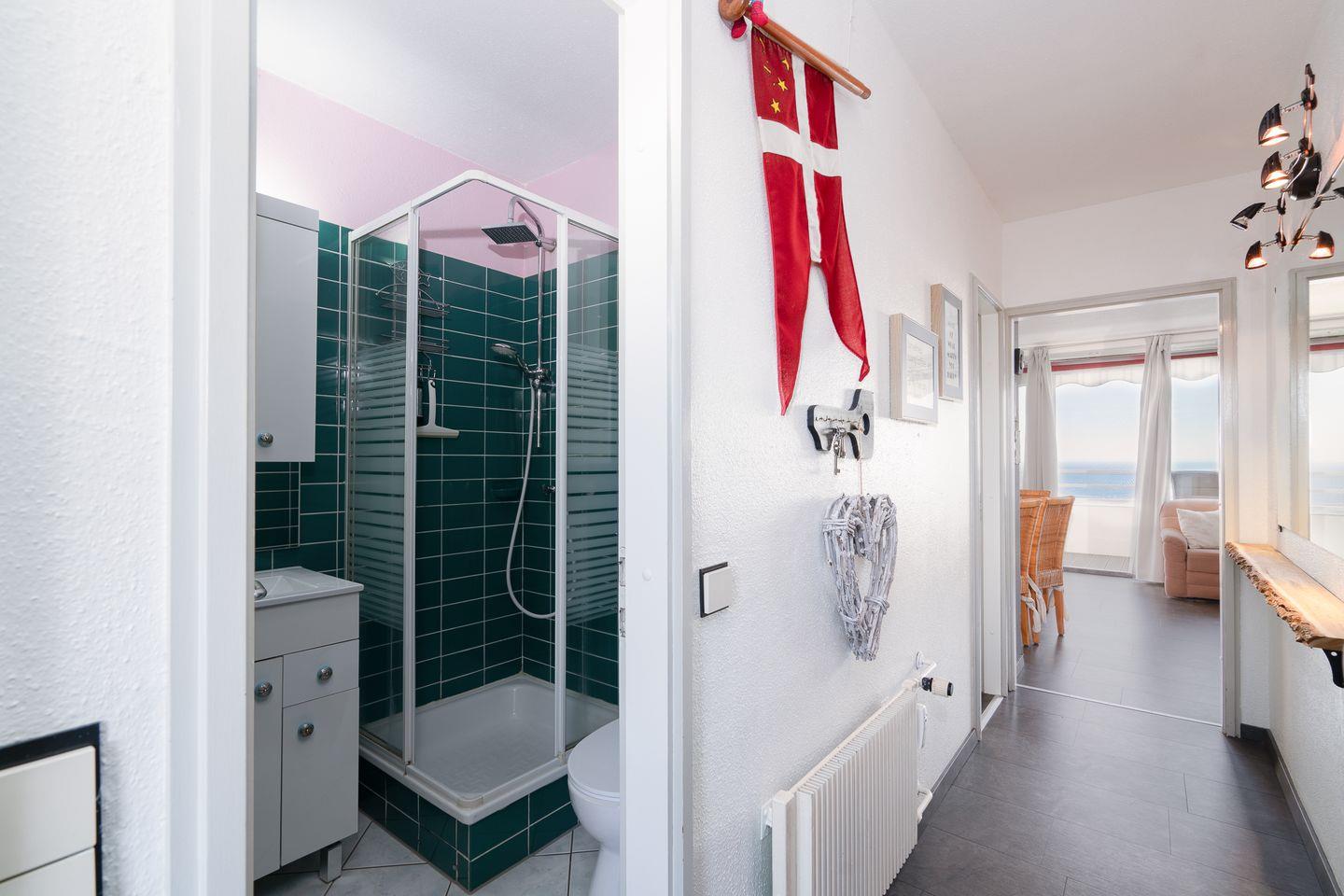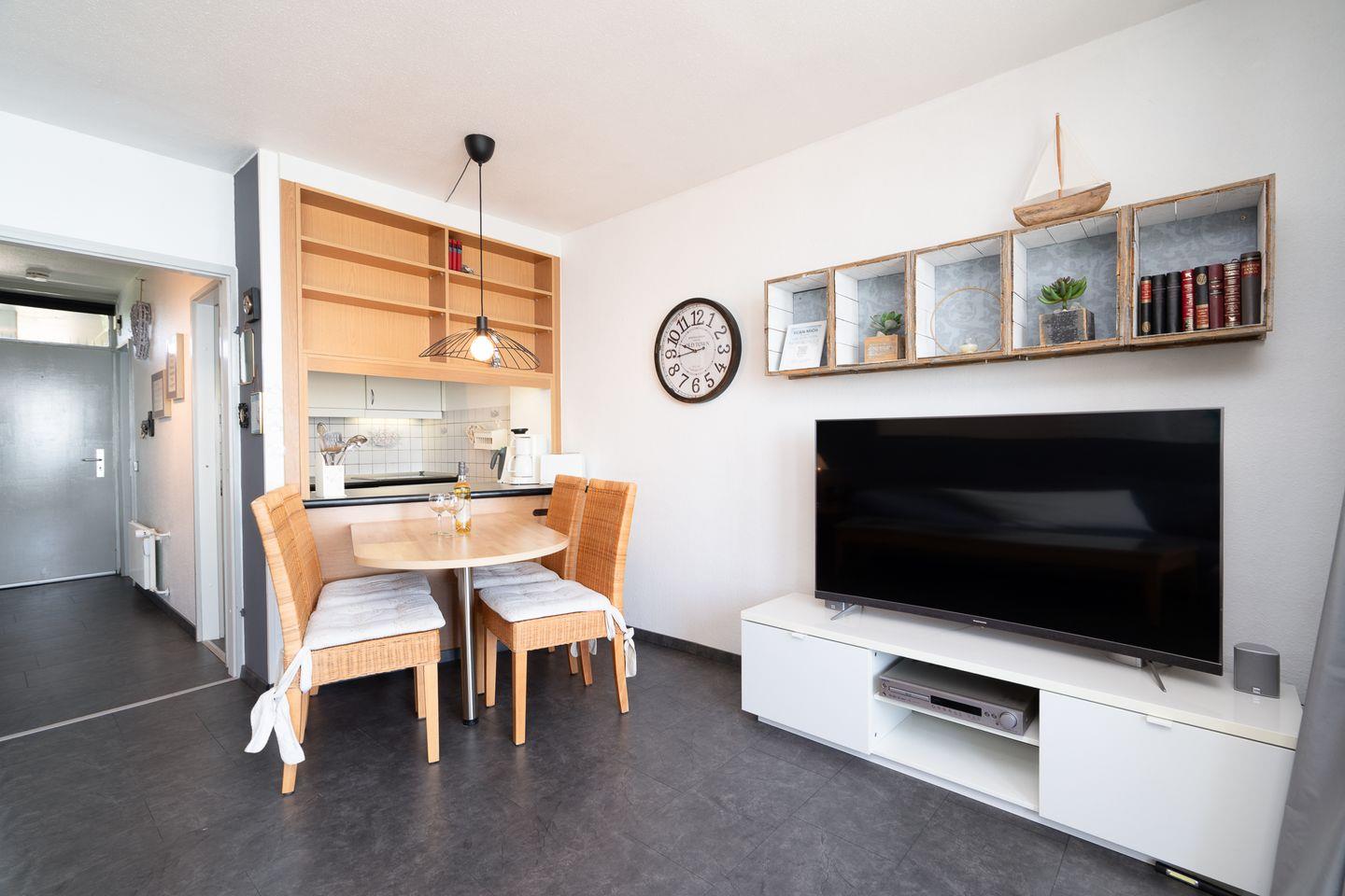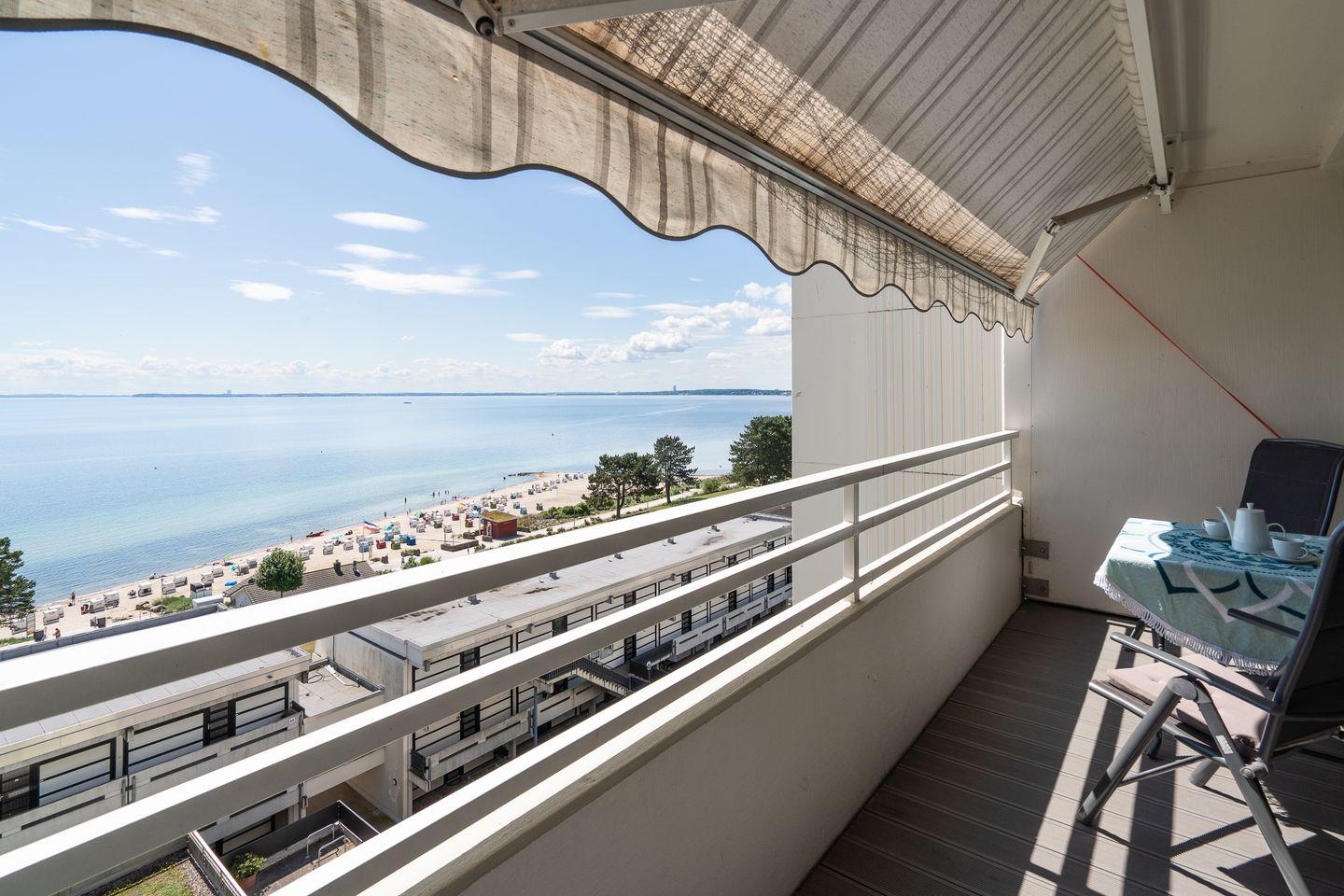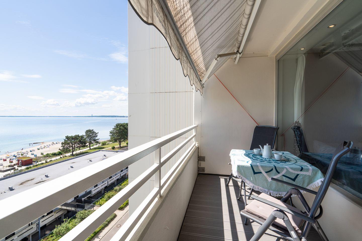 Diese 2-Raum-Ferienwohnung hat einen Balkon in Süd-Ost-Lage mit wunderbarem Blick auf die Ostsee. Vom kombinierten Wohn- und Essbereich haben Sie Zugang zum Balkon. Die Küche ist mit Spülmaschine, Backofen und Herd ausgestattet und mit einer Durchreiche zum Essbereich hin offen. Im Schlafraum stehen zwei Einzelbetten (je 90 cm x 200 cm), die man nicht zusammenschieben kann. Im Wohnbereich steht zudem eine Schlafcouch (160 cm x 200 cm). Es befindet sich ein Oberlicht zum Lüften im Duschbad. Zum Strand sind es nur wenige Fußschritte. PKW-Stellplatz inklusive.