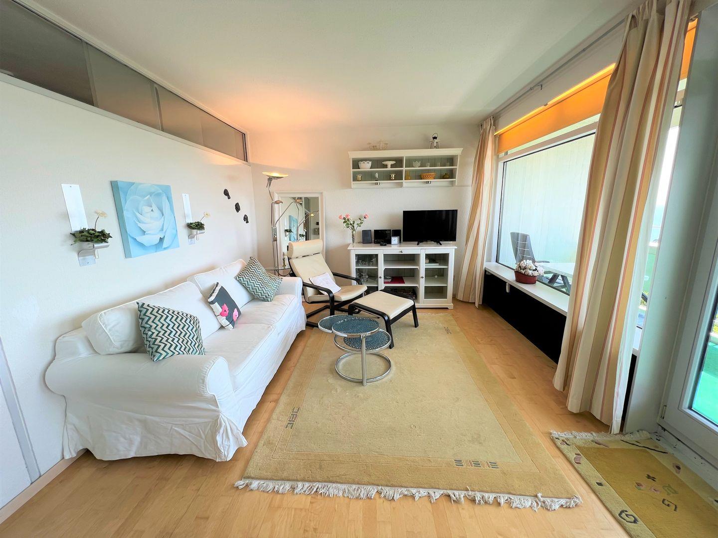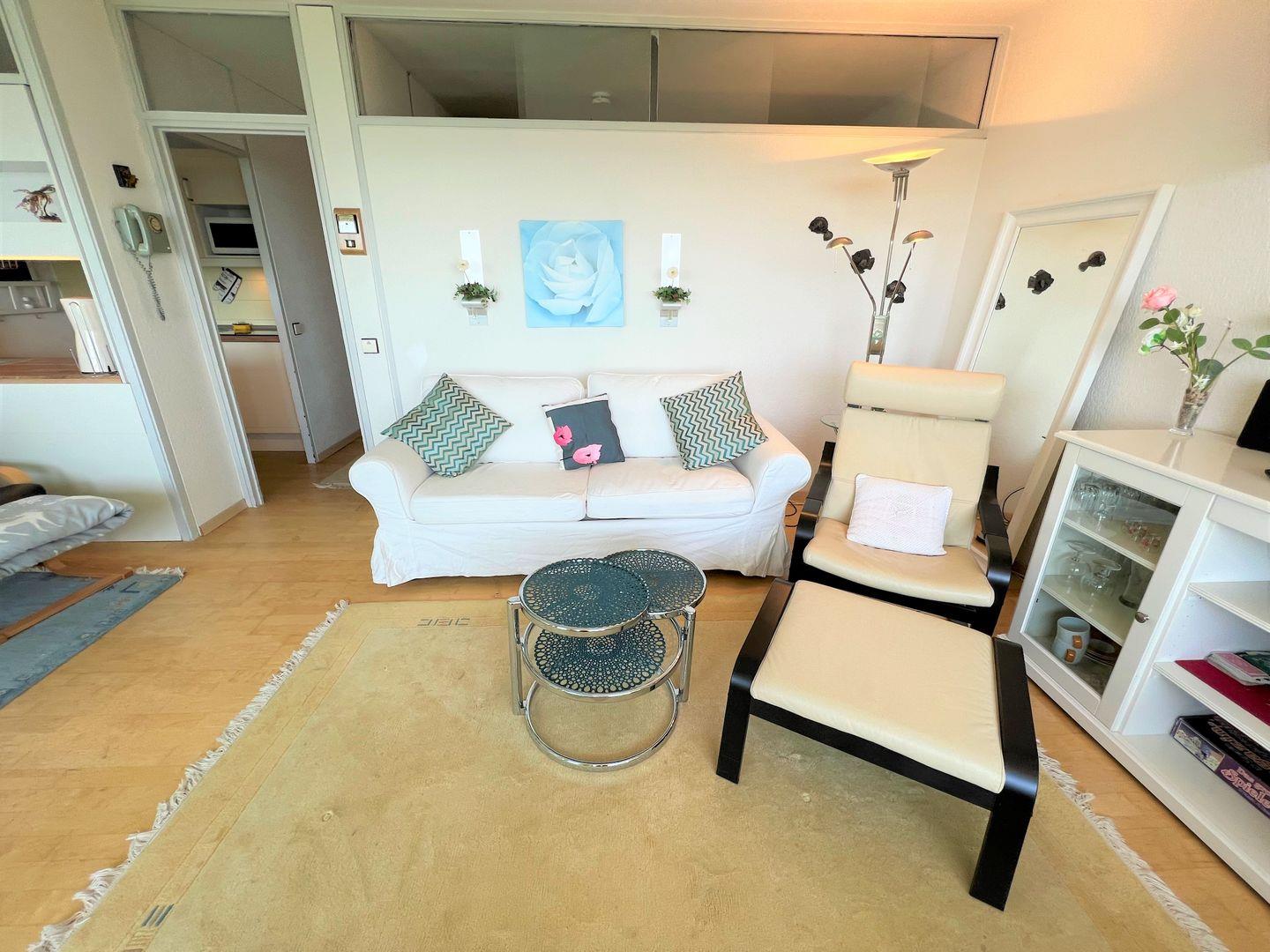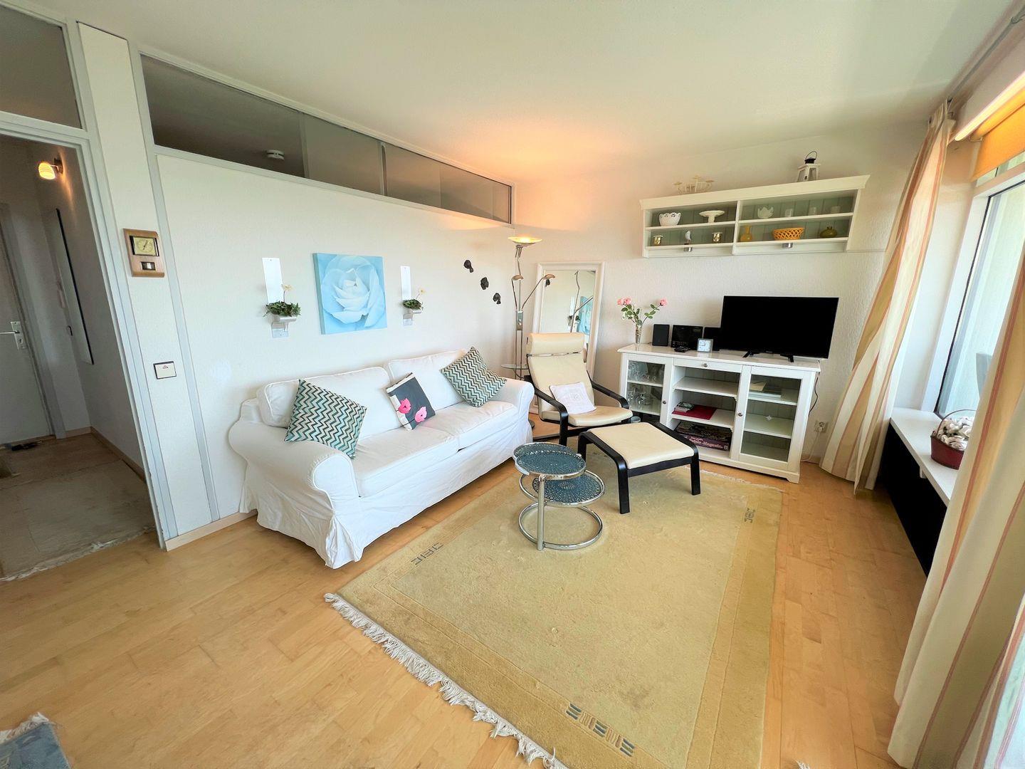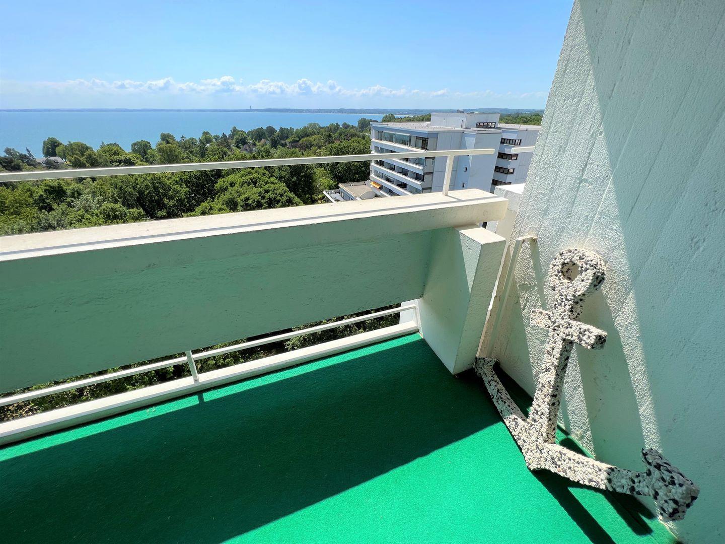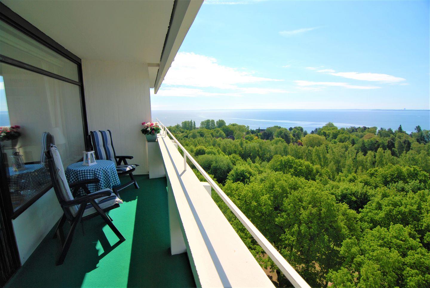 Die 2-Raum-Ferienwohnung befindet sich in Südlage im 9. Stock mit Balkon und wunderschönen Blick über die Lübecker Bucht. Die kleine, aber gut ausgestattete Küche ist mit einer Durchreiche zu kombinierten Wohn- und Essbereich hin offen. Im innenliegenden Schlafraum steht ein Doppelbett. Auf der Schlafcouch im Wohnraum ist Platz für 2 weitere Personen. Das Duschbad ist ebenfalls innenliegend. Die Nutzung des Schwimmbads in der Anlage ist inklusive.