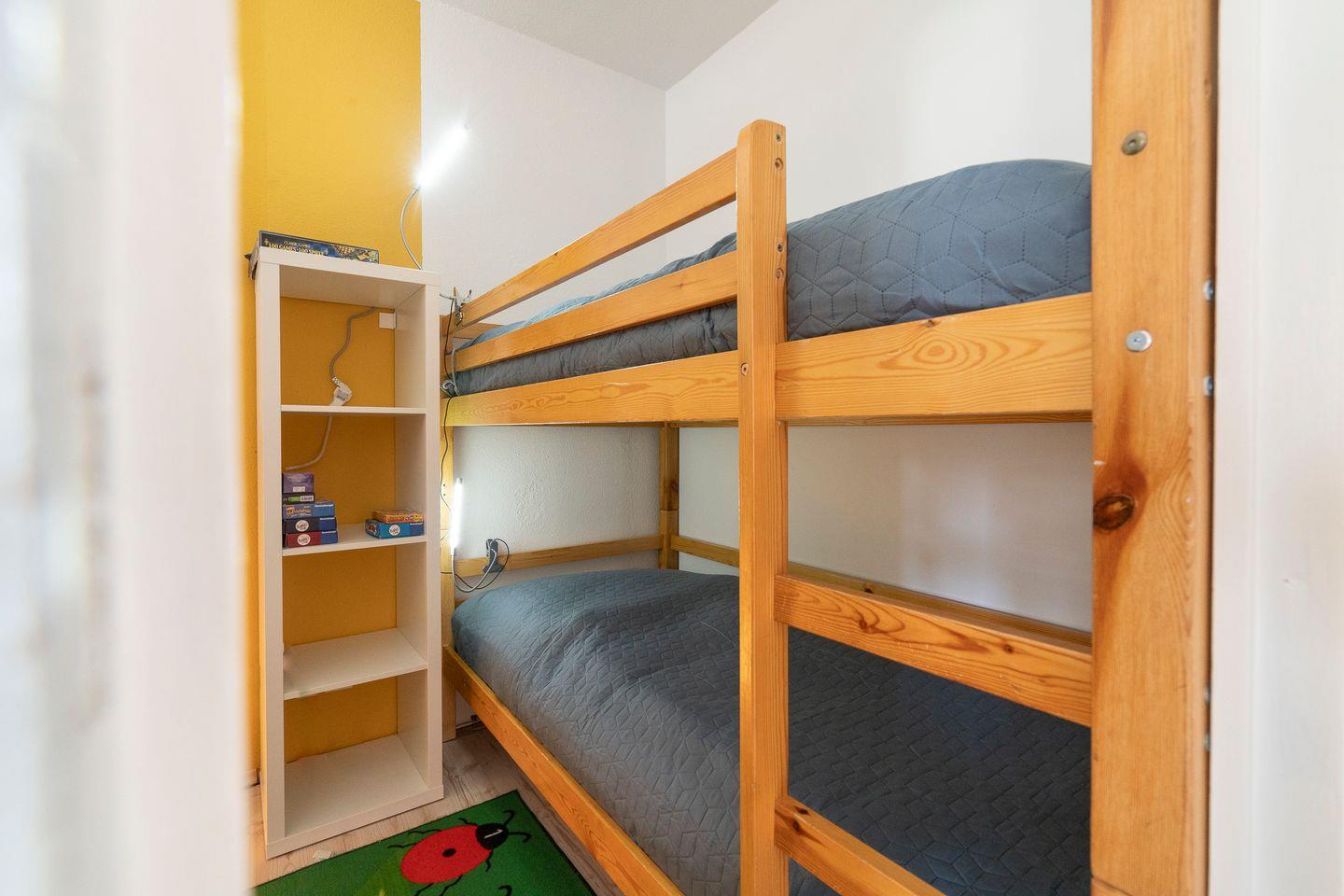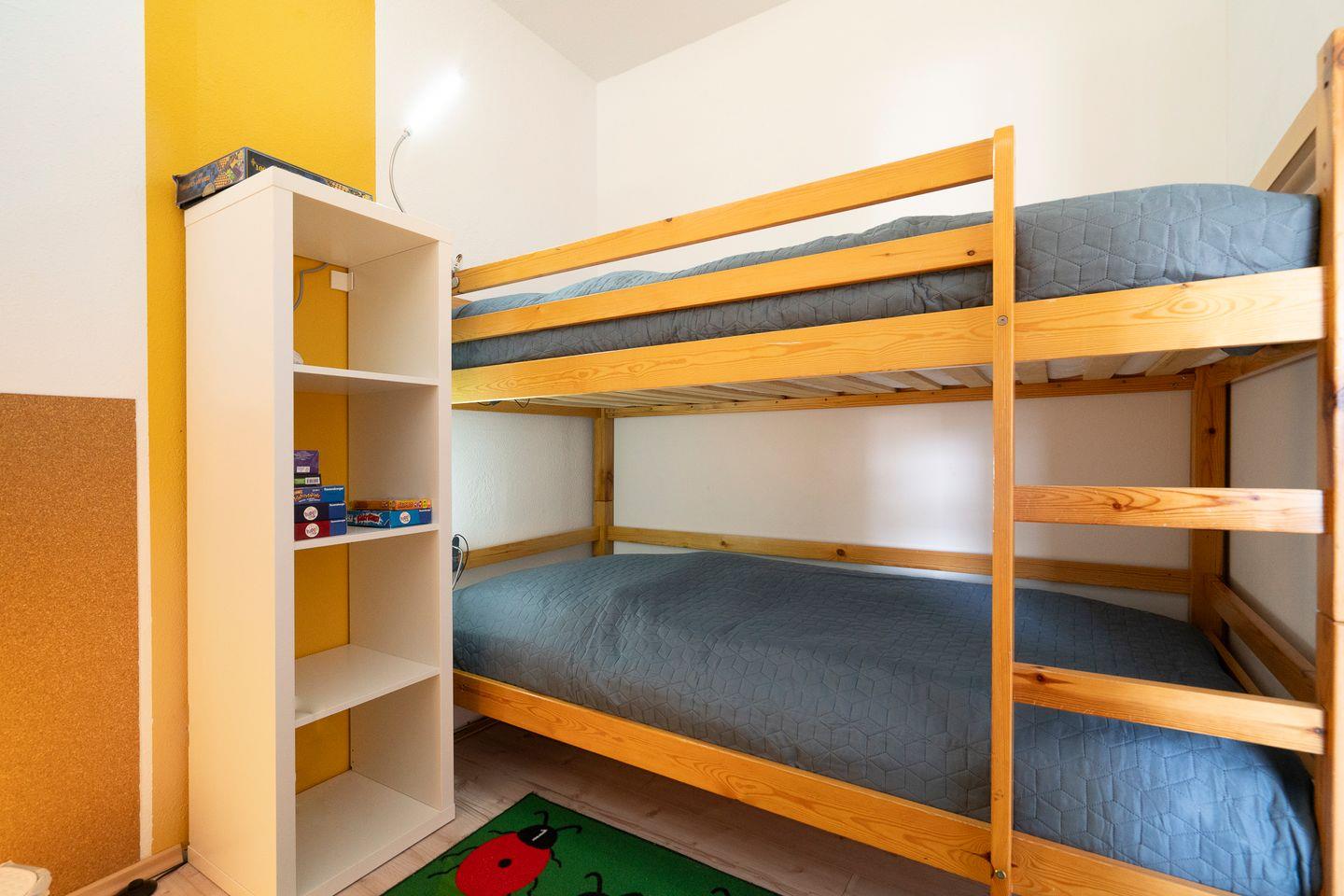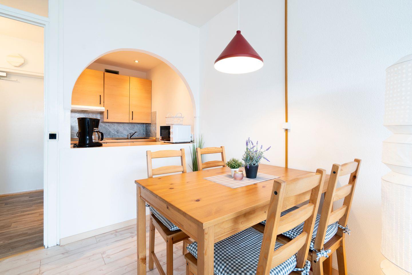 Die 3-Raum- Ferienwohnung liegt in der 1. Etage mit Balkon in ruhiger Ostlage. Die kleine Küche mit Geschirrspüler ist mit einer Durchreiche zum kombinierten Wohn- und Essbereich hin offen. Im ersten Schlafzimmer steht ein Doppelbett, im innenliegenden zweiten Schlafzimmer ein Hochbett. Das Duschbad ist ebenfalls innenliegend. WLAN wird geboten. Die Nutzung des Schwimmbads in der Anlage ist inklusive. Zum Strand sind es nur wenige Gehminuten.