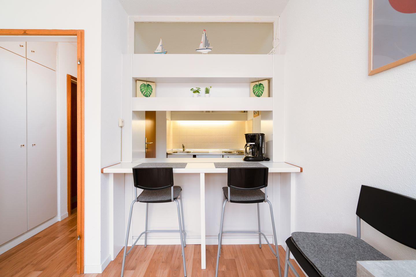 Die 1-Raum-Ferienwohnung Nr. 614 liegt in der Apartmentanlage Ferienpark in der 1. Etage mit einem Balkon und Blick auf den Hansa Park. Im kombinierten Wohn- und Schlafraum steht Ihnen ein Doppelbett und ein Zustellbett zur Verfügung. Die Küche mit Esstresen ist zum Wohnraum hin offen und mit Backofen und Herd ausgestattet. Das Duschbad ist innenliegend. Zum Strand sind es nur wenige Gehminuten. WLAN inklusive.