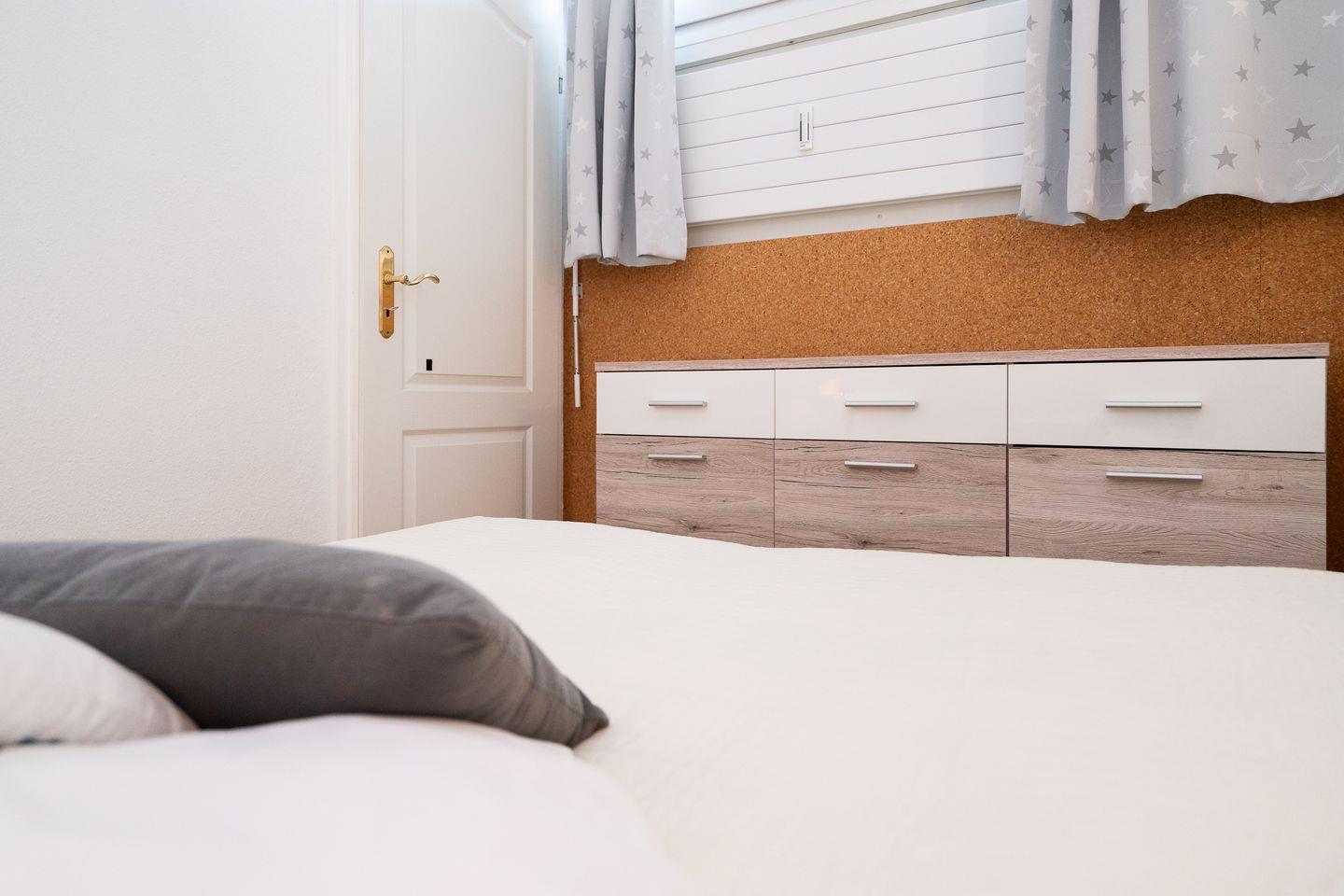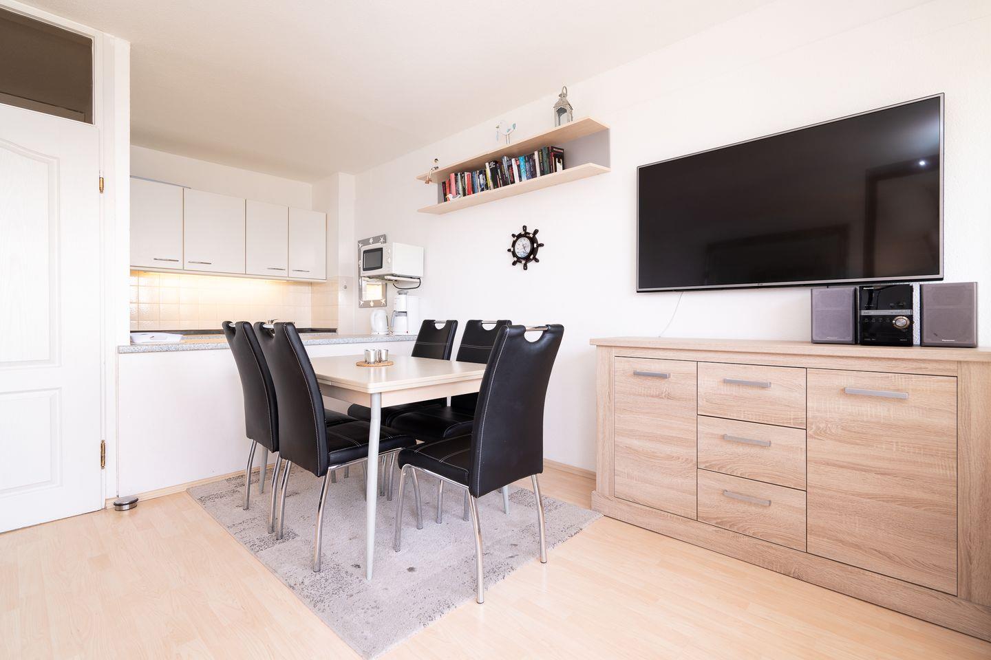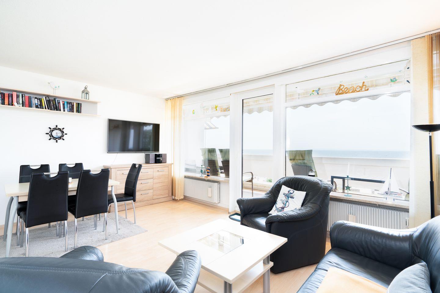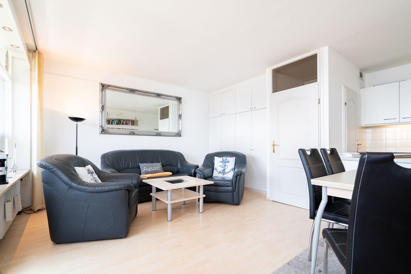 Herzlich willkommen in der 3-Raum-Ferienwohnung Nr. 106. Die Ferienwohnung liegt in der 2. Etage der 1. Reihe der Terrassenhäuser und hat einen wunderbaren Meerblick. Die Wohnung ist für bis zu 4 Personen geeignet und ist der perfekte Ort für einen erholsamen Familienurlaub. Vom kombinierten Wohn- und Essbereich gelangen Sie auf den Balkon mit Markise in Süd-Ost-Lage. Die Küche ist mit Spülmaschine, Herd und Backofen ausgestattet und zum Wohn- und Essbereich hin offen. im ersten Schlafraum steht ein Doppelbett (2x 80 x 195 cm), im zweiten Schlafraum ein Etagenbett (jeweils 85 x 195 cm). Das Duschbad ist innenliegend. Ohne eine Straße zu überqueren sind es zum Strand nur wenige Fußschritte. Der PKW-Stellplatz liegt in Wohnungsnähe und ist inklusive.
