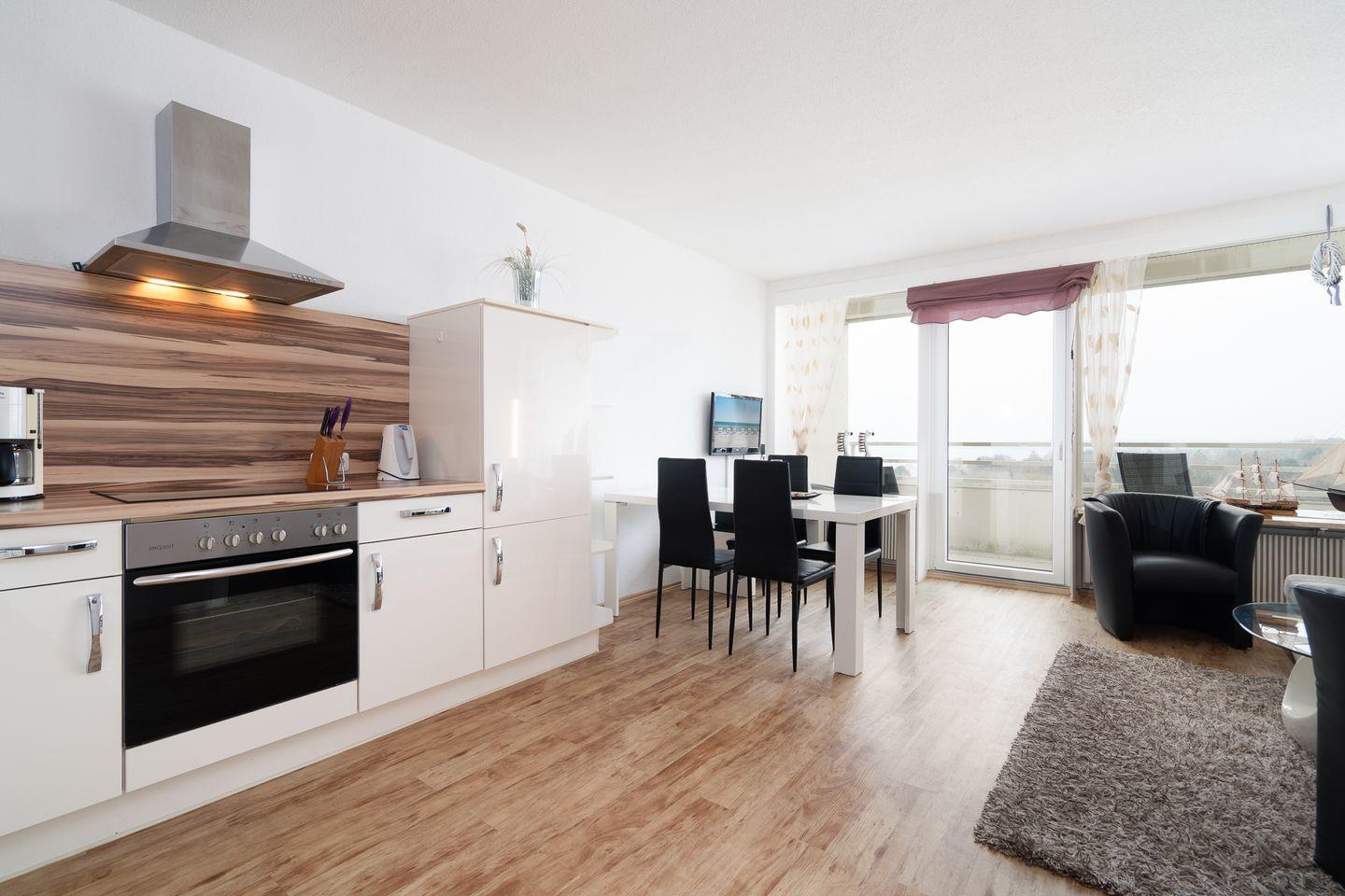 Die 3-Raum-Ferienwohnung Nr. 461 befindet sich in der 11. Etage mit Balkon in Süd-West-Lage und Ostseeblick und ist ideal für Ihren entspannten Familienurlaub am Strand. Die Küche ist mit Geschirrspüler, Backofen und Herd ausgetattet und in den schönen Wohn- und Essbereich integriert. Im ersten Schlafraum befindet sich ein Doppelbett und im Kinderschlafraum ein Etagenbett. Es gibt ein innenliegendes Badezimmer mit Badewanne. Zum Strand sind es nur wenige Gehminuten. WLAN inklusive.