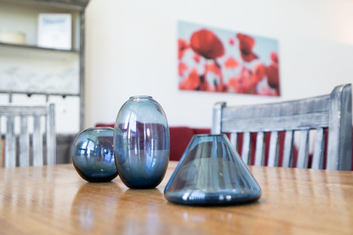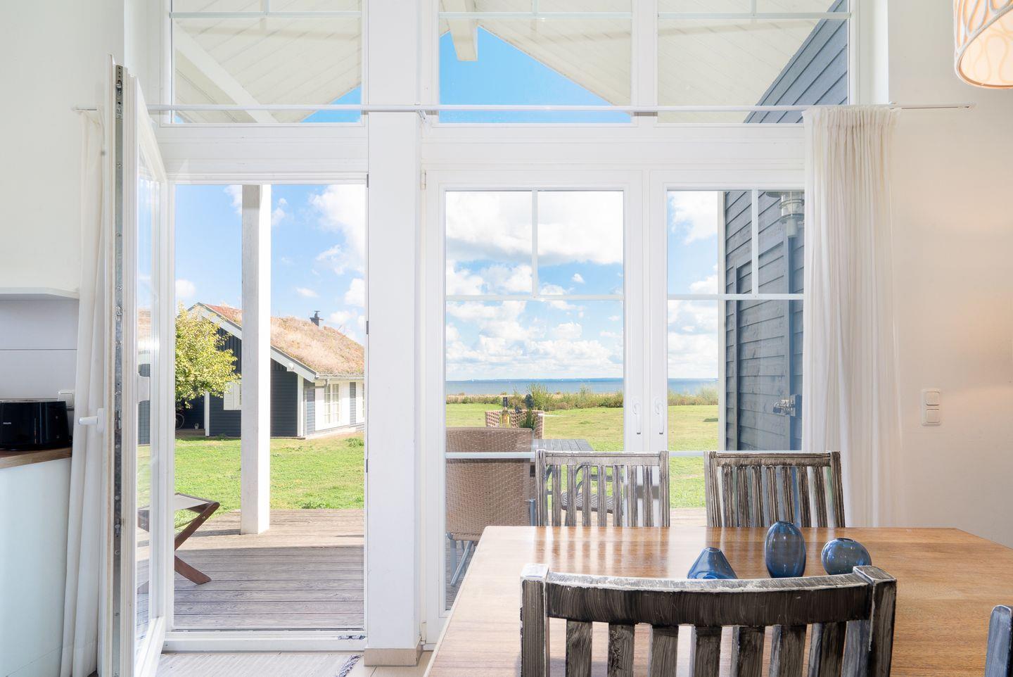 Vom geräumigen Wohn- und Essbereich mit offener Küche und Pelletofen haben Sie Zugang zur Terrasse. Diese verfügt über ausreichend Sitzmöglichkeiten und lädt zum Entspannen und Genießen der Ostseeluft ein - Meerblick inklusive. Der Ofen im Wohnbereich sorgt für gemütliche Stunden mit Freunden und Familie. Die moderne Küche ist mit Backofen, Herd und Spülmaschine voll ausgestattet. Das Haus hat zwei Schlafzimmer, eines mit einem Doppelbett (2x 90 x 200 cm) und eines mit zwei Einzelbetten und einem Zustellbett (jeweils 80 x 190 cm). Das Badezimmer verfügt über eine Badewanne und die Sauna. Der Komfort einer eigenen Sauna wird sehr von unseren Wintergästen geschätzt. Eine eigene Waschmaschine gehört ebenfalls zur Ausstattung des Hauses.