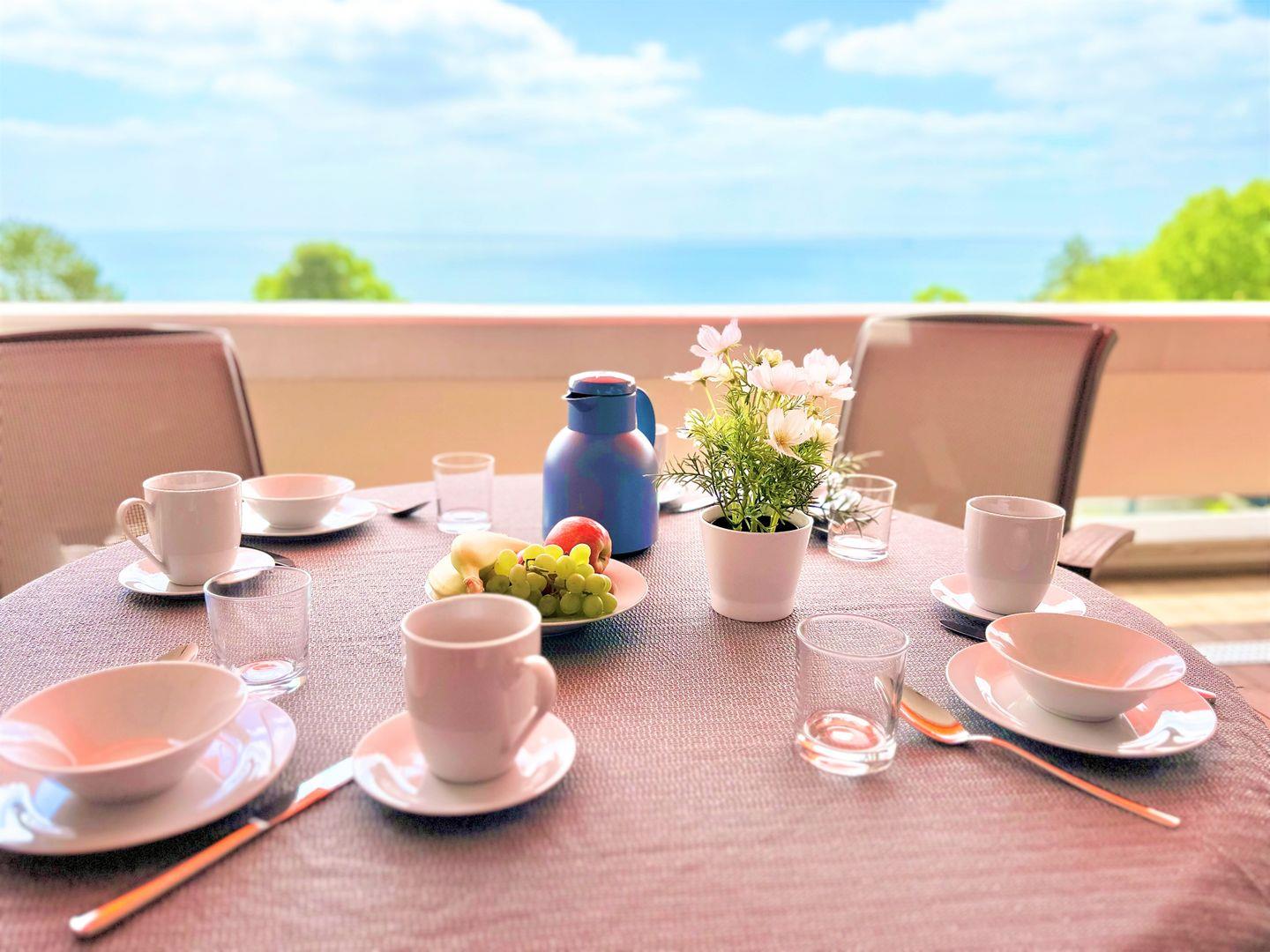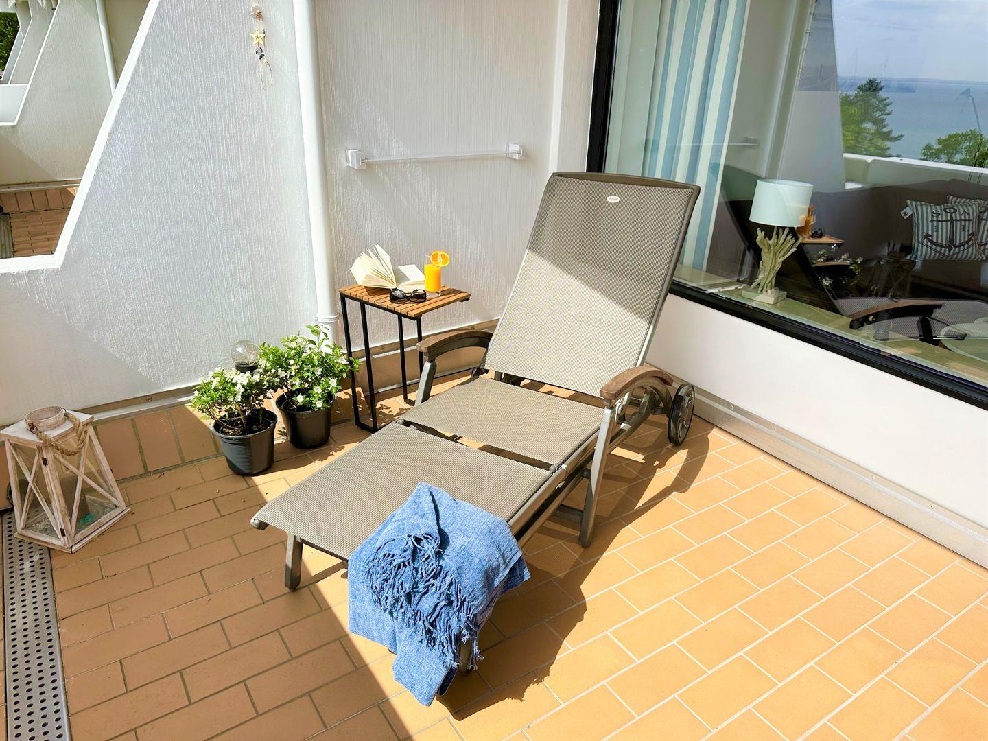 Auf dem 15 qm großen, geschützten und teilüberdachten Süd-Ost-Balkon mit Markise genießen Sie den herrlichen Meerblick über die Lübecker Bucht bis nach Travemünde. Ein großer Tisch mit 4 Stühlen und eine Liege warten auf Sie.