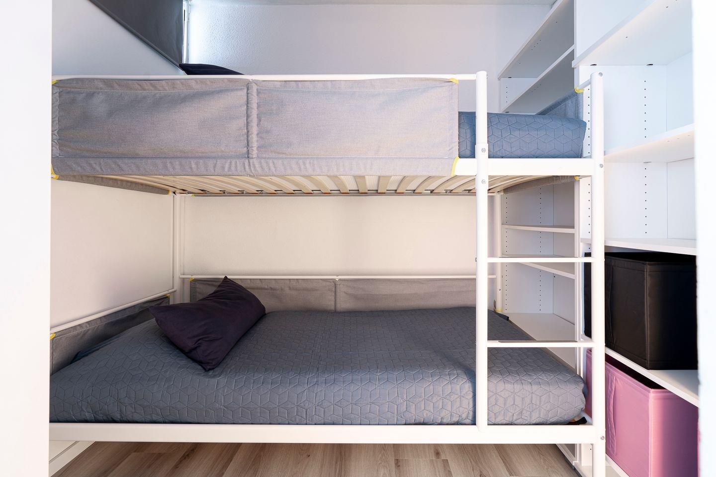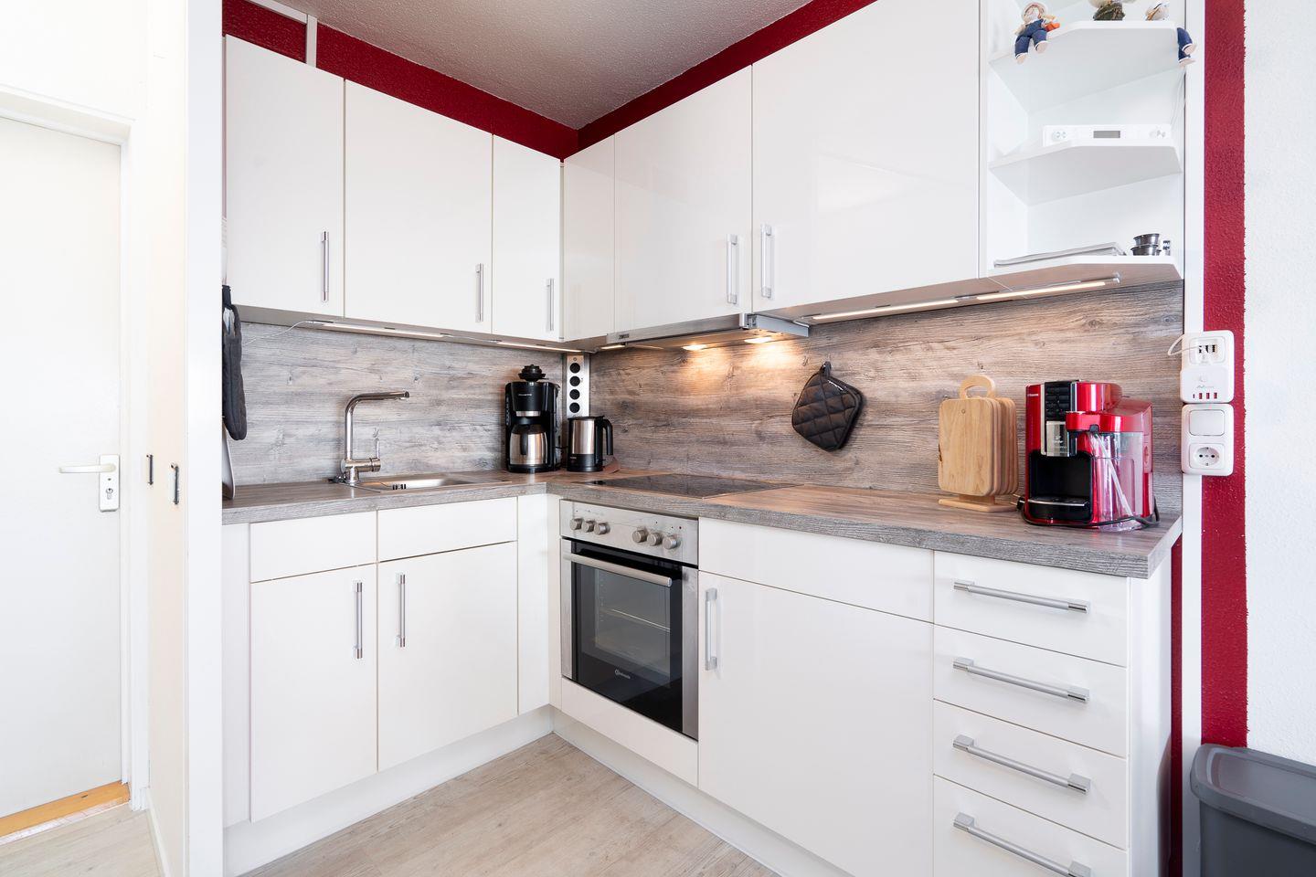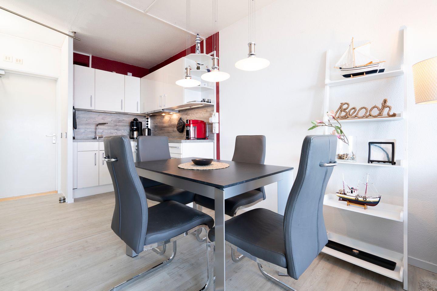 Die Wohnung liegt in der 8. Etage und hat einen Balkon in Ostlage. Von hier aus können Sie nicht nur den Hansapark sehen, sondern auch einen schönen Fernblick auf die Ostsee genießen. Im ersten Schlafraum mit Fensterfront steht ein Doppelbett (2x 90 cm x 200 cm). Das Fenster lässt sich nicht öffnen, gewährt aber Blick auf die Ostsee - aufwachen und das Meer sehen, so kann der Tag beginnen! Im zweiten, innenliegenden Schlafraum steht ein Etagenbett (jeweils 90 cm x 200 cm). Die kleine, moderne Küche ist mit Backofen und Herd ausgestattet und in den Ess- und Wohnbereich integriert. Die Wohnung verfügt über eine eigene Waschmaschine. Das Wannenbad ist innenliegend. Der Strand ist fußläufig in wenigen Minuten zu erreichen. PKW-Stellplatz inklusive.