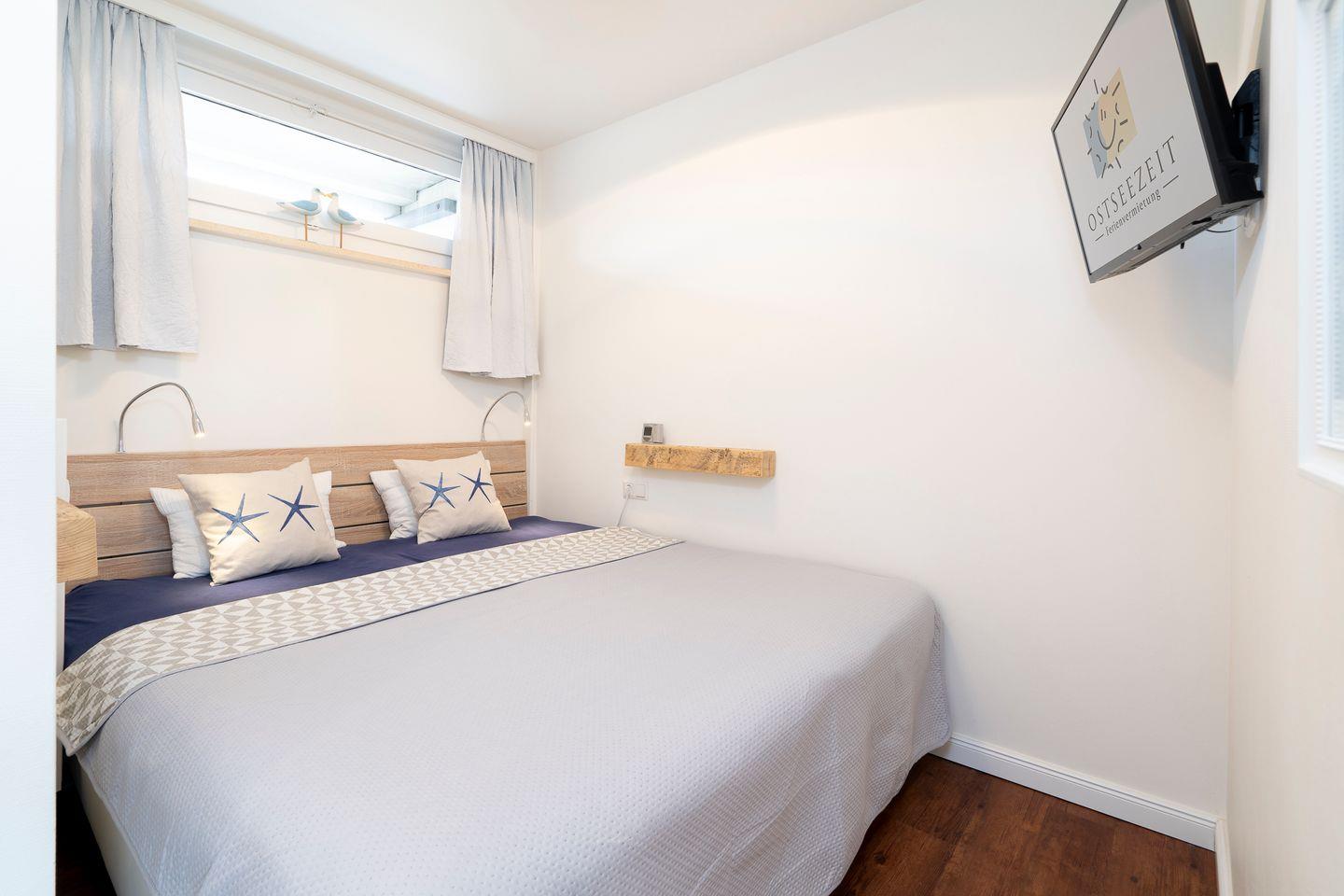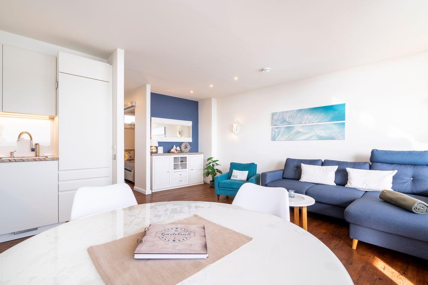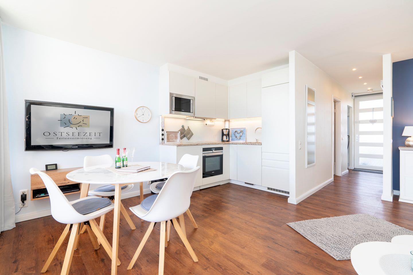 Diese helle und schöne 2-Raum-Ferienwohnung ist das ideale Feriendomizil für Familien. Vom großen Balkon mit Strandkorb können Sie einen wunderbaren Blick auf die Ostsee über die erste Reihe der Flachbauten hinweg genießen. Die moderne Küche ist mit Spülmaschine, Backofen und Herd voll ausgestattet und in den kombinierten Wohn- und Essbereich integriert. Der Schlafraum mit Oberlicht ist mit einem gemütlichen Doppelbett (2x 90 cm x 200 cm) ausgestattet und hat ein zusätzliches TV-Gerät. Viel Stauraum bietet das separate Ankleidezimmer. Der geschmackvoll und freundlich eingerichtete Wohn- und Essbereich ist zudem mit einem Schlafsofa ausgestattet (Liegefläche 120 cm x 200 cm). Das moderne Badezimmer ist innenliegend und hat eine bodentiefe Dusche. Ohne eine Straße zu überqueren sind es zum Strand nur wenige Fußschritte. PKW-Stellplatz inklusive.
