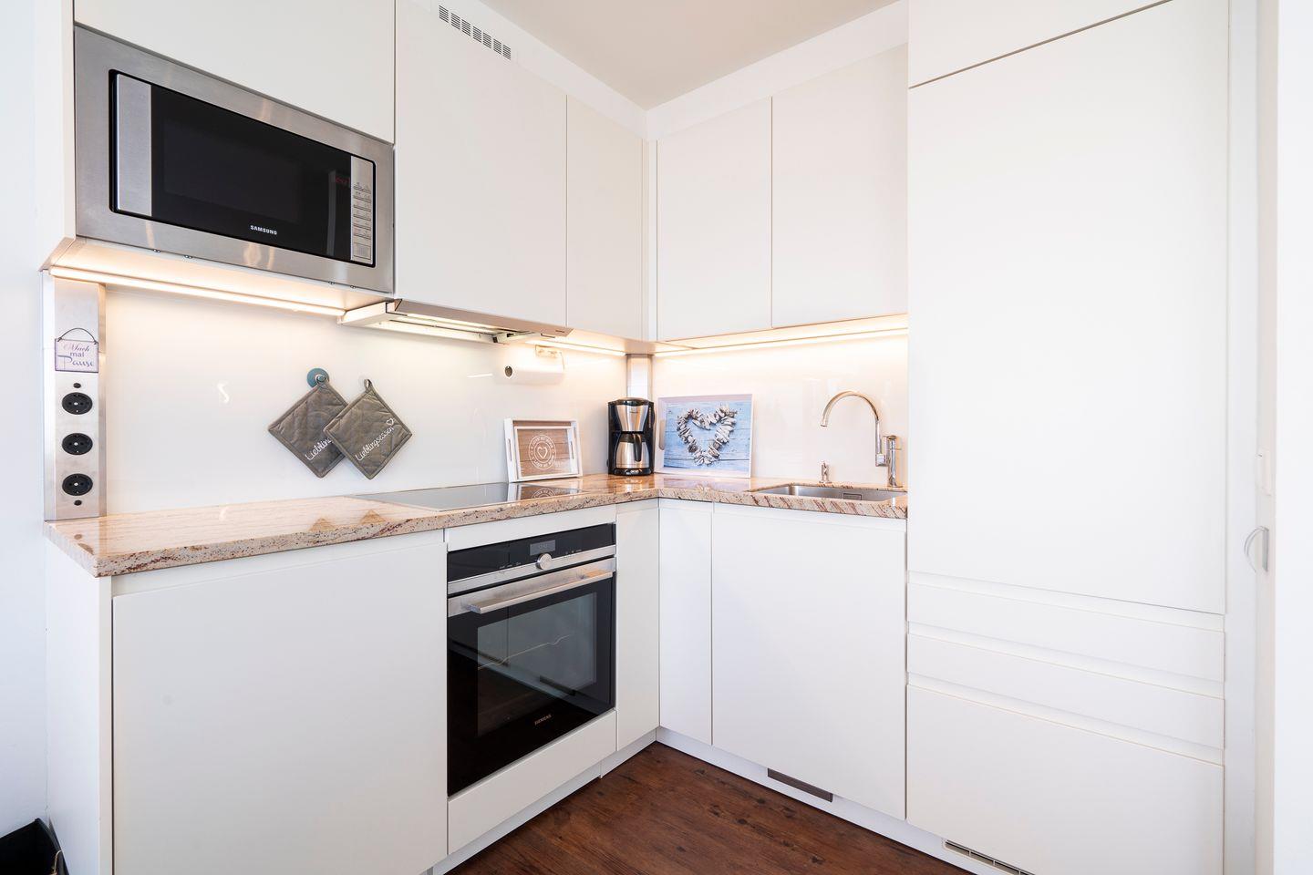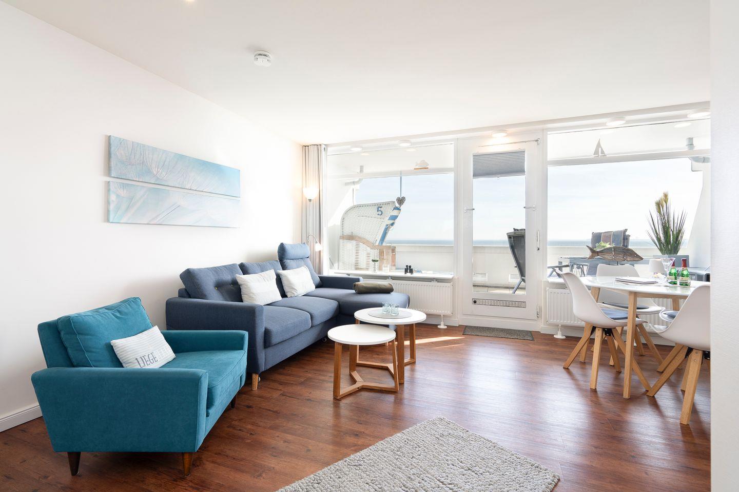 Die modern und geschmackvoll eingerichtete Ferienwohnung Nr. 212 ist ideal für Ihren Familienurlaub. Vom Balkon mit Strandkorb haben Sie einen schönen Meerblick. Die mit Spülmaschine, Backofen und Herd ausgestattete Küche ist in den Wohn-/Essbereich integriert. Der Schlafraum mit einem gemütlichen Doppelbett hat ein zusätzliches TV-Gerät. Der Wohn-/Essbereich verfügt über ein Schlafsofa. Das Bad mit bodentiefer Dusche ist innenliegend. Zum Strand sind es nur wenige Fußschritte. WLAN inklusive.
