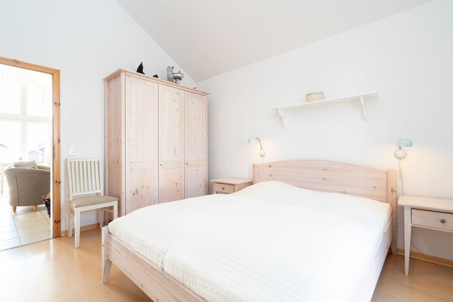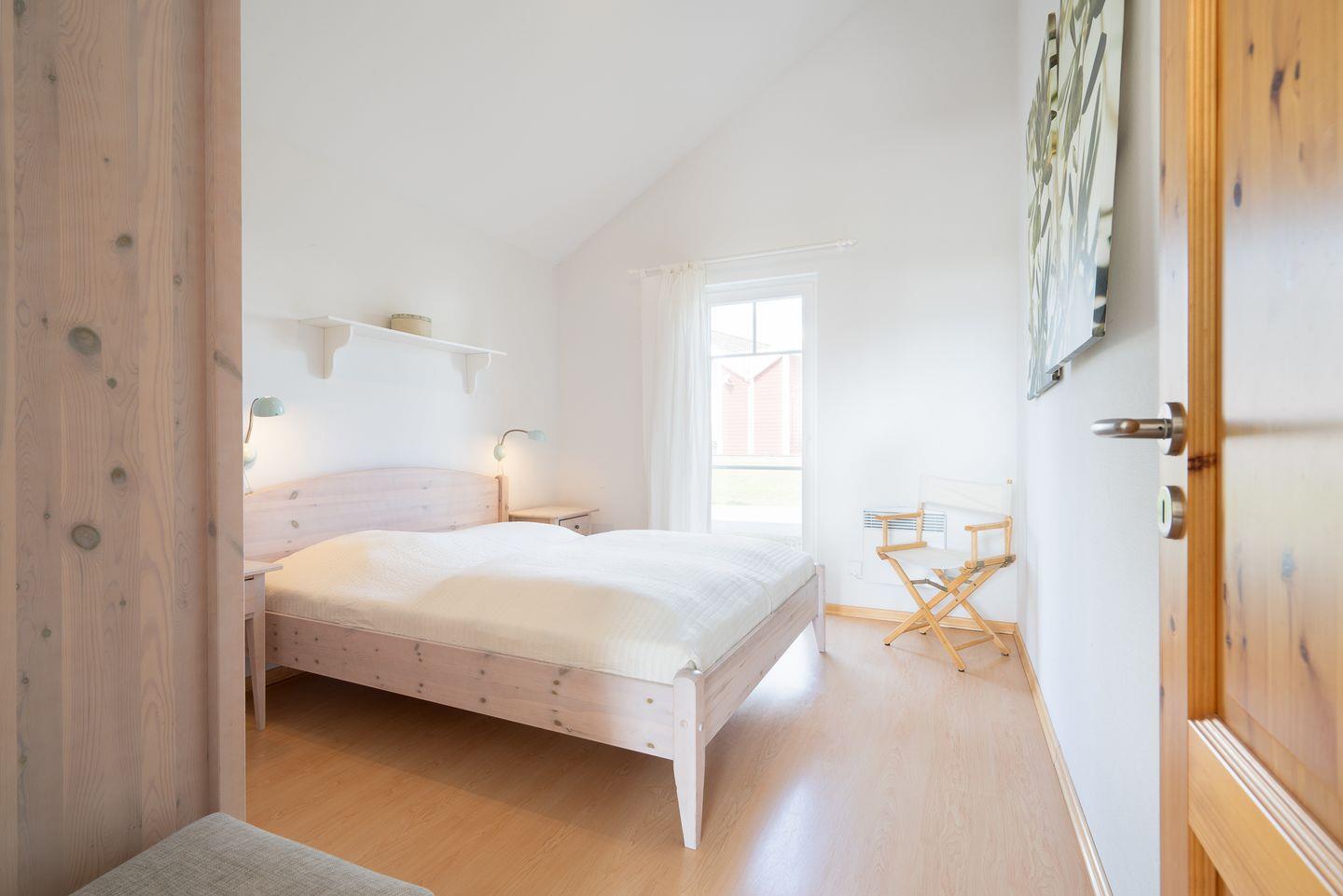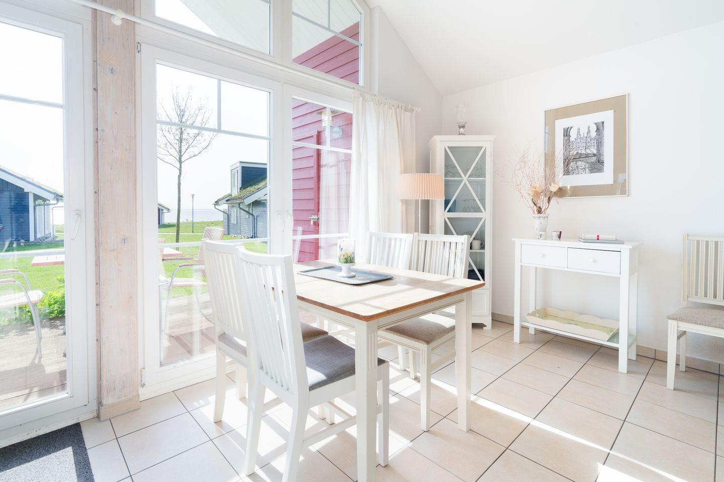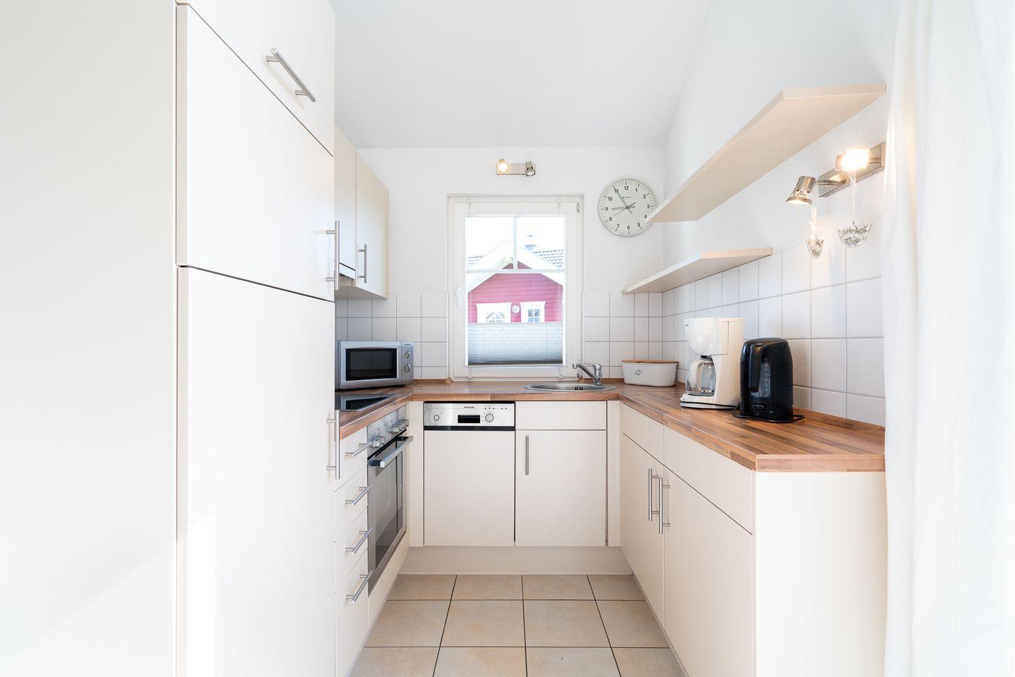 Auf einer Ebene stehen Ihnen ein Schlafraum und ein geräumiger Wohnraum mit Kamin und Zugang zur Terrasse mit Meerblick zur Verfügung, die Ostsee können Sie durch andere Häuser hindurch sehen. Die zum Essbereich hin offene, moderne Küche ist mit Geschirrspülmaschine, Herd und Mikrowelle voll ausgestattet. Der Kaminofen im Wohnbereich sorgt für gemütliche Stunden. Im Schlafraum steht ein Doppelbett. Im Bad finden Sie die Sauna, Waschmaschine, sowie eine Badewanne. Der Komfort einer eigenen Sauna wird sehr von unseren Wintergästen geschätzt. Die Beheizung erfolgt über Elektroheizungen und den Kamin.