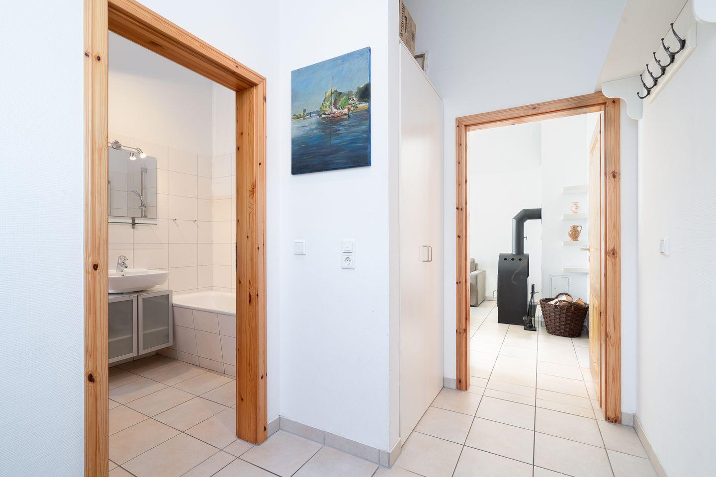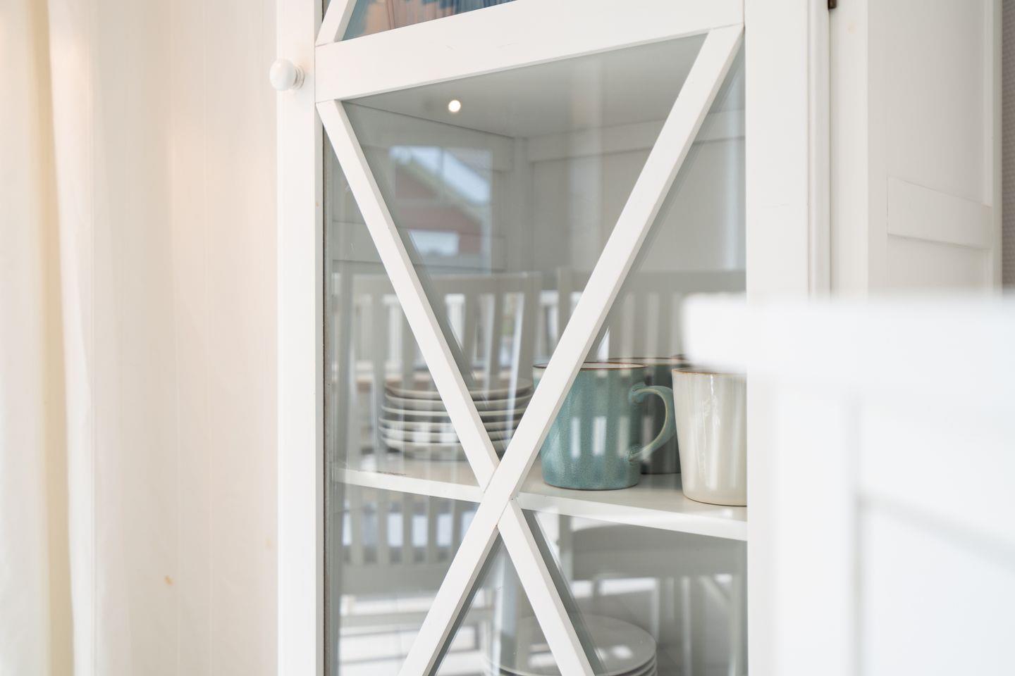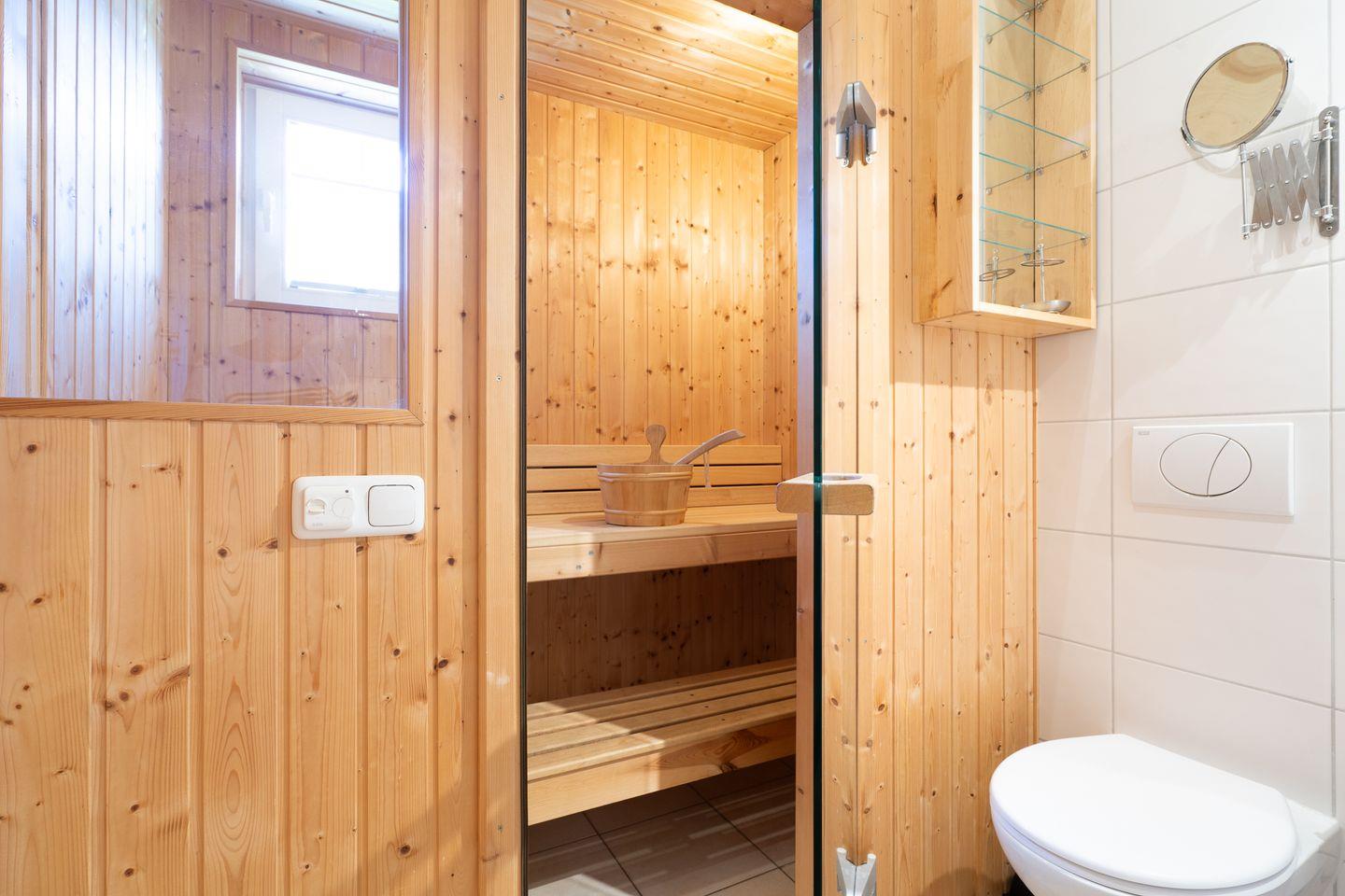 Auf einer Ebene stehen Ihnen ein Schlafraum und ein geräumiger Wohnraum mit Kamin und Zugang zur Terrasse mit Meerblick zur Verfügung, die Ostsee können Sie durch andere Häuser hindurch sehen. Die zum Essbereich hin offene, moderne Küche ist mit Geschirrspülmaschine, Herd und Mikrowelle voll ausgestattet. Der Kaminofen im Wohnbereich sorgt für gemütliche Stunden. Im Schlafraum steht ein Doppelbett. Im Bad finden Sie die Sauna, Waschmaschine, sowie eine Badewanne. Der Komfort einer eigenen Sauna wird sehr von unseren Wintergästen geschätzt. Die Beheizung erfolgt über Elektroheizungen und den Kamin.