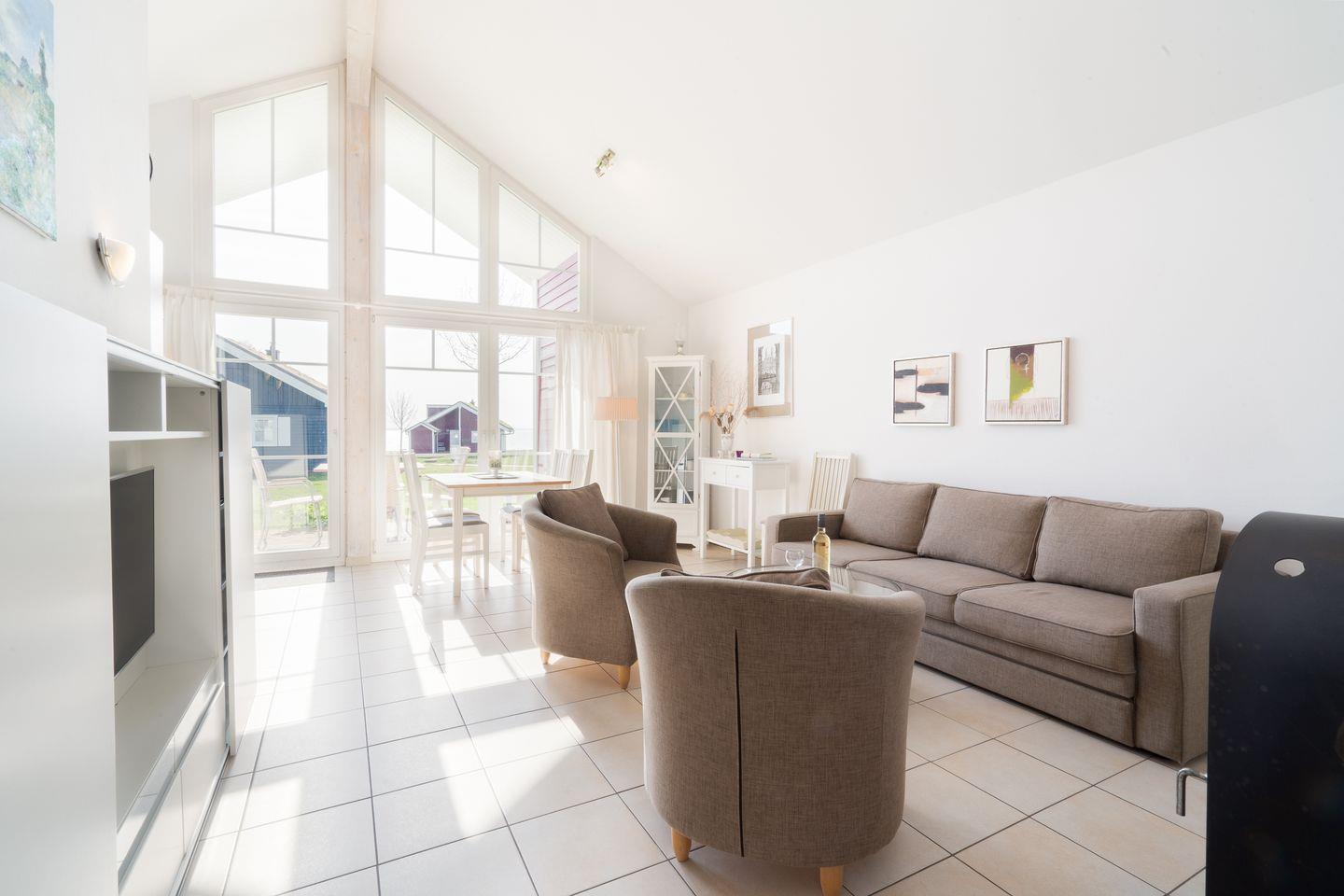 Die komfortable Bungalowhälfte Nr. 86 liegt in der Strandpark-Anlage und ist für 2 Personen geeignet. Vom geräumigen Wohnraum mit Kamin und offener, voll ausgestatteter Küche haben Sie Zugang zur Terrasse mit Ostseeblick an anderen Häusern vorbei. Im Schlafraum steht ein Doppelbett. Das Bad ist mit Badewanne, Sauna und Waschmaschine ausgestattet. WLAN ist inklusive.