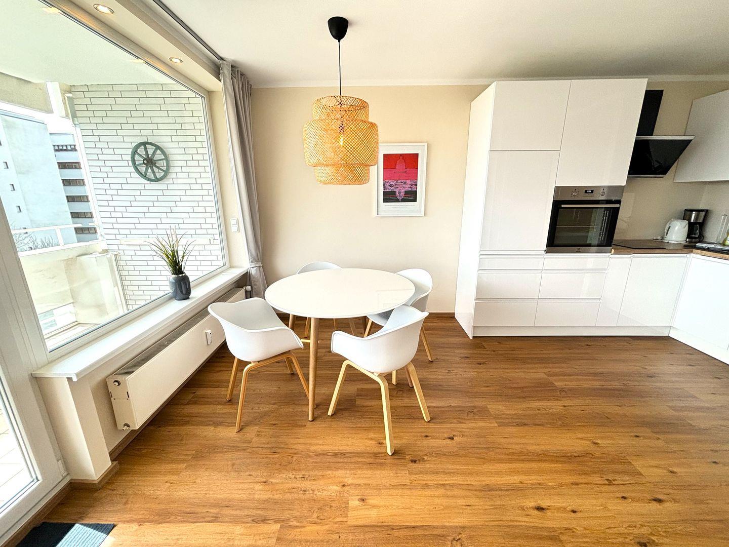 Die helle und moderne 2-Raum-Ferienwohnung liegt in der 4. Etage und ist für 4 Personen geeignet. Vom kombinierten Wohn- und Essbereich mit offener Küche haben Sie Zugang zum Balkon. Die Küche ist mit Backofen, Herd und Spülmaschine ausgestattet. Der Schlafraum ist mit einem Doppelbett ausgestattet. Zudem steht ein Schlafsofa im Wohnbereich. Das Bad verfügt über eine Dusche. Zum Strand sind es nur wenige Gehminunten. WLAN inklusive.