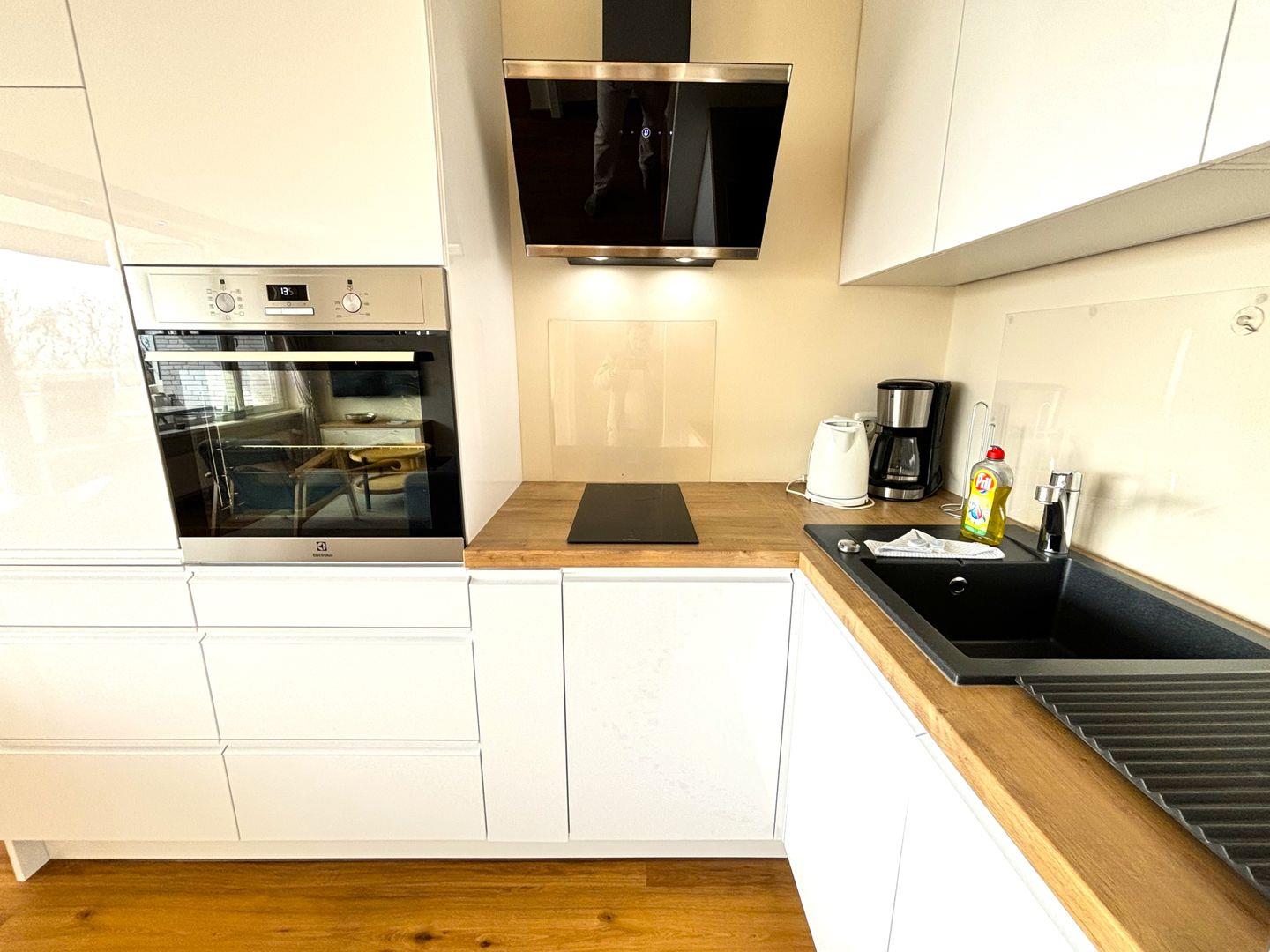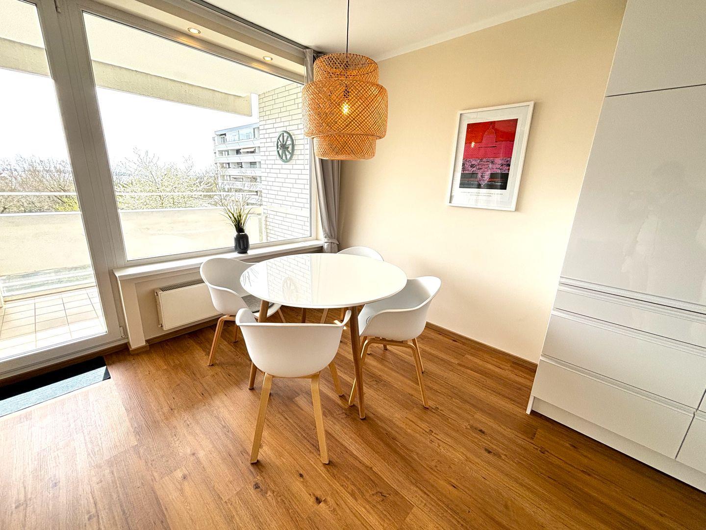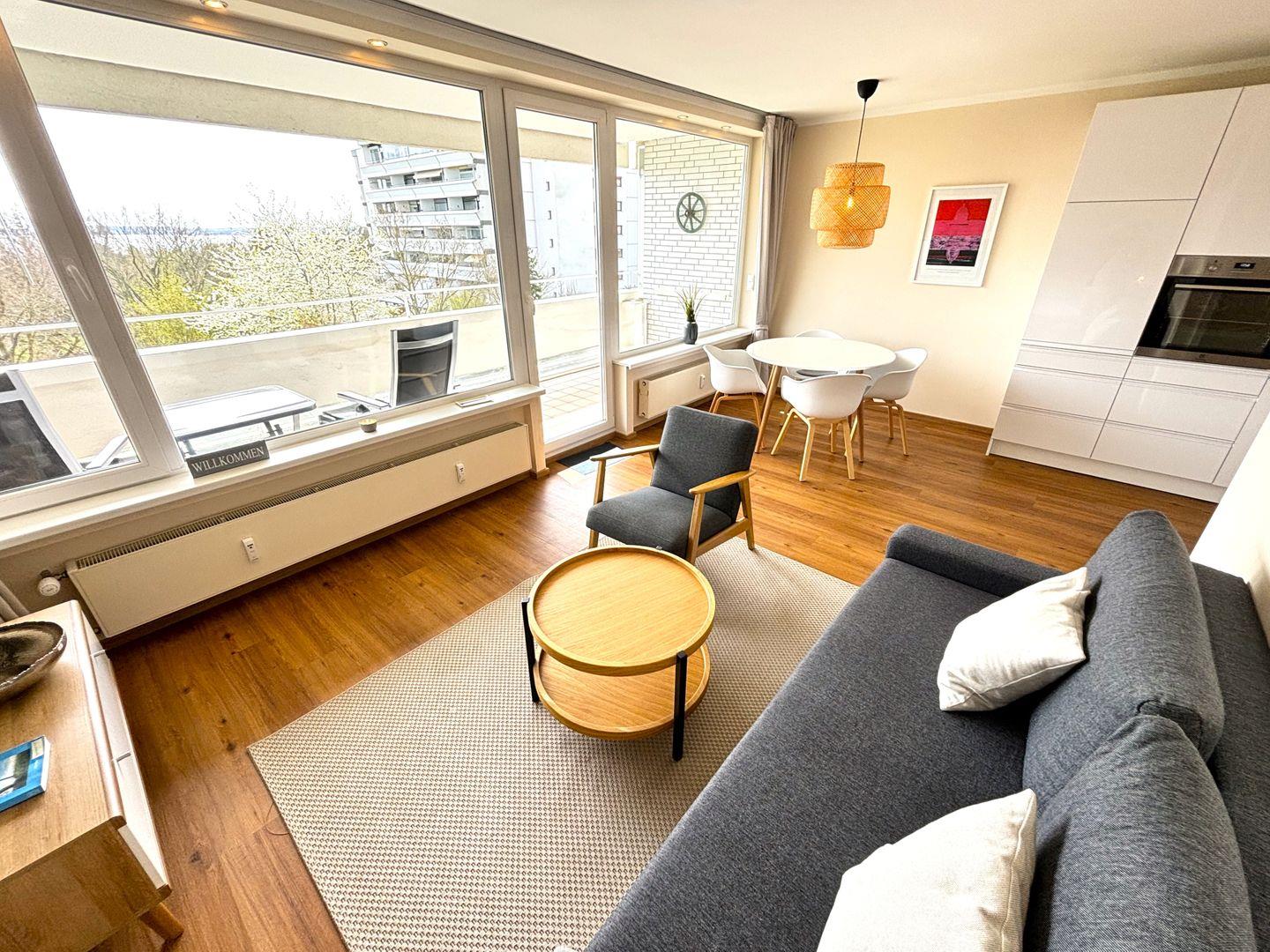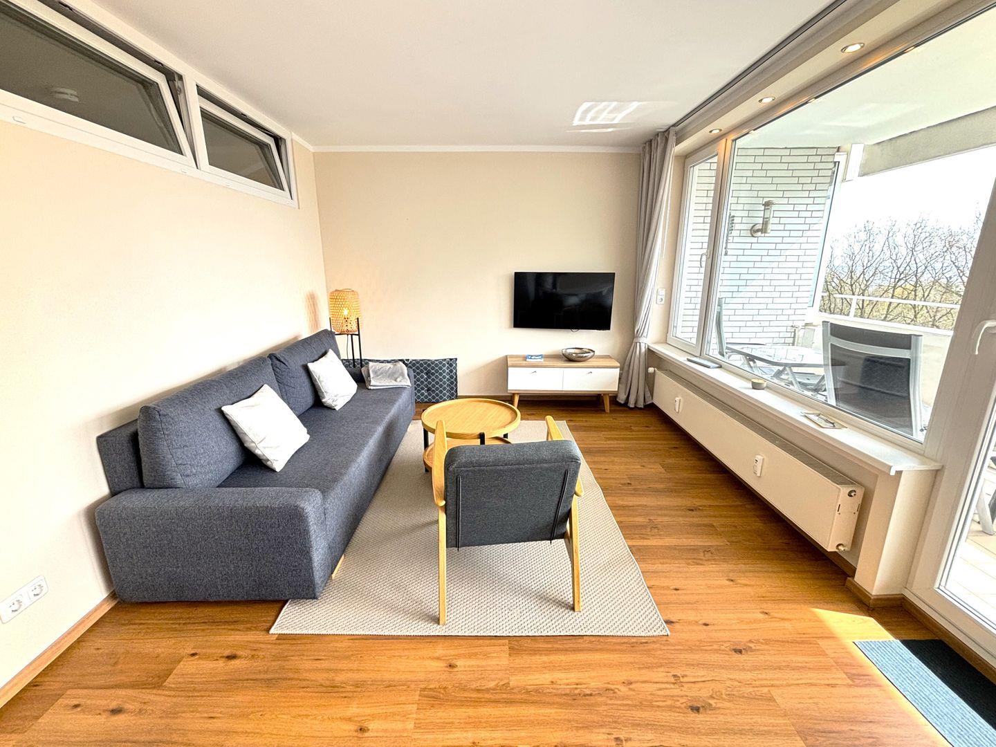Die helle und moderne Ferienwohnung liegt in der 4. Etage und ist für 4 Personen geeignet. Vom kombinierten Wohn- und Essbereich mit offener Küche haben Sie Zugang zum Balkon. Die Küche verfügt über Backofen, Herd und Spülmaschine. Der Schlafraum ist mit einem Doppelbett (160 x 200 cm) ausgestattet. Zudem steht ein Schlafsofa (140 x 190 cm) im Wohnbereich. Das innenliegende Bad verfügt über eine Dusche. Zum Strand sind es nur wenige Gehminunten.