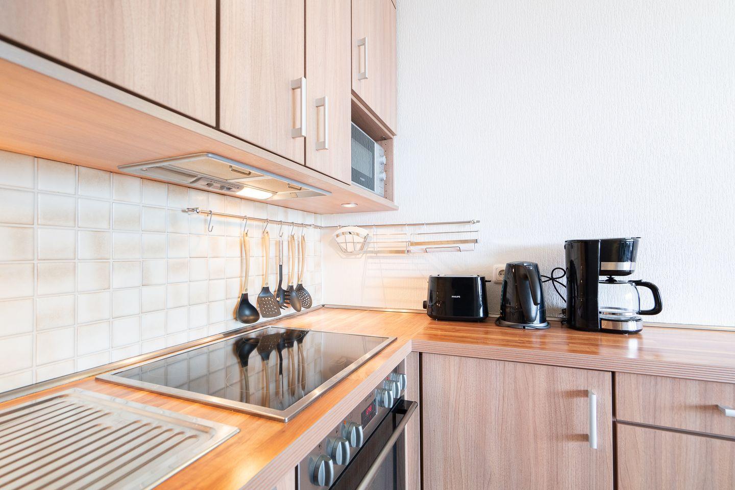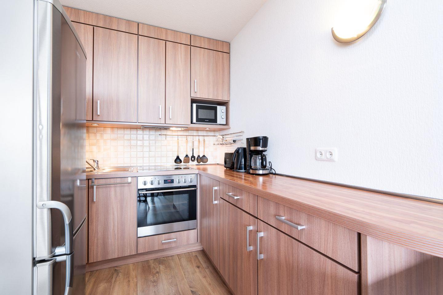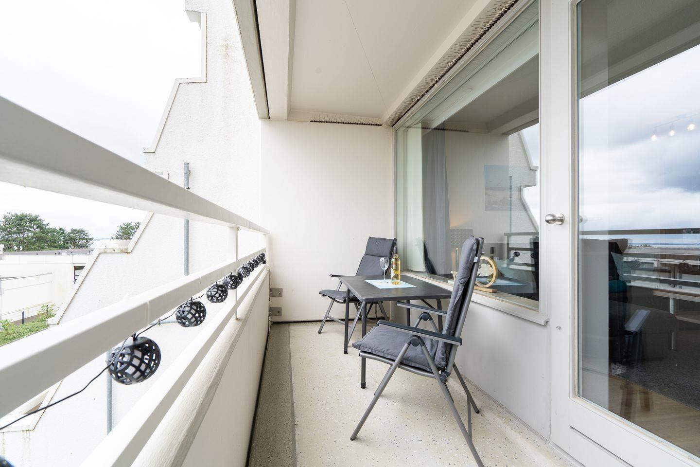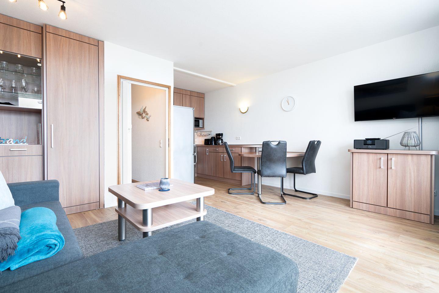 Zeit für Meer - Die schöne 2-Raum-Ferienwohnung Nr. 491 liegt im 1. Stock eines Hochhauses. Vom kombinierten Wohn- und Essbereich haben Sie Zugang zum Balkon, von hier haben Sie über andere Häuser hinweg Blick auf die Ostsee. Die Küche ist mit Backofen und Herd ausgestattet und ist in den Wohn- und Essbereich integriert. Im Schlafraum steht ein komfortables Doppelbett. Das moderne Bad hat eine bodentiefe Dusche und ist innenliegend. Zum Strand sind es nur wenige Fußschritte. WLAN inklusive.