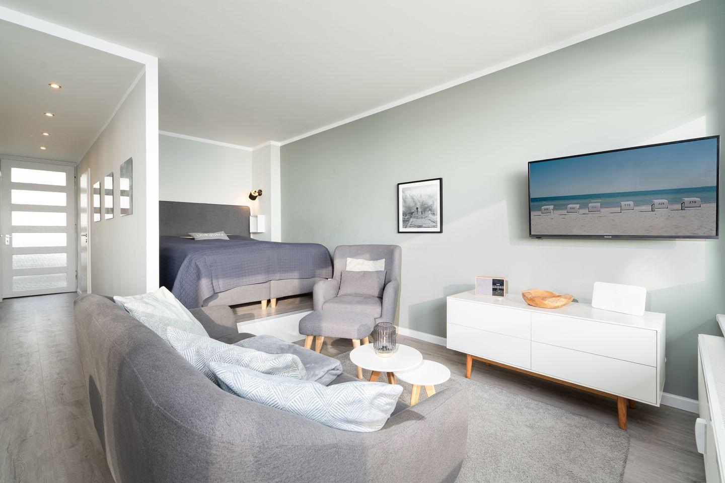 Die schöne 3-Raum-Wohnung Nr. 088 liegt in der 1. Reihe der Flachbauten und hat somit einen herrlichen Blick auf die Ostsee. Der gemütliche und stimmig eingerichtete Wohn- /Essbereich mit bequemen Doppelbett lädt zum entspannten Urlaub ein. Die offene Küche ist mit Spülmaschine, Backofen und Herd ausgestattet. Im Schlafzimmer stehen zwei Einzelbetten, Ankleidezimmer separat. Das hell geflieste Bad mit bodentiefer Dusche ist innenliegend. Zum Strand sind es nur wenige Fußschritte. WLAN inklusive.