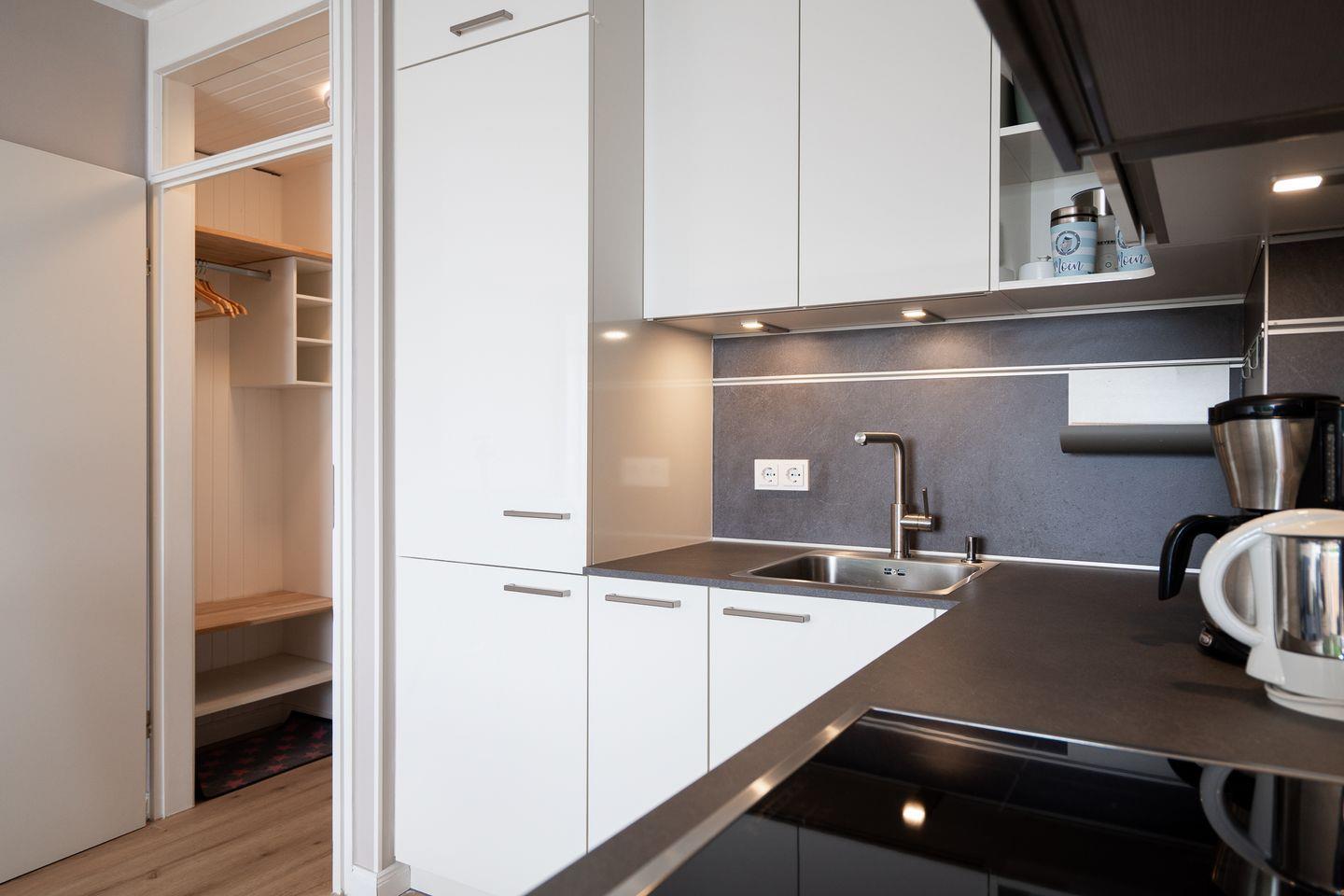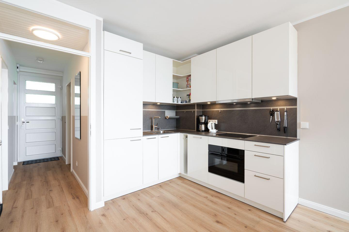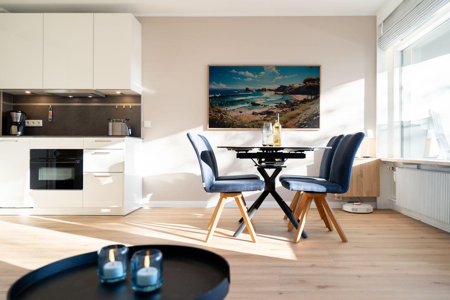 Das lichtdurchflutete Wohnzimmer verfügt über eine hochwertige und komfortable Schlafcouch (ausziehbar, 140 cm x 200 cm), einen Sessel und einen großzügigen Essbereich. Die offene und moderne Küche mit Backofen, Herd und Spülmaschine ist nahtlos ins Wohnkonzept integriert und ist bestens ausgestattet, um sich im Urlaub selbst versorgen zu können
